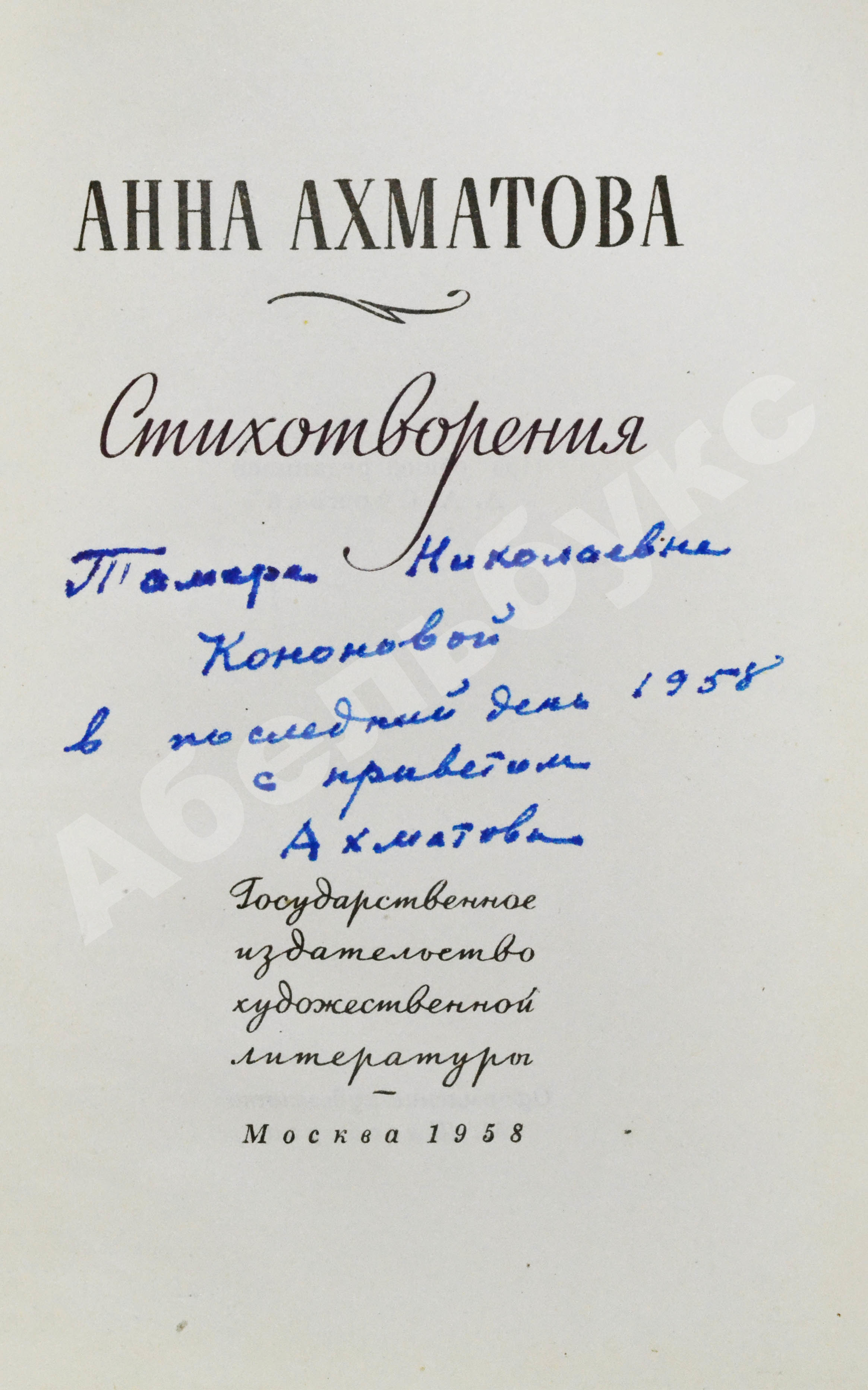На титульном листе автограф Анны Ахматовой: «Тамаре Николаевне Кононовой в последний день 1958 с приветом Ахматова».