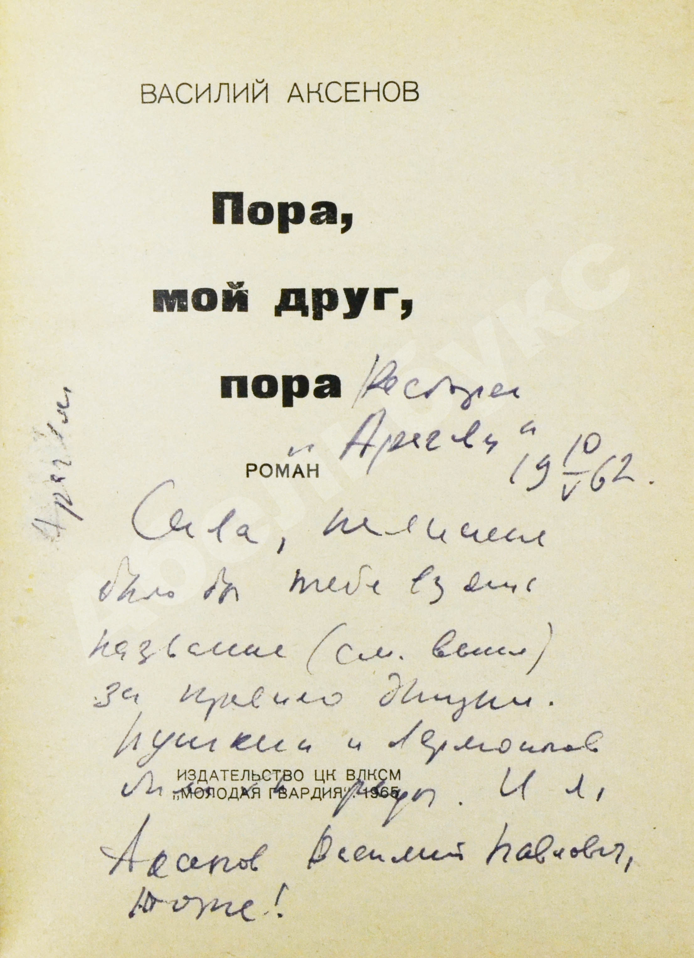 На титульном листе автограф Василия Аксёнова: «Ресторан «Арагви». 10.V.1962. Сева, полезно было бы тебе взять название (см. выше) за правило жизни. Пушкин и Лермонтов были бы рады. И я, Аксёнов Василий Павлович, тоже!»