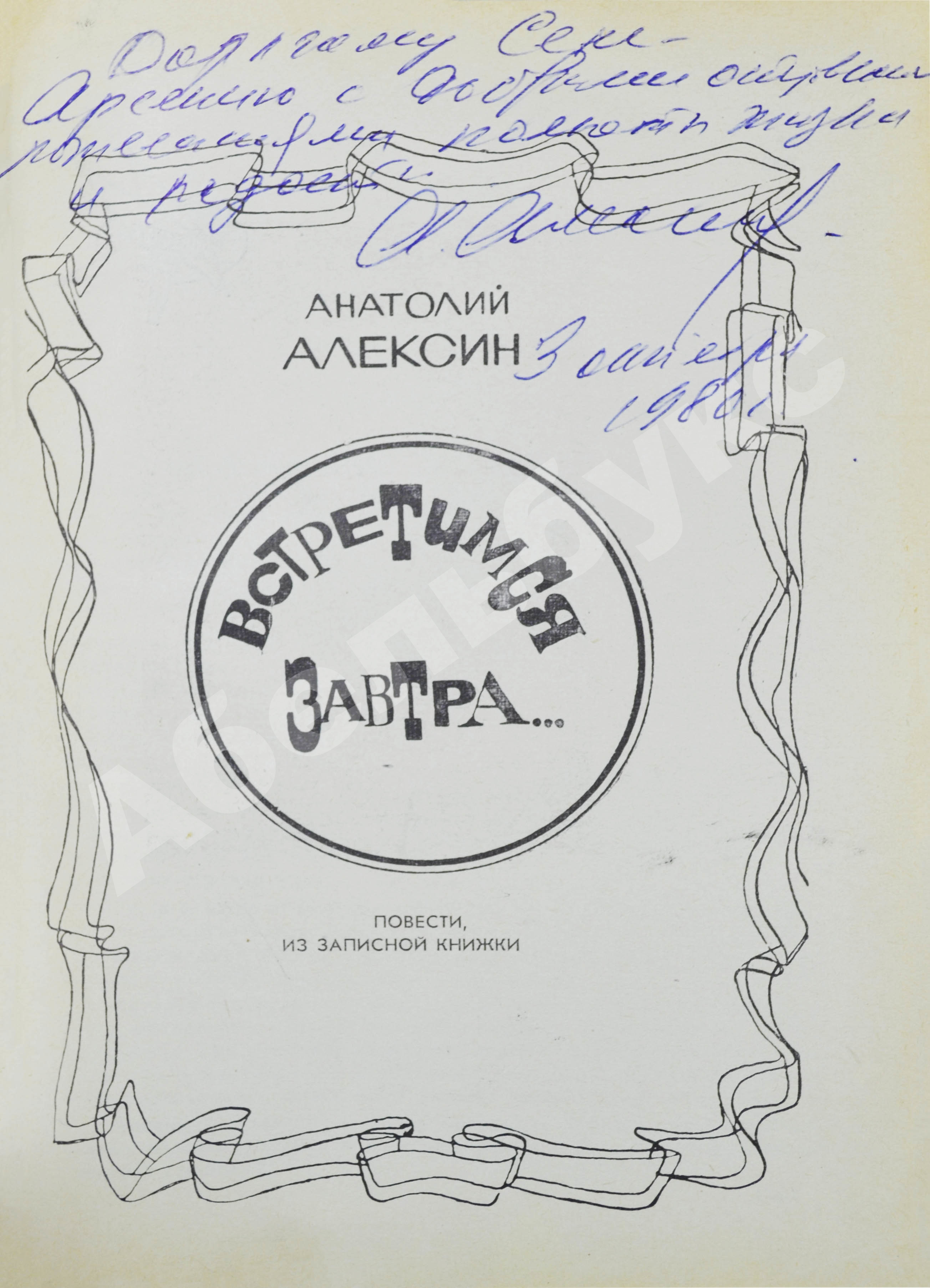 На титульном листе автограф Анатолия Алексина: «Дорогому Сене — Арсению с добрыми отцовскими пожеланиями полноты жизни и радости. А. Алексин 3 апреля 1980 г.».