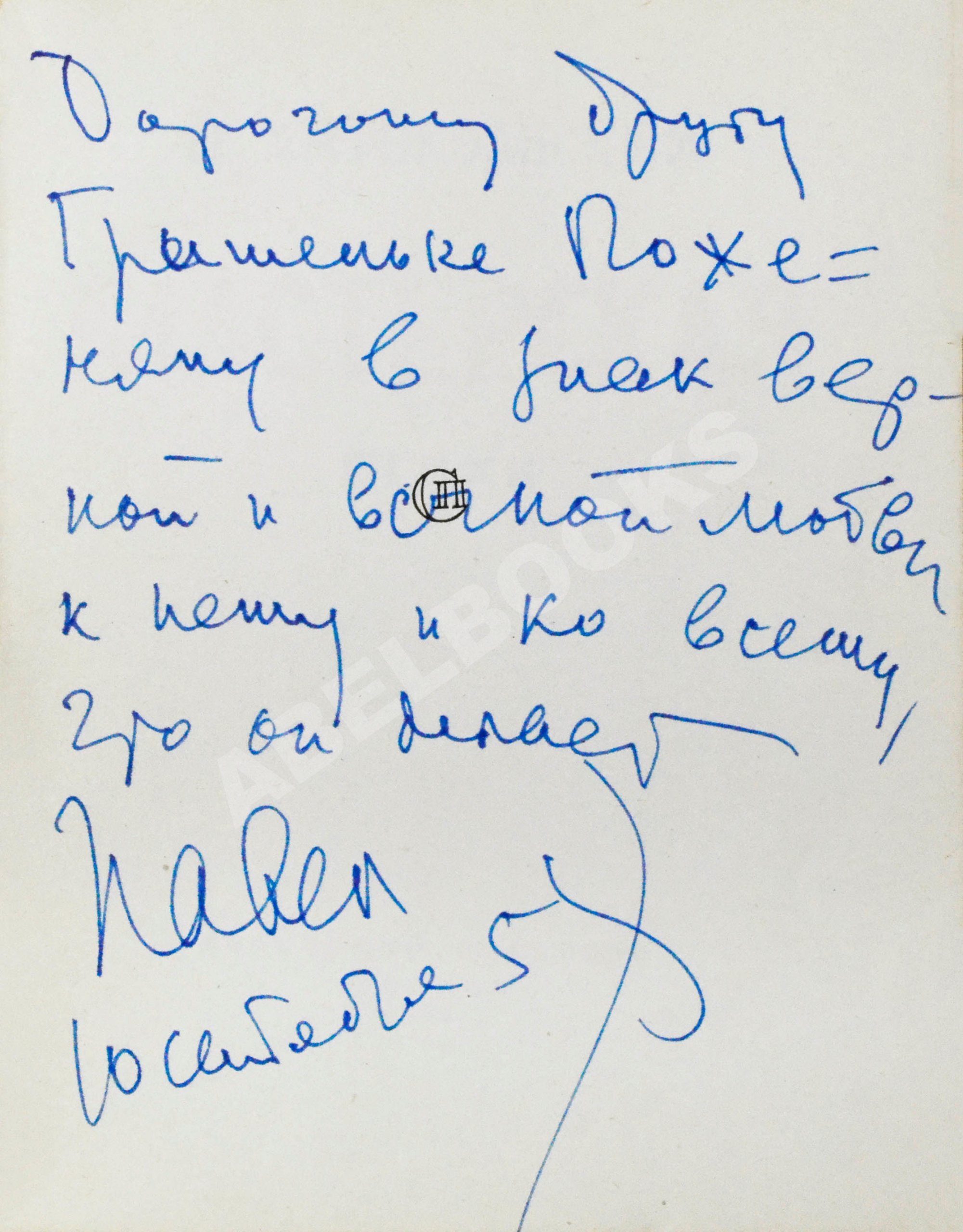 На листе с издательской маркой автограф Павла Антокольского Григорию Поженяну: «Дорогому другу Гришеньке Поженяну в знак верной и вечной любви к нему и ко всему, что он делает Павел 10 сентября 58».