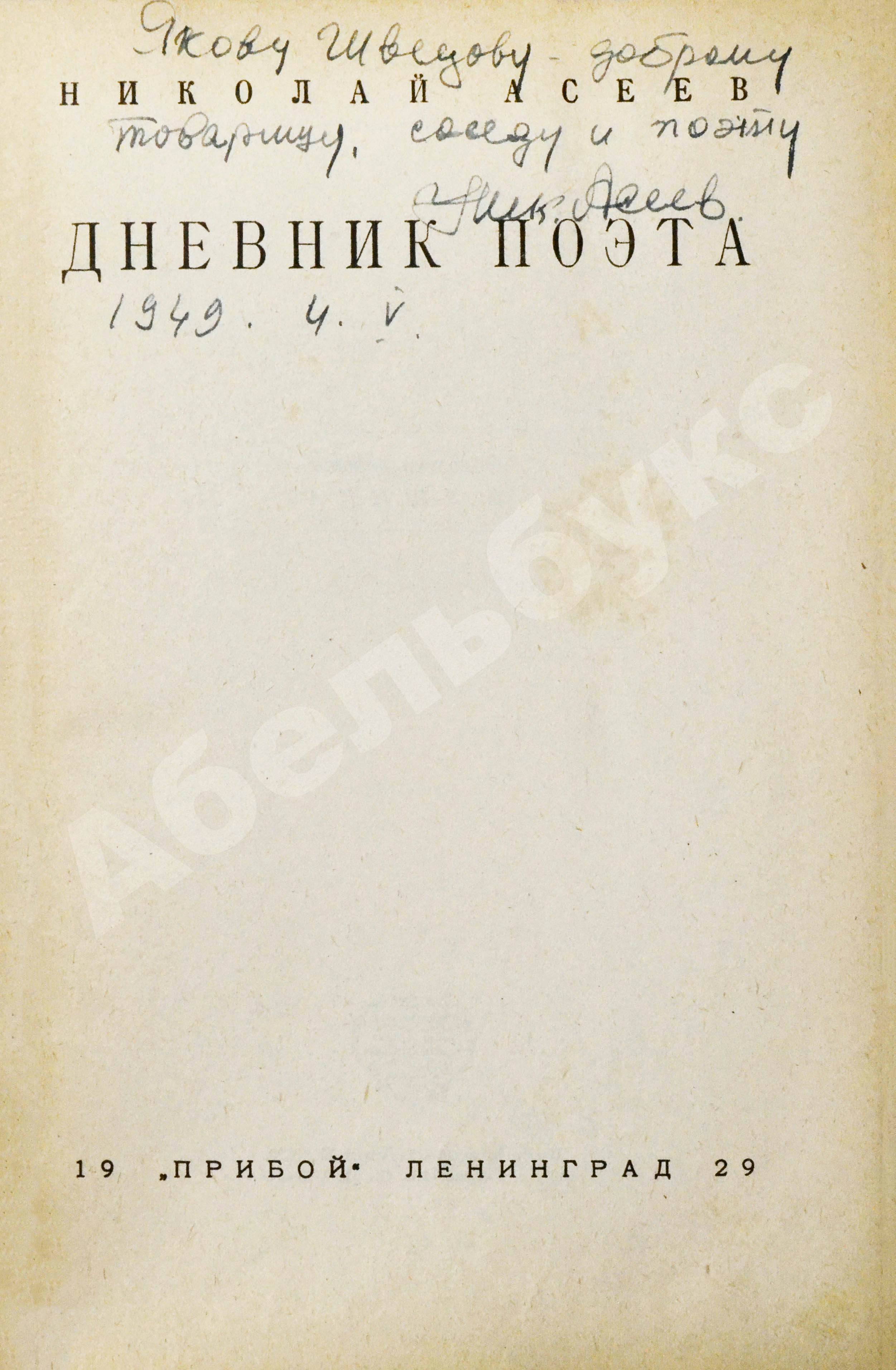 На титульном листе автограф Николая Асеева: «Якову Шведову — доброму товарищу, соседу и поэту Ник. Асеев 1949.4.V».