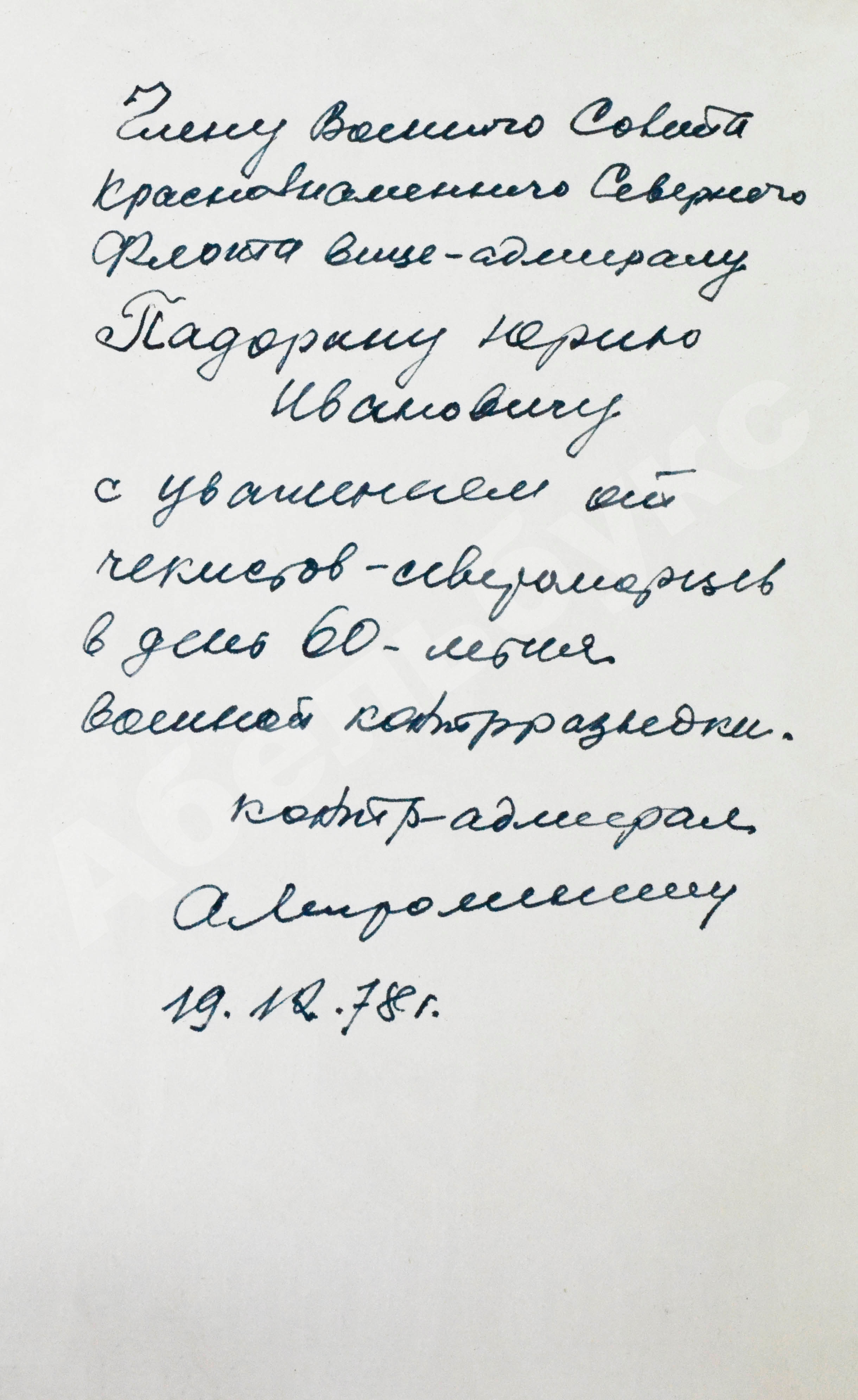 На обороте свободного листа форзаца автограф: «Члену Военного Совета Краснознаменного Северного Флота вице-адмиралу Падорину Юрию Ивановичу с уважением от чекистов-североморцев в день 60-летия военной контрразведки. Контр-адмирал А. Мирошниченко 19.12.78 г.».