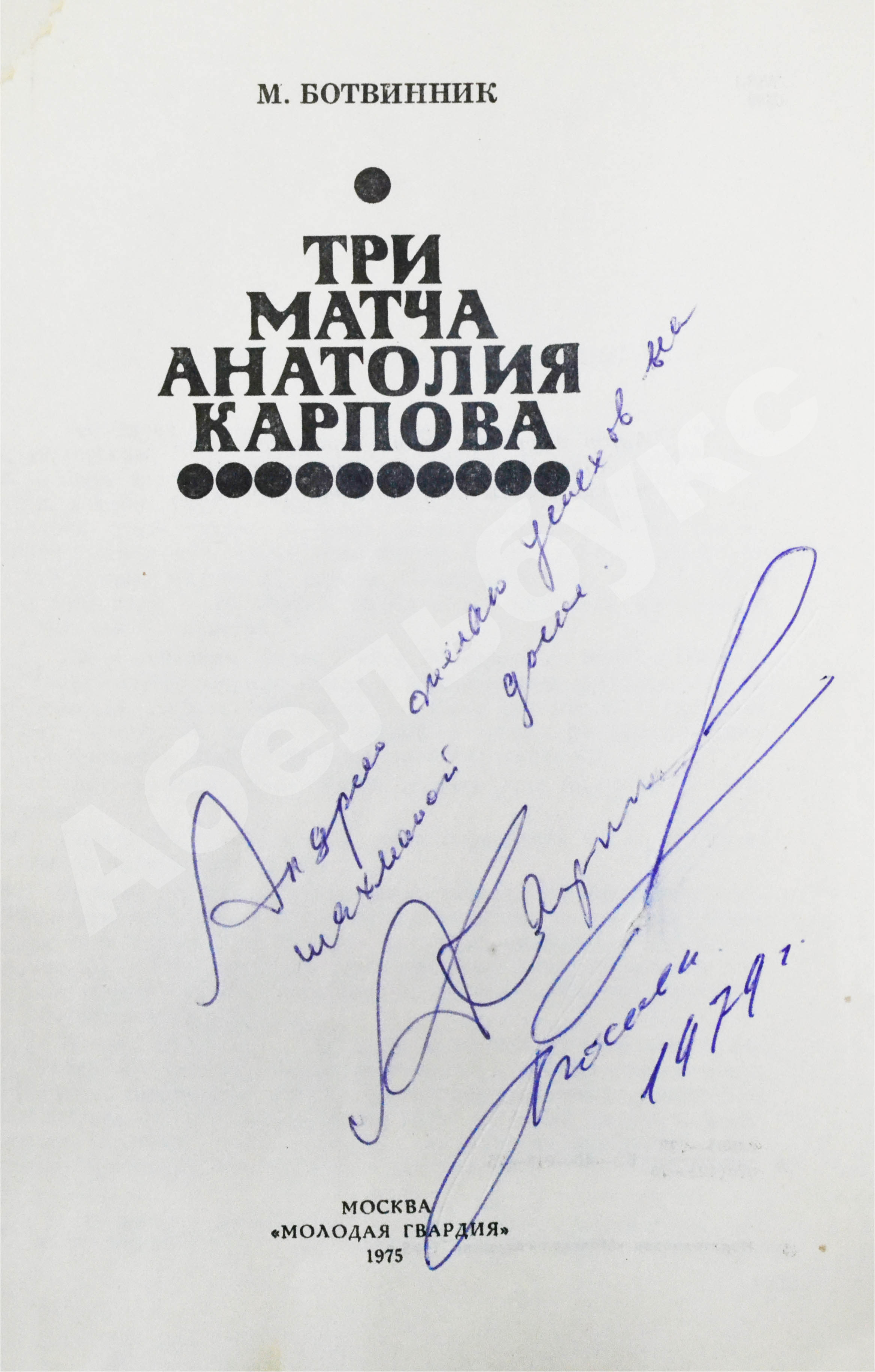 На титульном листе автограф Анатолия Карпова: «Андрею желаю успехов на шахматной доске. А Карпов 1979 г.».