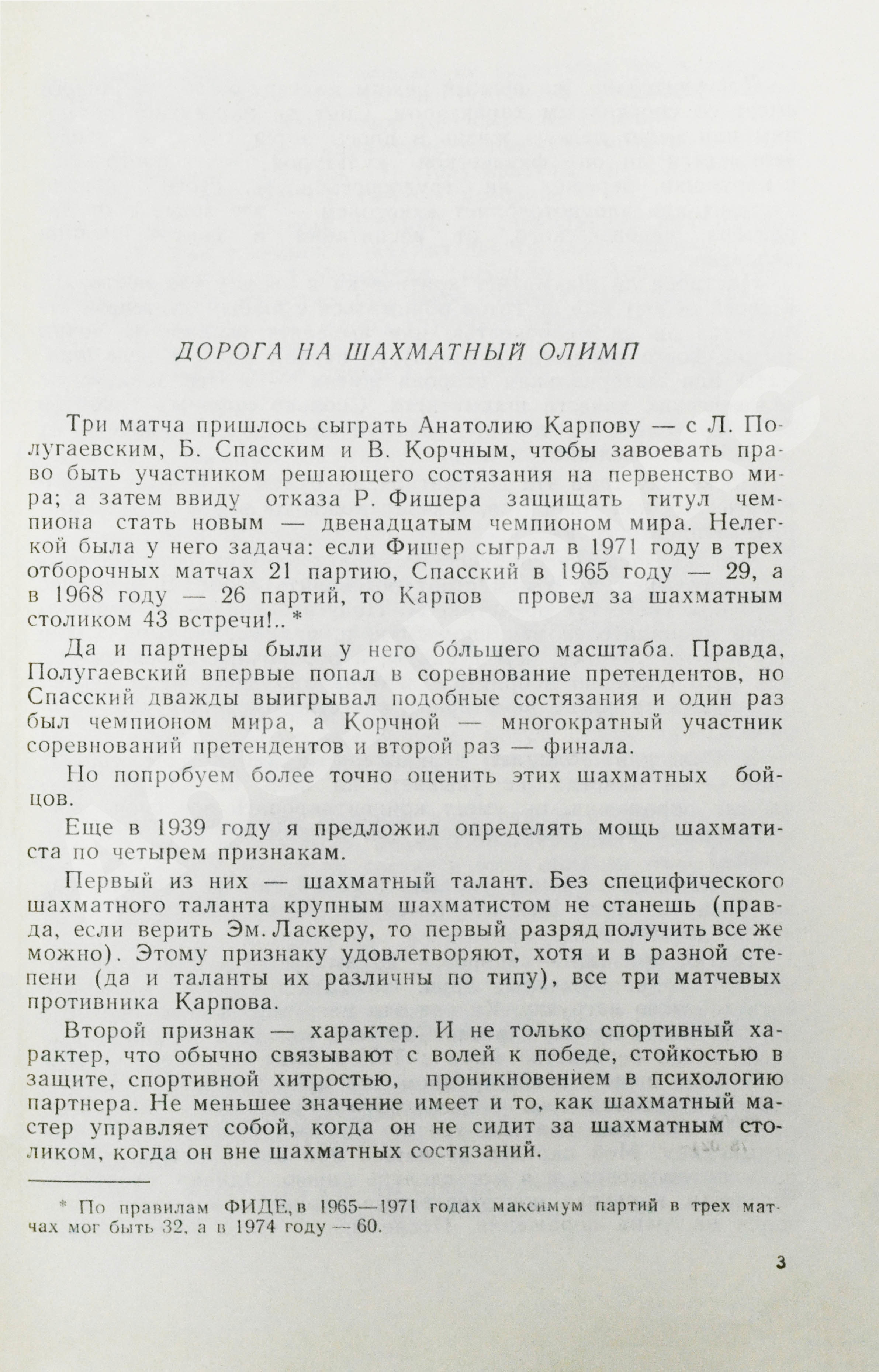 Сыграв в четверть финале со Львом Полугаевским (8 партий), полуфинале с 10-м чемпионом мира Борисом Спасским (11 партий) и финале с Виктором Корчным (24 партии), Карпов завоевал право участвовать в решающем состязании за первенство мира, но действующий на тот момент чемпион, эксцентричный Бобби Фишер, отказался защищать свой титул. Во вступительной статье рассказывается о пути Анатолия Карпова к высшей шахматной награде, его шансах на победу в титульном мачте и скандальной ситуации с Робертом Фишером.