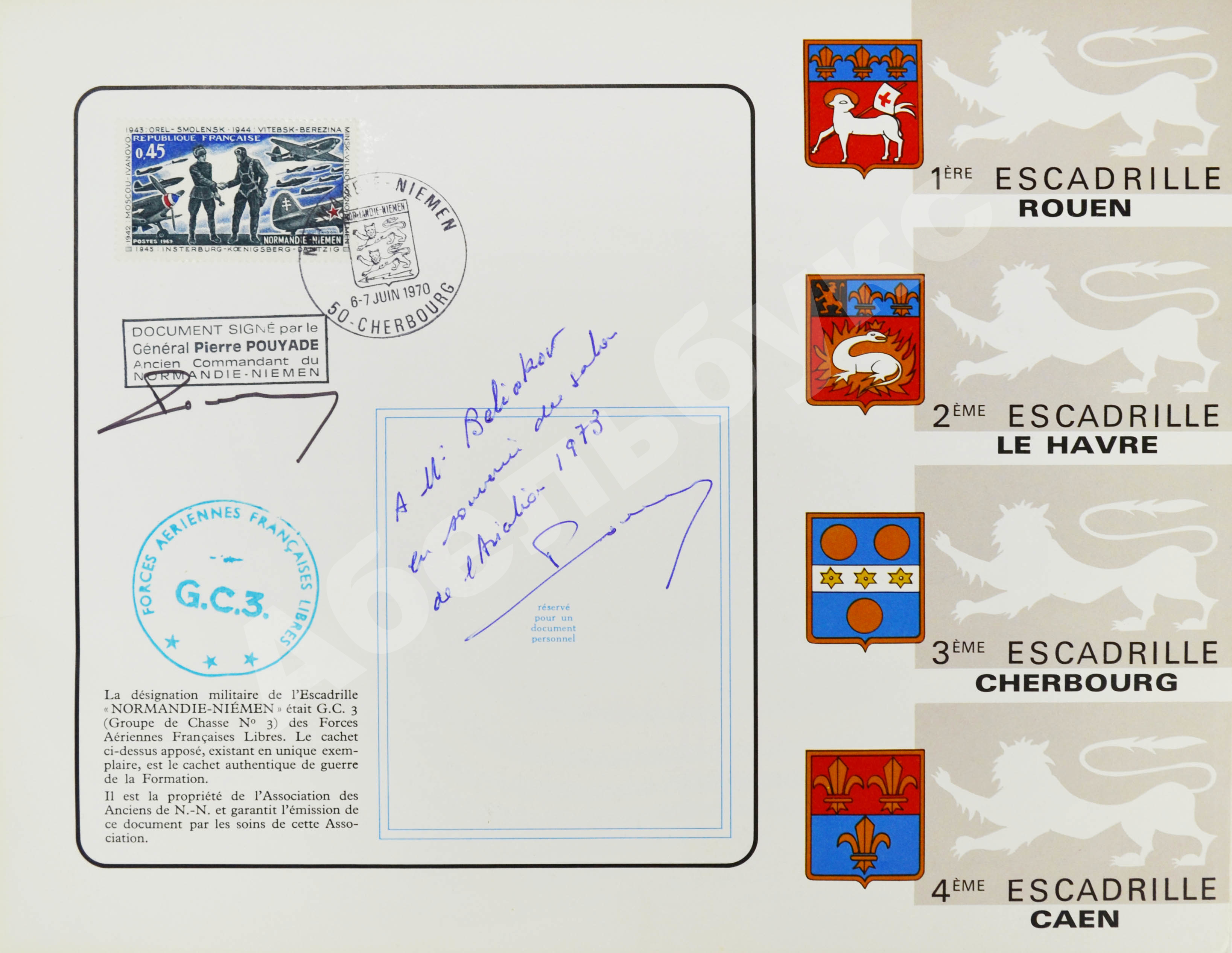 На С.1 автограф командира полка Нормандия-Неман, генерала ВВС Франции Пьера Пуйяда; юбилейная марка и печать.