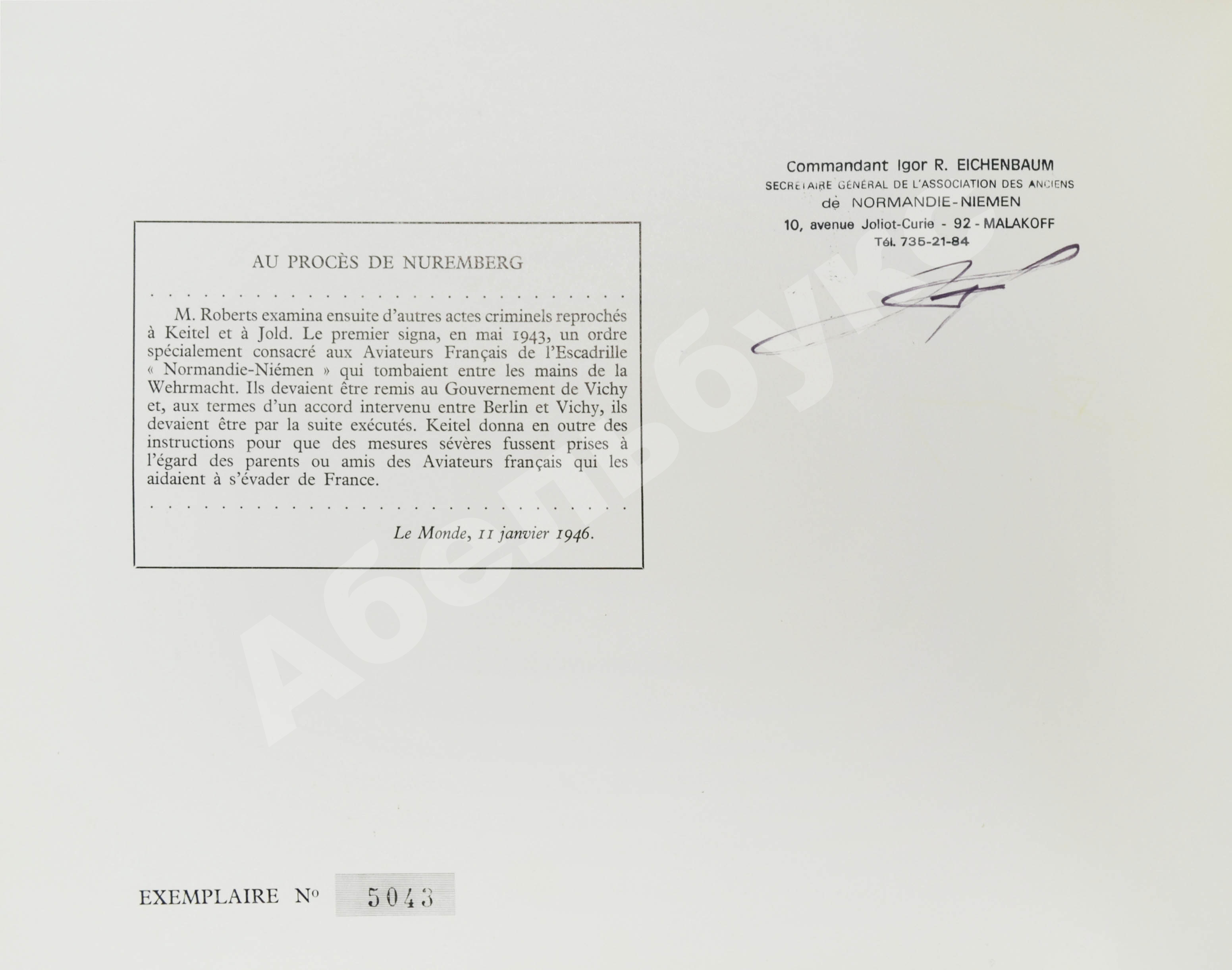 Нумерованный экземпляр №5043 с подписью секретаря ассоциации ветеранов «Нормандии-Неман» Игоря Всеволодовича Эйхенбаума.