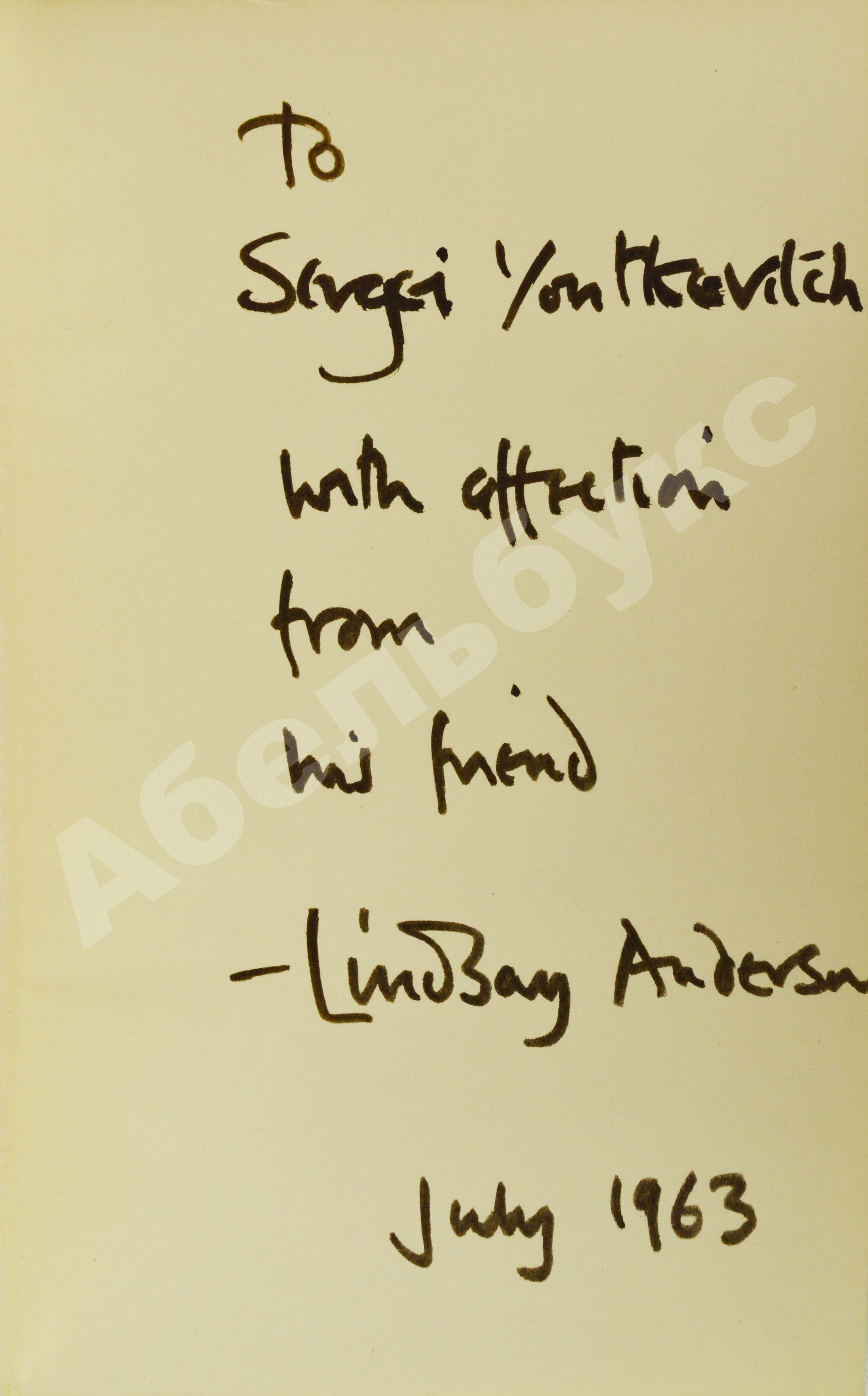 На свободном листе форзаца автограф Линдсея Андерсона Сергею Юткевичу: «To Sergei Youtkevitch with affection from his friend Lindsay Anderson. July 1963».