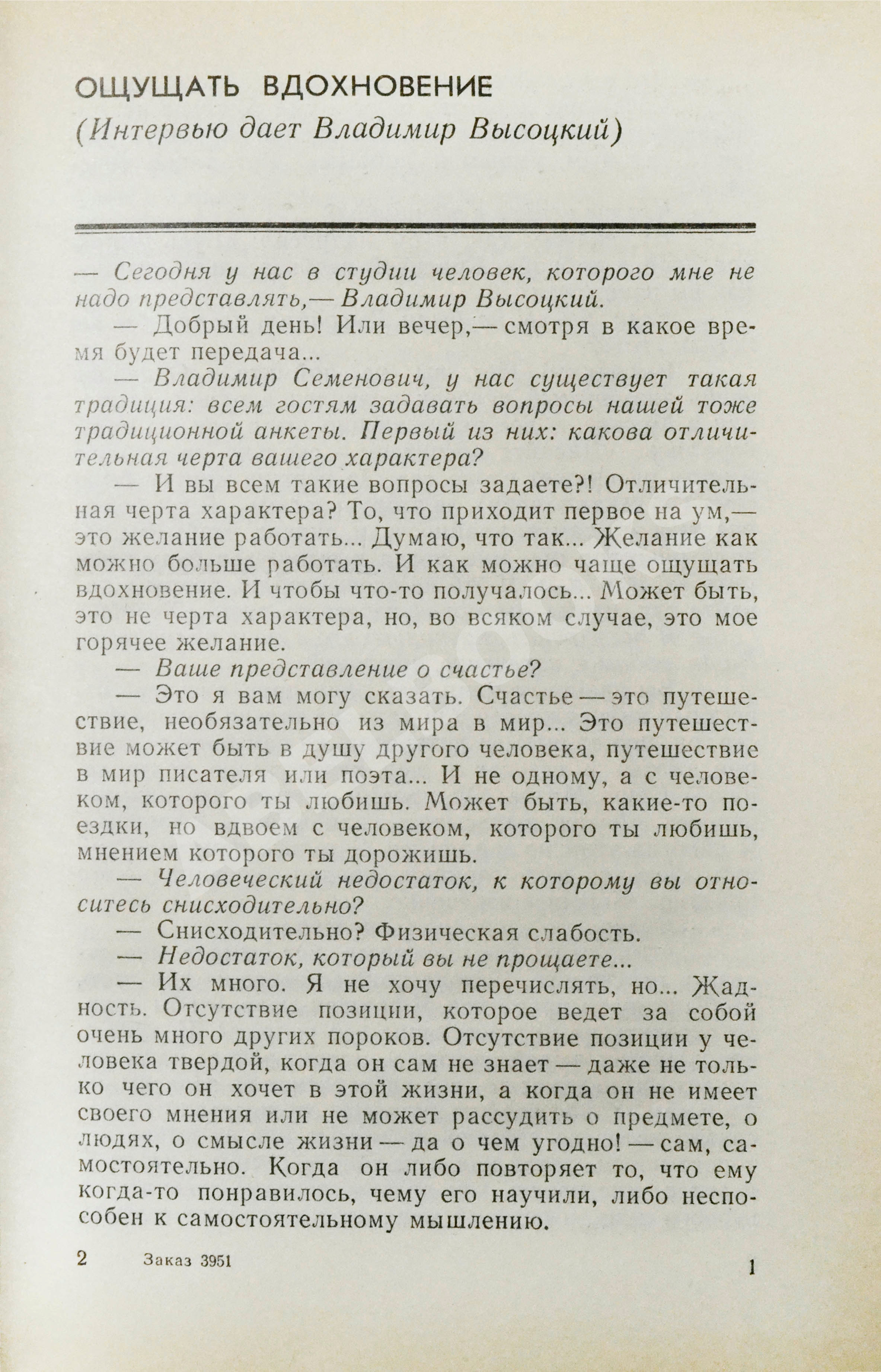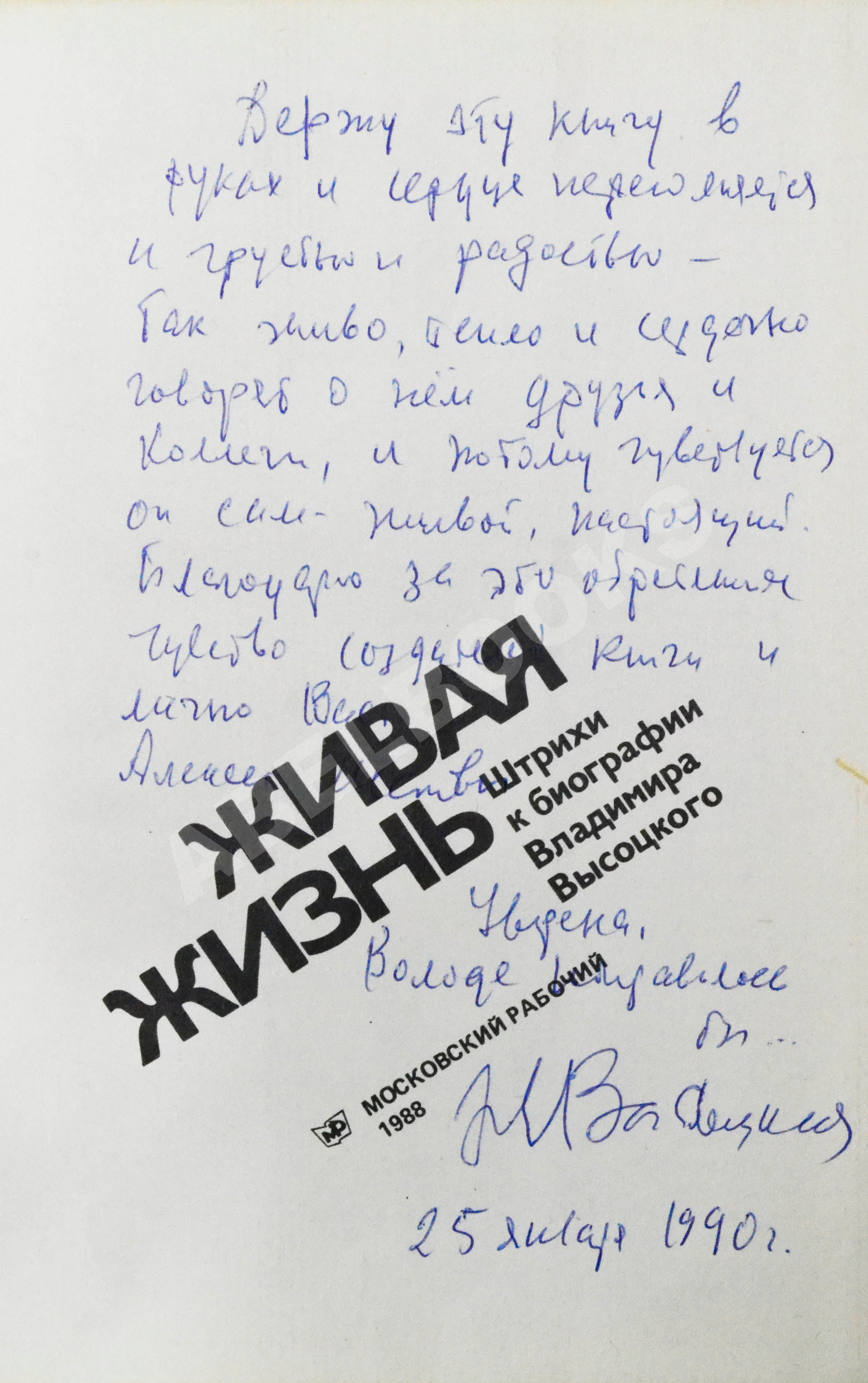 На титульном листе автограф Нины Высоцкой: «Держу эту книгу в руках и сердце переполняется и грустью и радостью — так живо, тепло и сердечно говорят о нём друзья и коллеги, и потому чувствуется он сам — живой, настоящий. Благодарю за это обретенное чувство созданной книги и лично Вас, Алексей Иванович Уверена, Володе понравилось бы… НВысоцкая 25 января 1990 г.».