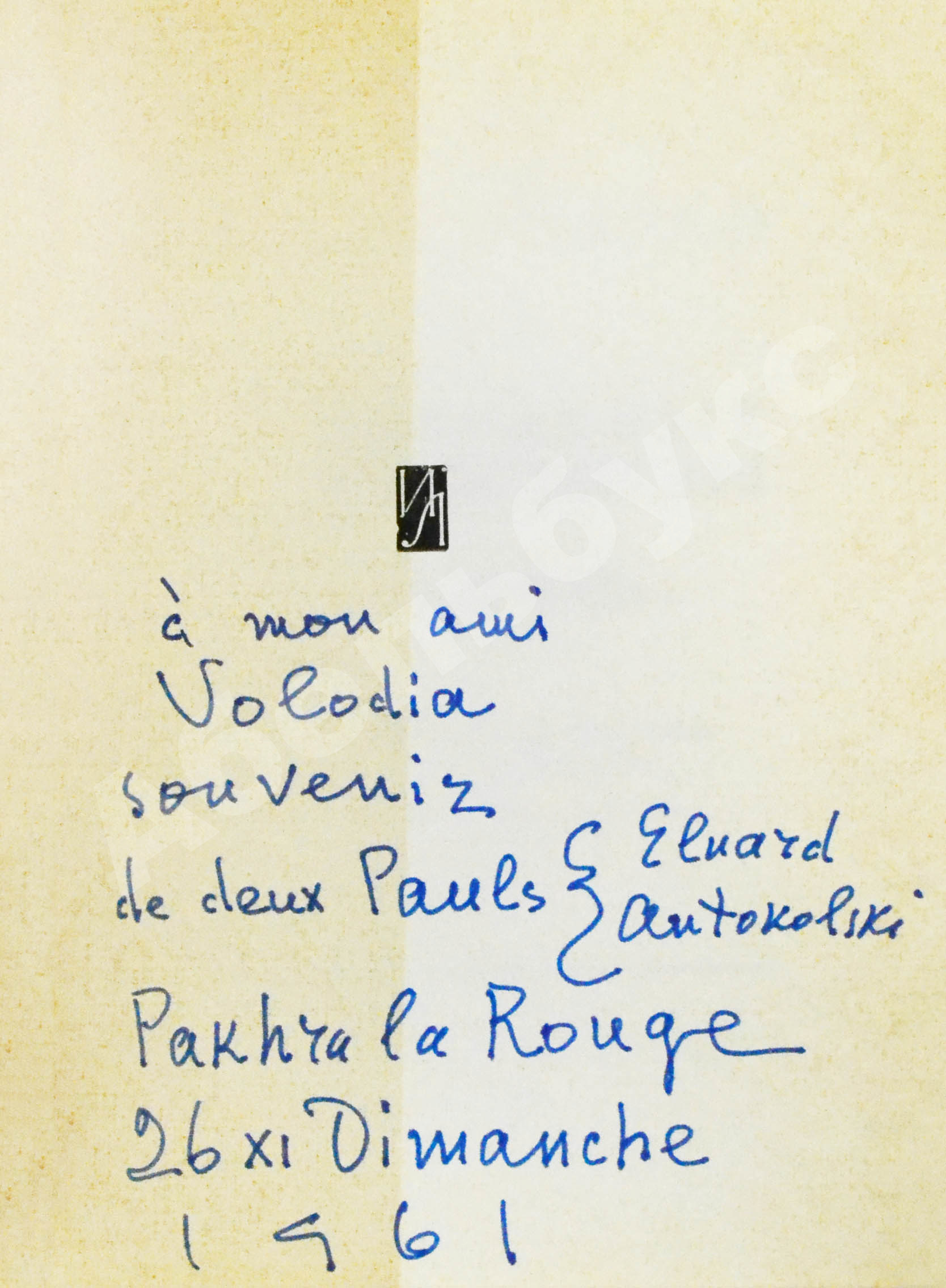 На стр.1 автограф Павла Антокольского на французском языке: «a mon ami Volodia souvenir de deux Pauls Eluard Antokolski Pakhru la Rouge / 26 XI Dimanche 1961». («моему другу Володе на память о двух Полях (Элюар, Антокольский). Красная Пахра, 26 XI Воскресенье 1961»).