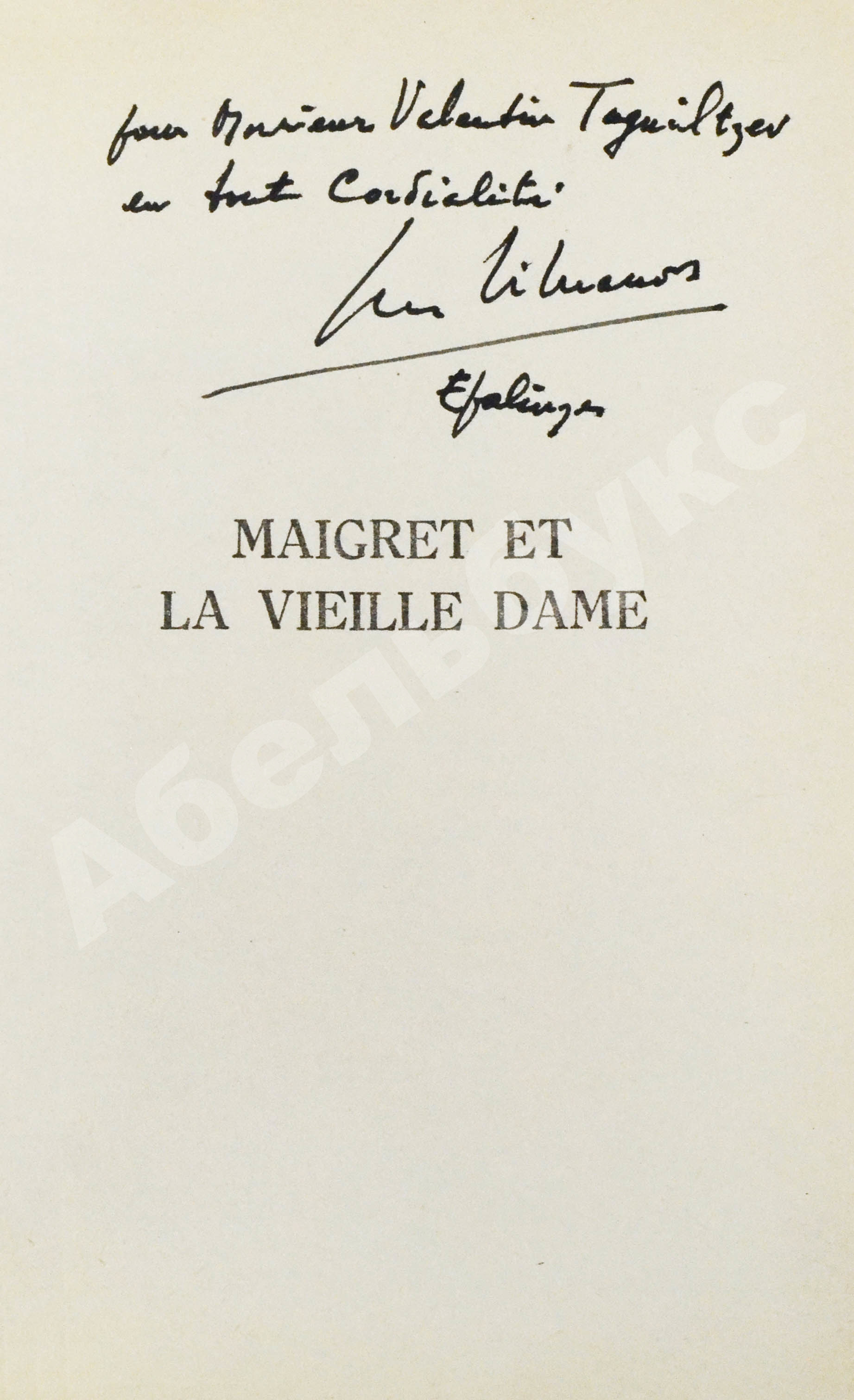 На авантитуле автограф Жоржа Сименона: «Pour monsieur Valentin Taguiltzev en tout cordialité G. Simenon Epalinges». [Месье Валентину Тагильцеву со всей сердечностью Ж. Сименон Эпаленж].