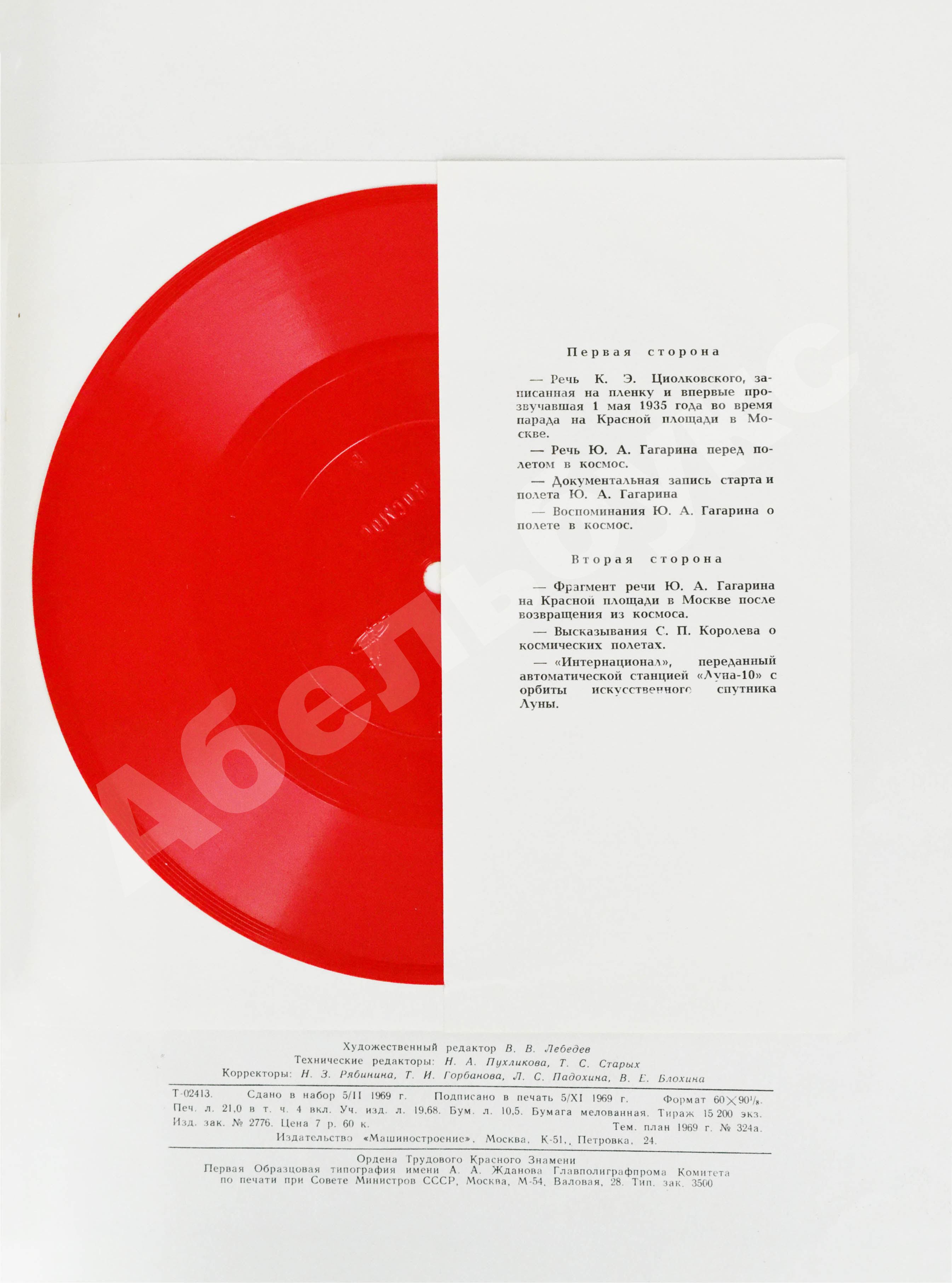 К альбому прилагается пластинка, на которой записаны: речь Константина Циолковского (1935), речь Юрия Гагарина перед полётом и воспоминания о нём, запись старта полёта, выступление Гагарина на Красной площади, слова Сергея Королёва о покорении космоса и «Интернационал», переданный с орбиты станцией «Луна-10».