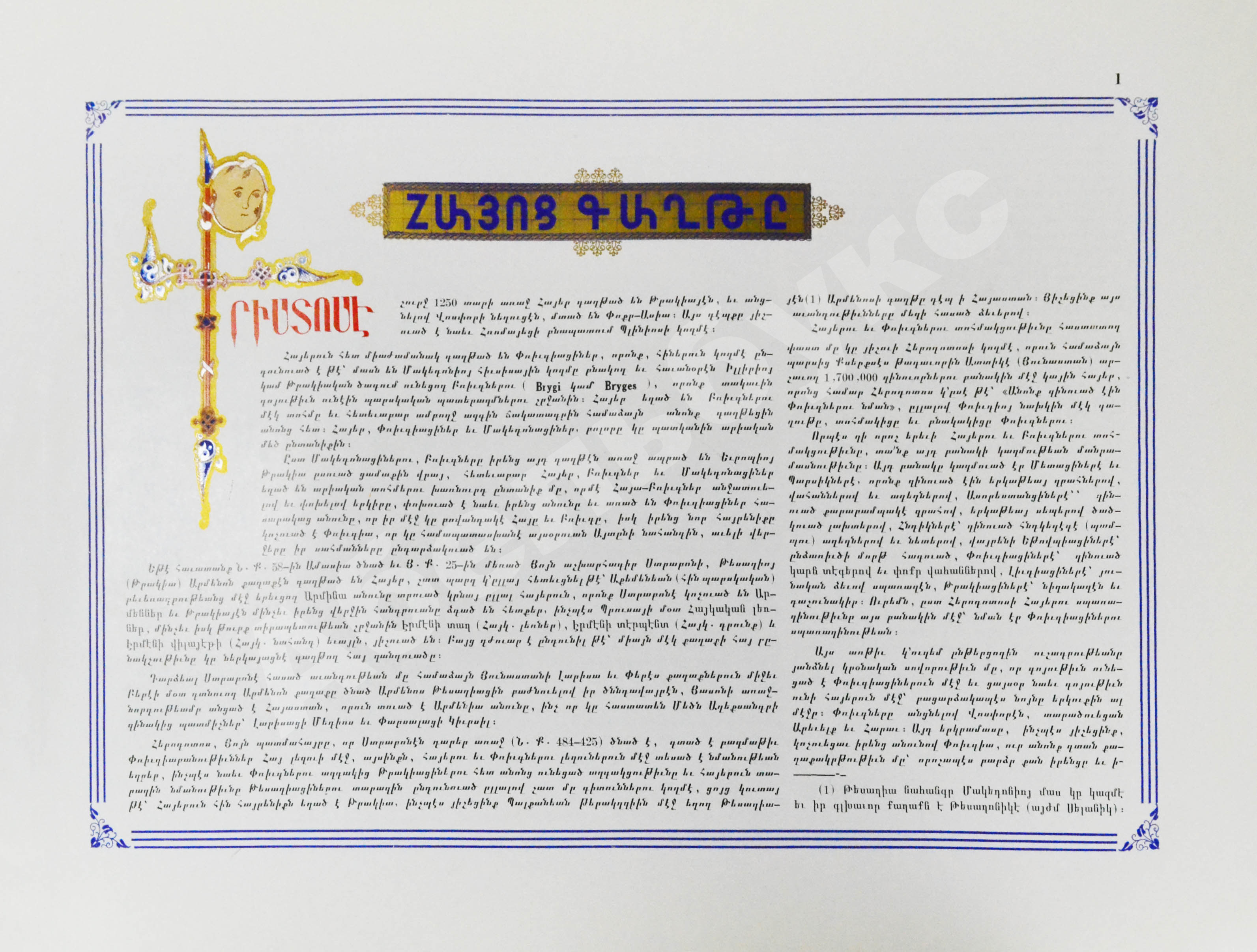 Беспрецедентный проект армянского историка и картографа Ованеса Бабессяна, рассчитанный на армян, особенно на семьи с детьми, оторванных от корней, то есть проживающих вдали от исторической родины. Обзор истории, культуры, географии Армении в роскошном полиграфическом исполнении. Книга представляет собой культурный артефакт, выступая реальным воплощением в жизнь идеи преемственности национальных ценностей и защиты исторической правды. Шедевр полиграфического искусства.