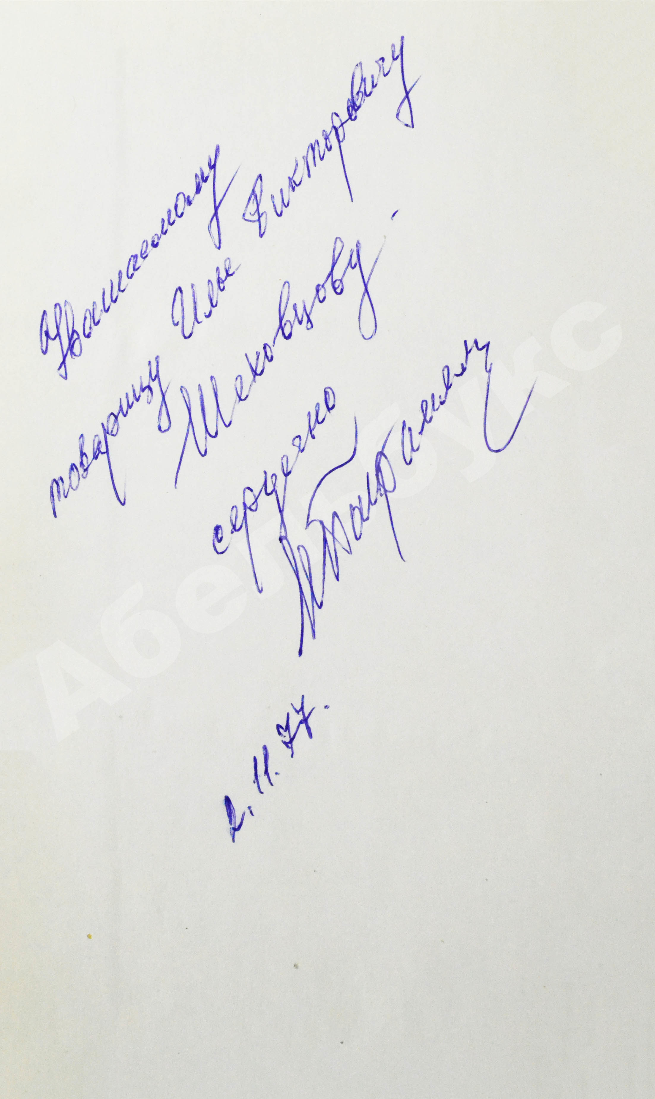 На свободном листе форзаца автограф маршала СССР Ивана Баграмяна: «Уважаемому товарищу Илье Викторовичу Шековцову сердечно И Баграмян 2.11.77.».