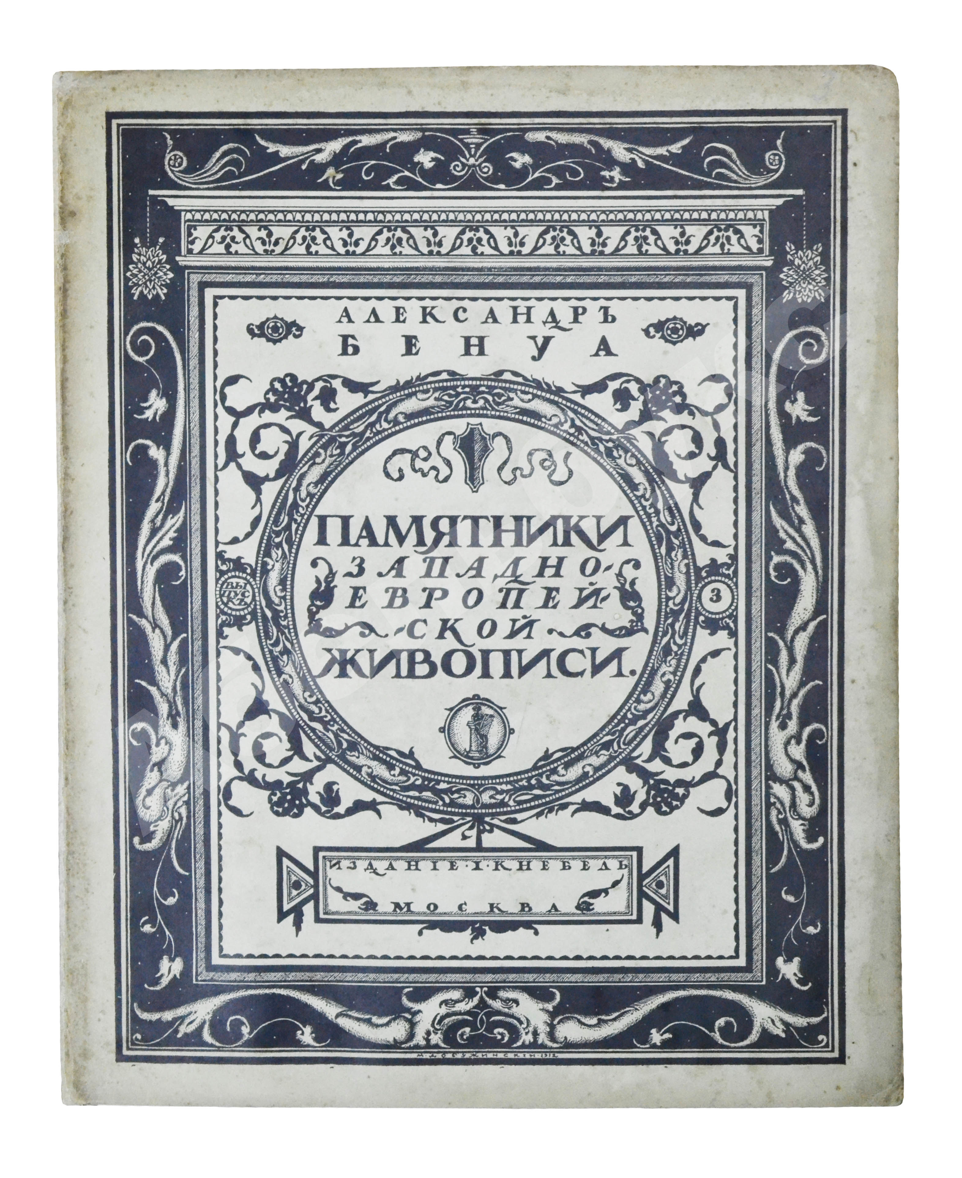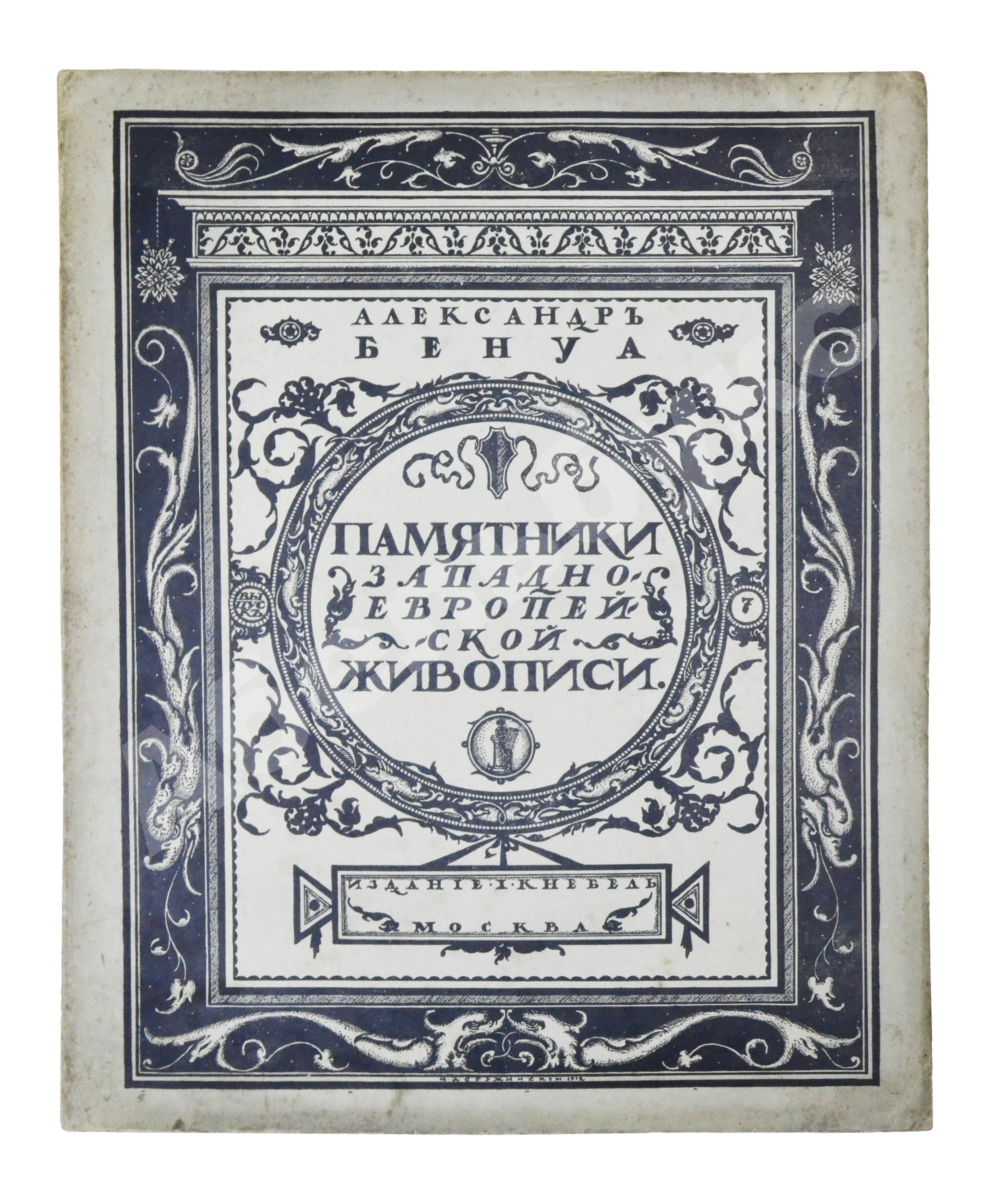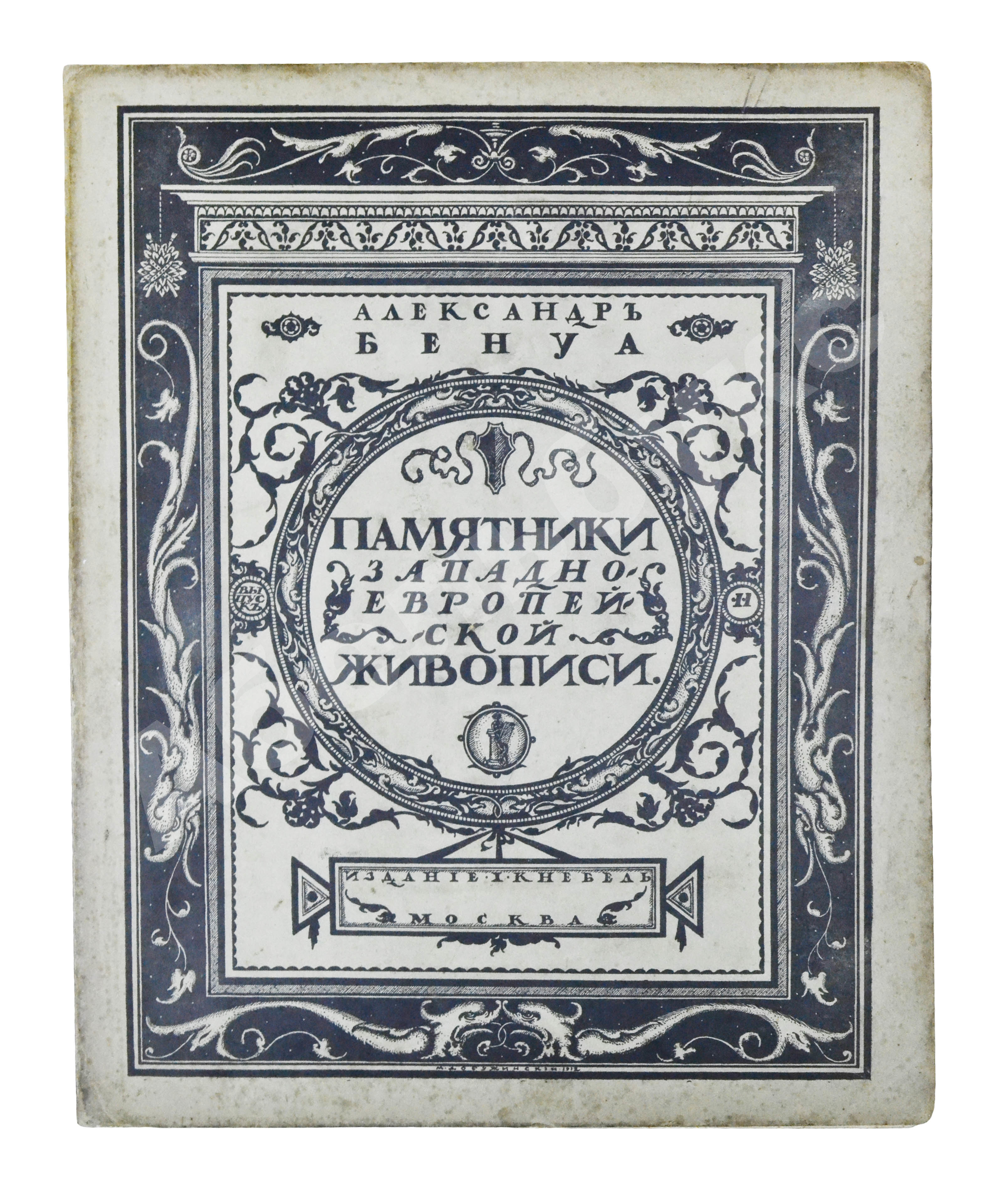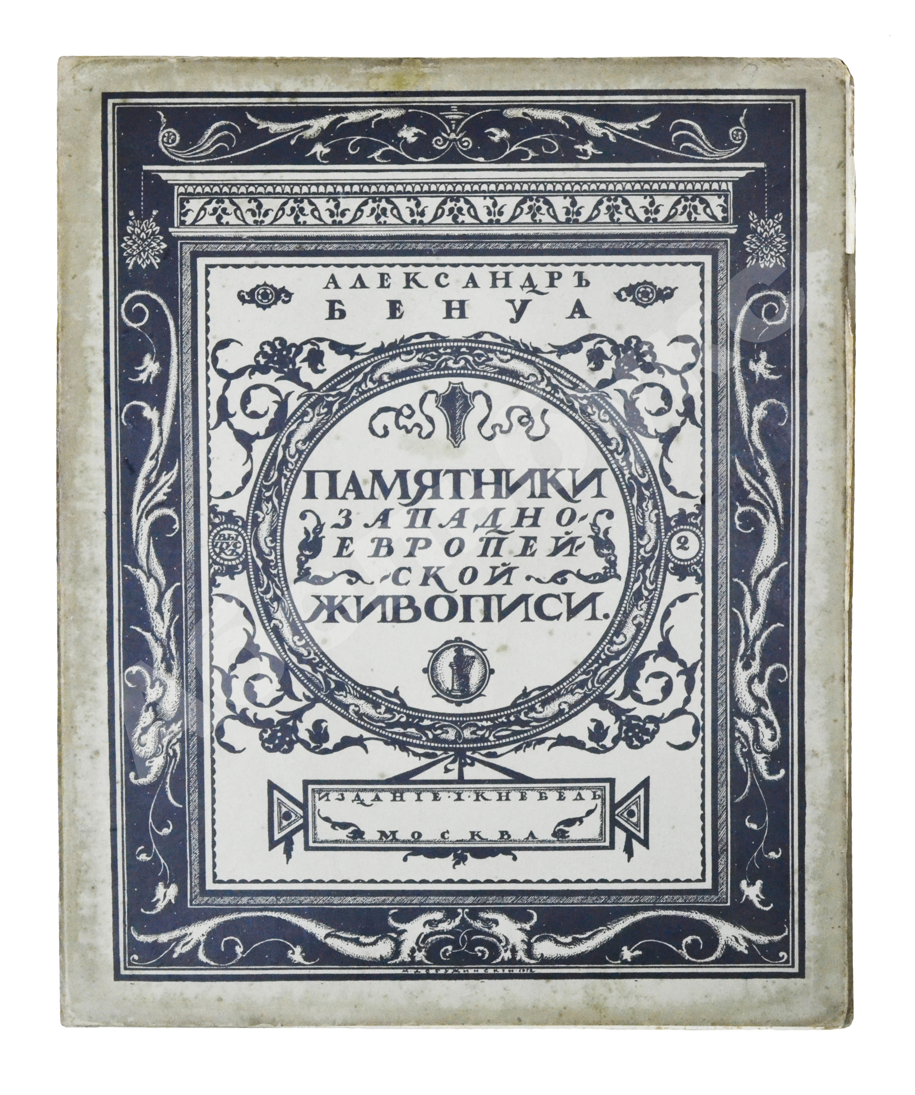 Рисунок на обложку «Памятников…» создал Мстислав Валерианович Добужинский (1875–1957), художник книги и блестящий театральный декоратор. С объединением «Мир искусства», душой которого был Бенуа, Добужинский сблизился в 1901 году. Бенуа значительно повлиял на графический стиль молодого художника, кроме того, их объединяла любовь к старине, классической живописи и коллекционирование старинных гравюр и картин.