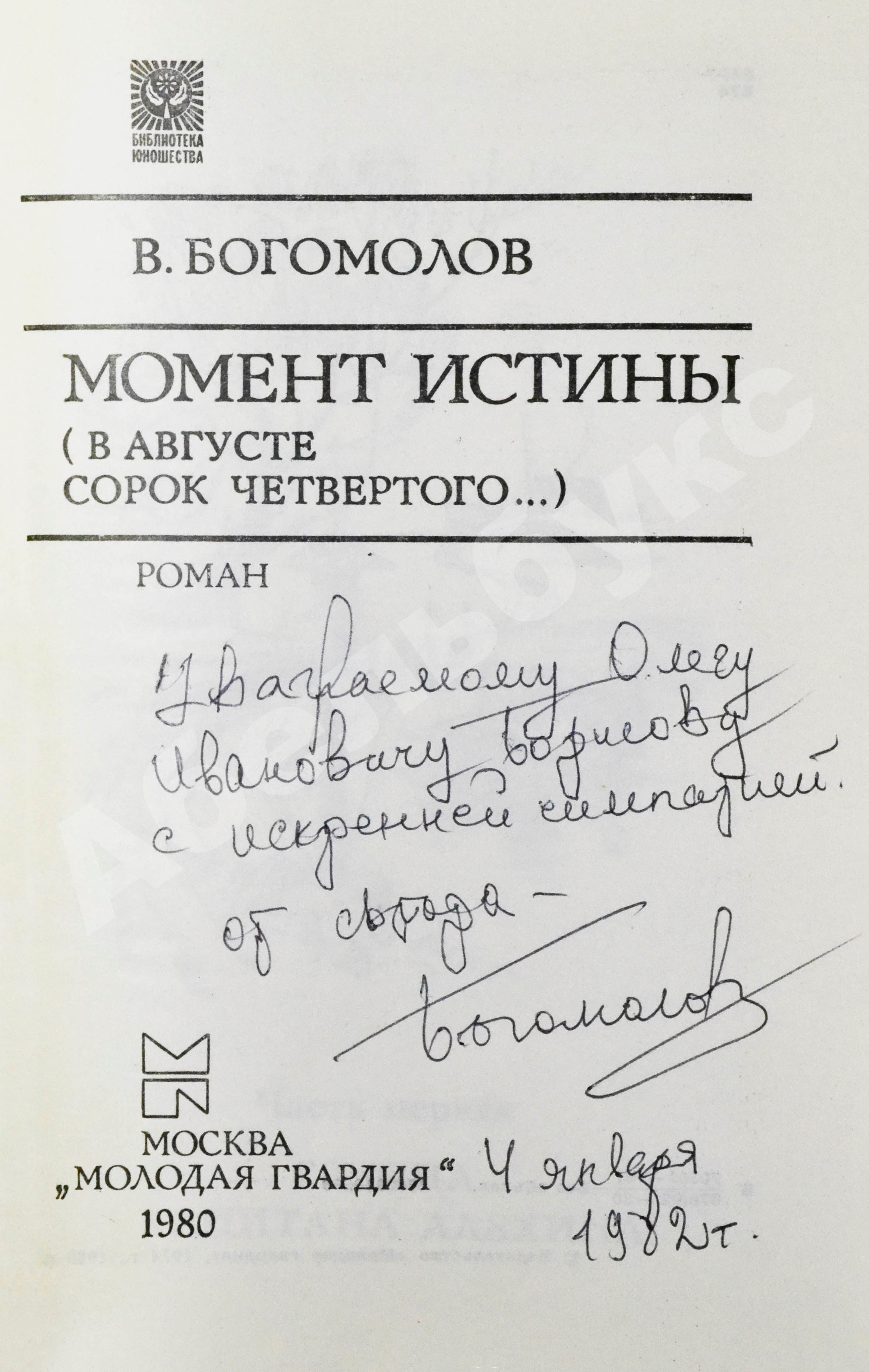 На титульном листе автограф Владимира Богомолова: «Уважаемому Олегу Ивановичу Борисову с искренней симпатией от автора Богомолов 4 января 1982 г.»