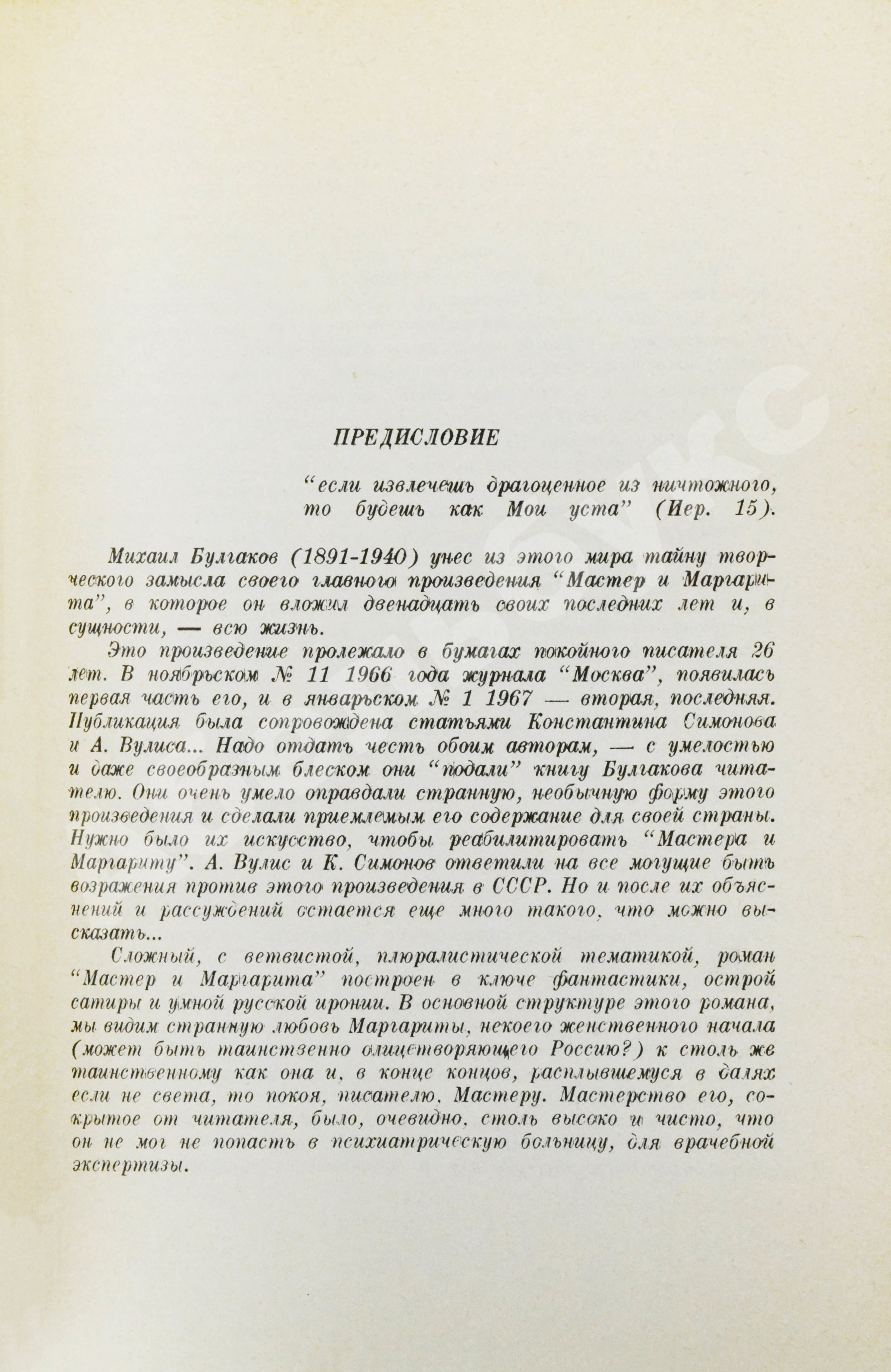 В 1967 году в издательстве «YMCA-Press» вышел представленный первый полный книжный вариант «Мастера и Маргариты», текст которого соответствовал машинописной рукописи. В СССР отдельное книжное издание впервые увидело свет в 1973 году. Этому событию предшествовал выход Постановления секретариата ЦК КПСС «О переиздании художественных произведений М. Волошина, О. Мандельштама, Вяч. Иванова, Н. Клюева, М. Булгакова и других писателей 20-х годов» от 7 июня 1972 года, имевшего гриф «Совершенно секретно». В документе говорилось, что книги указанных писателей и поэтов предполагается выпустить в 1973–1975 гг. «ограниченными тиражами», с обязательными «вступительными статьями и комментариями, дающими марксистско-ленинскую оценку творчества автора».