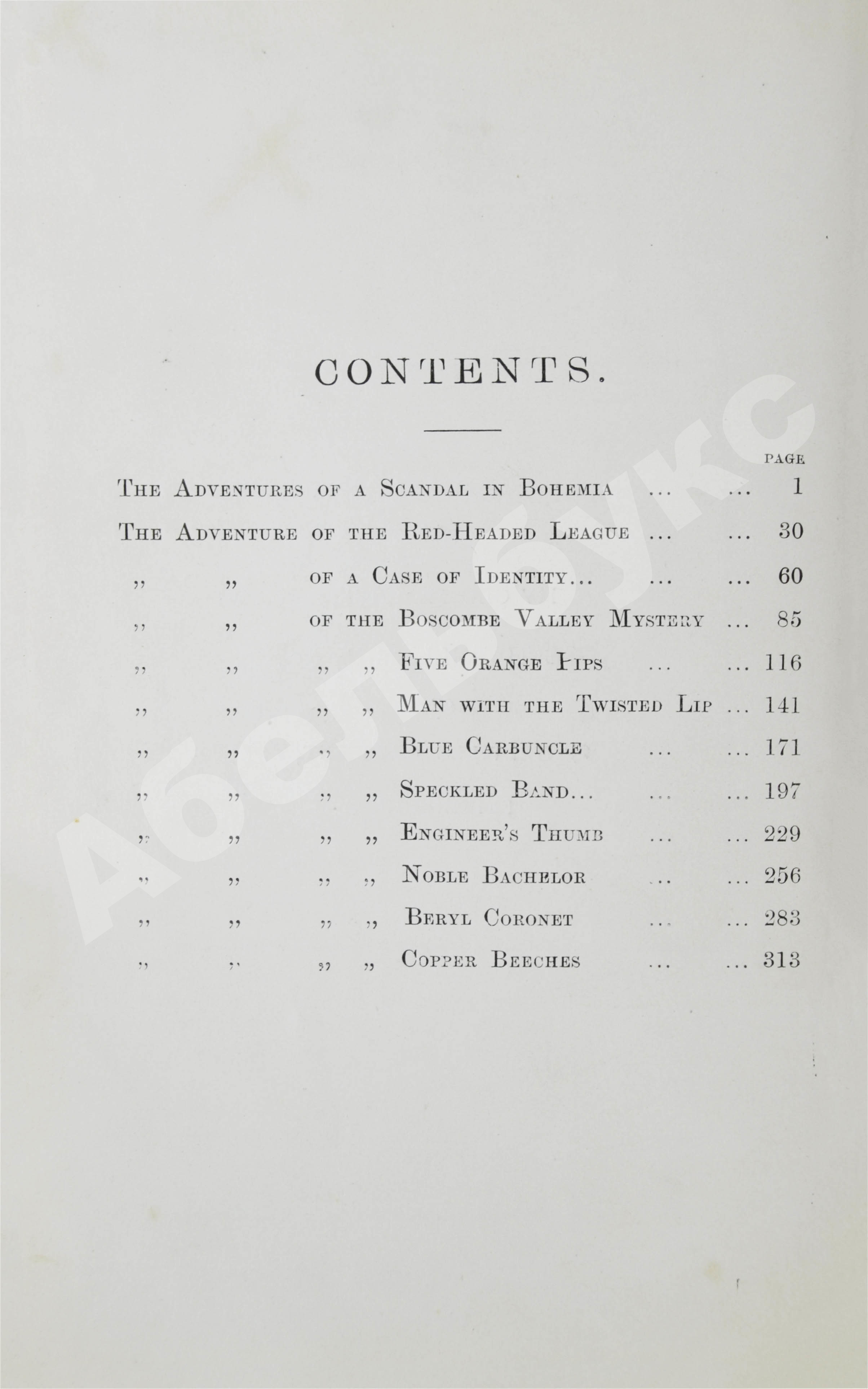 В первый сборник вошли 12 рассказов: «Скандал в Богемии», «Союз рыжих», «Установление личности», «Тайна Боскомской долины», «Пять зёрнышек апельсина», «Человек с рассечённой губой», «Голубой карбункул», «Пёстрая лента», «Палец инженера», «Знатный холостяк», «Берилловая диадема» и «Медные буки».