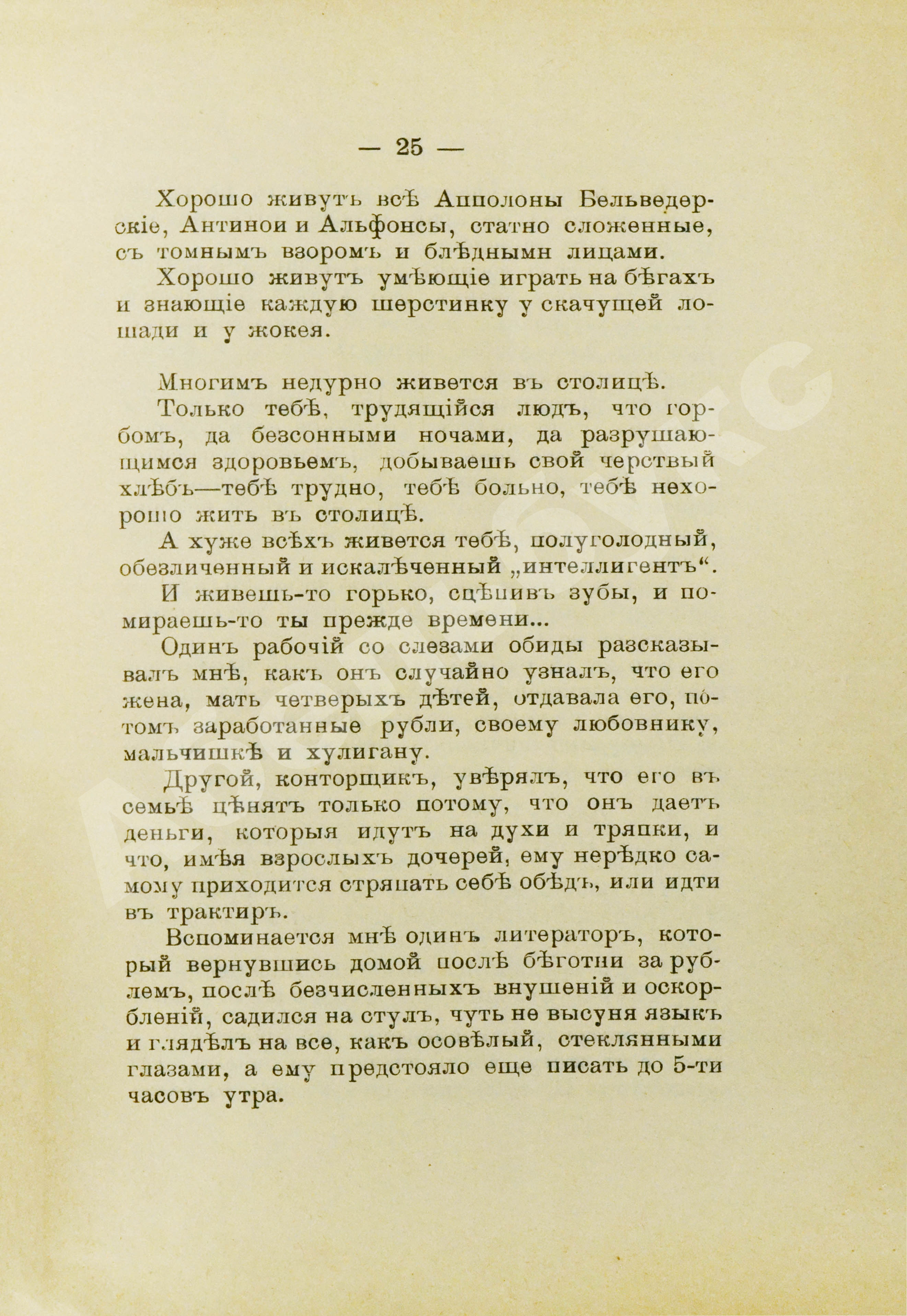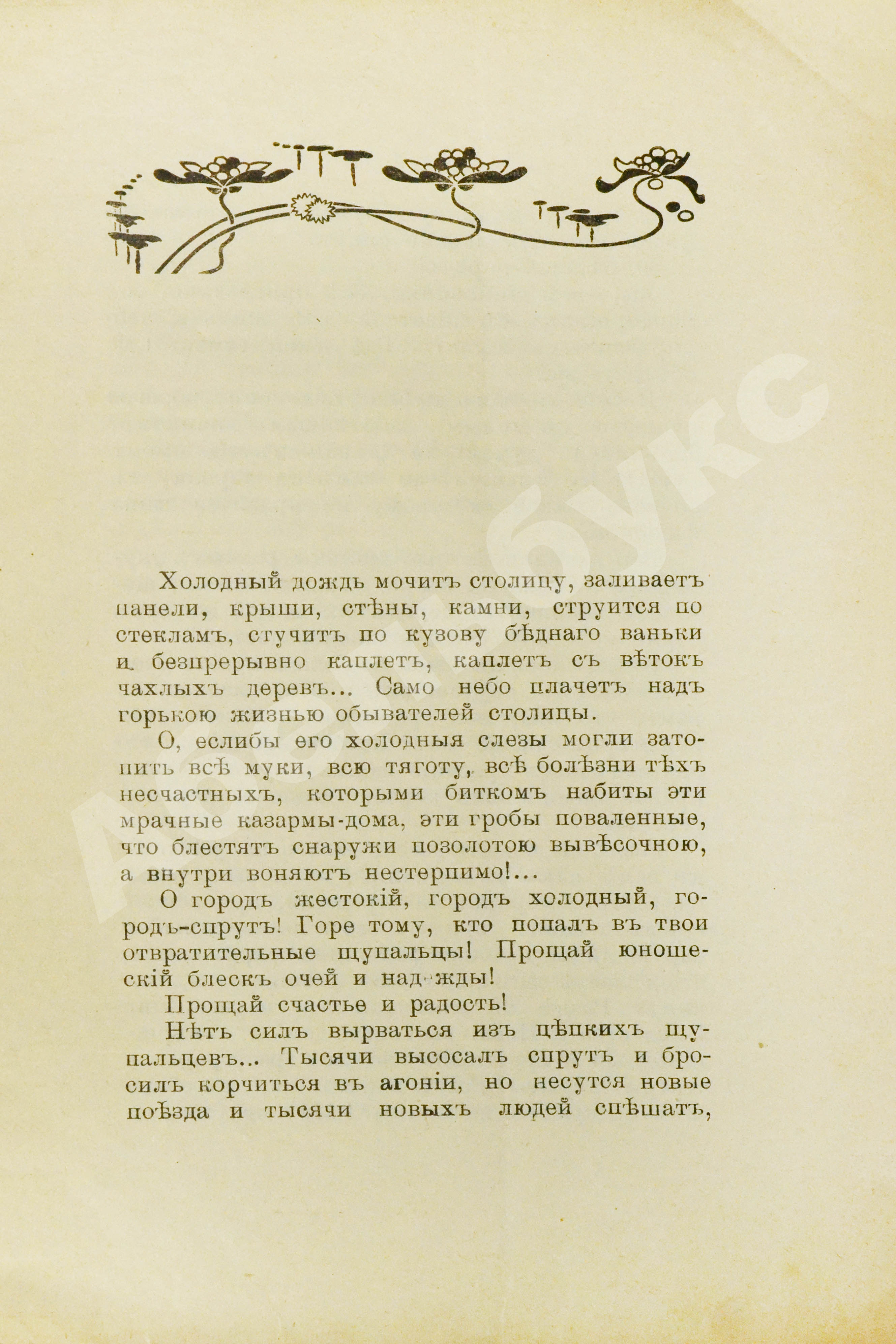 Отчаянный памфлет, рисующий страшную картину повседневной жизни Петербурга 1900-х гг. «О город, полный мерзостей! Тебя величают культурным центром, а от твоей дикой культуры нельзя дышать людям… Ты убиваешь и душу, и тело». Городу, выпивающему из людей все соки, автор противопоставляет спокойную и размеренную сельскую жизнь, разгулу и разврату – семейные ценности.