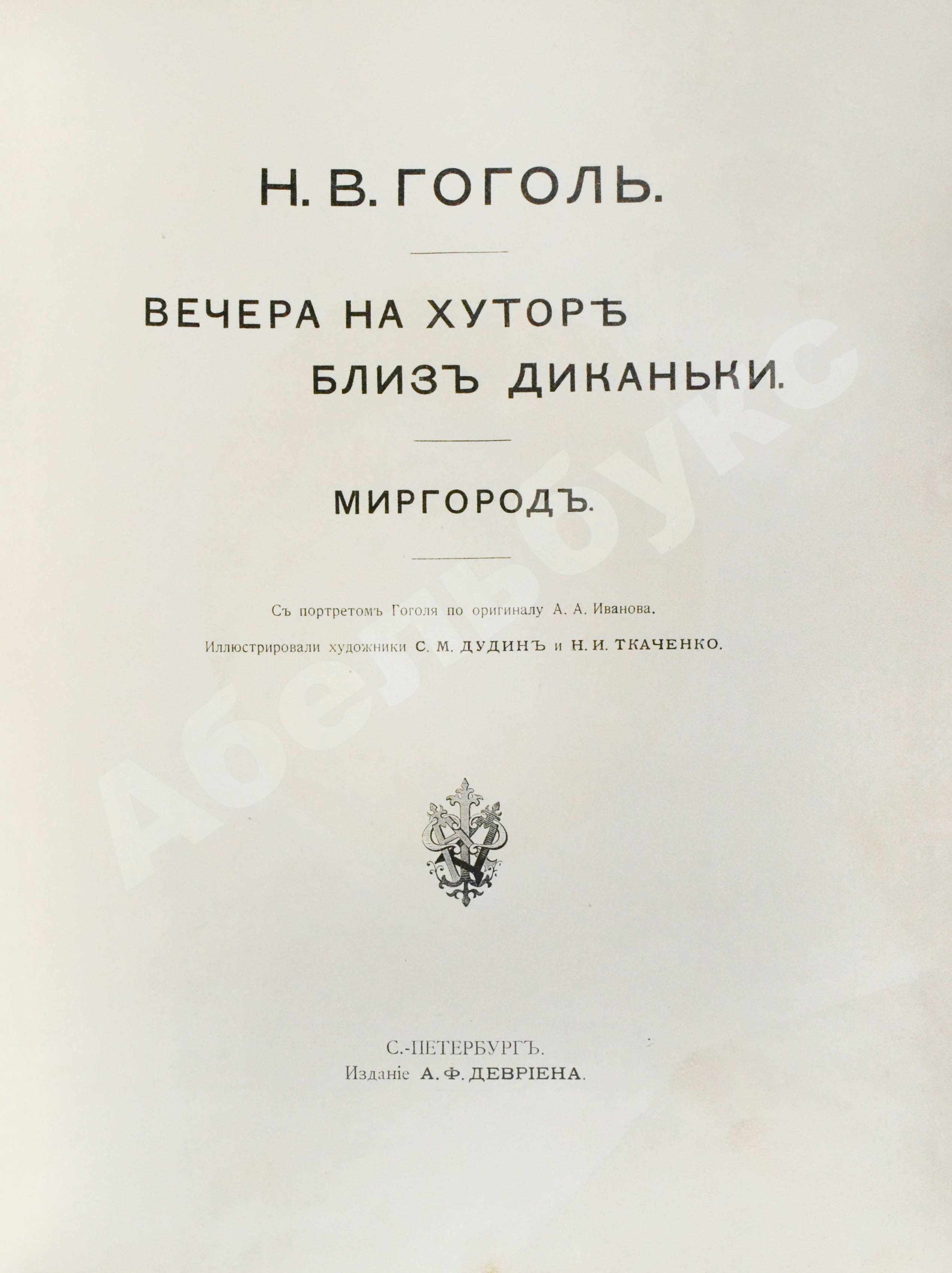 Юбилейный сборник, приуроченный к 80-летию первой публикации первого цикла «Вечеров на хуторе». Прекрасный образец дореволюционных изданий Гоголя. Как писали в рецензии в журнале «Русское Богатство», «книга издана с внимательной к Гоголю роскошью». Издание задумывалось для коллекционирования и подарков, что указано в предисловии: «А.Ф. Девриен не пожалел затрат для того, чтобы придать изданию красивую внешность и солидность, необходимые для книги, предназначенной для любителей красивых изданий и для подарков».