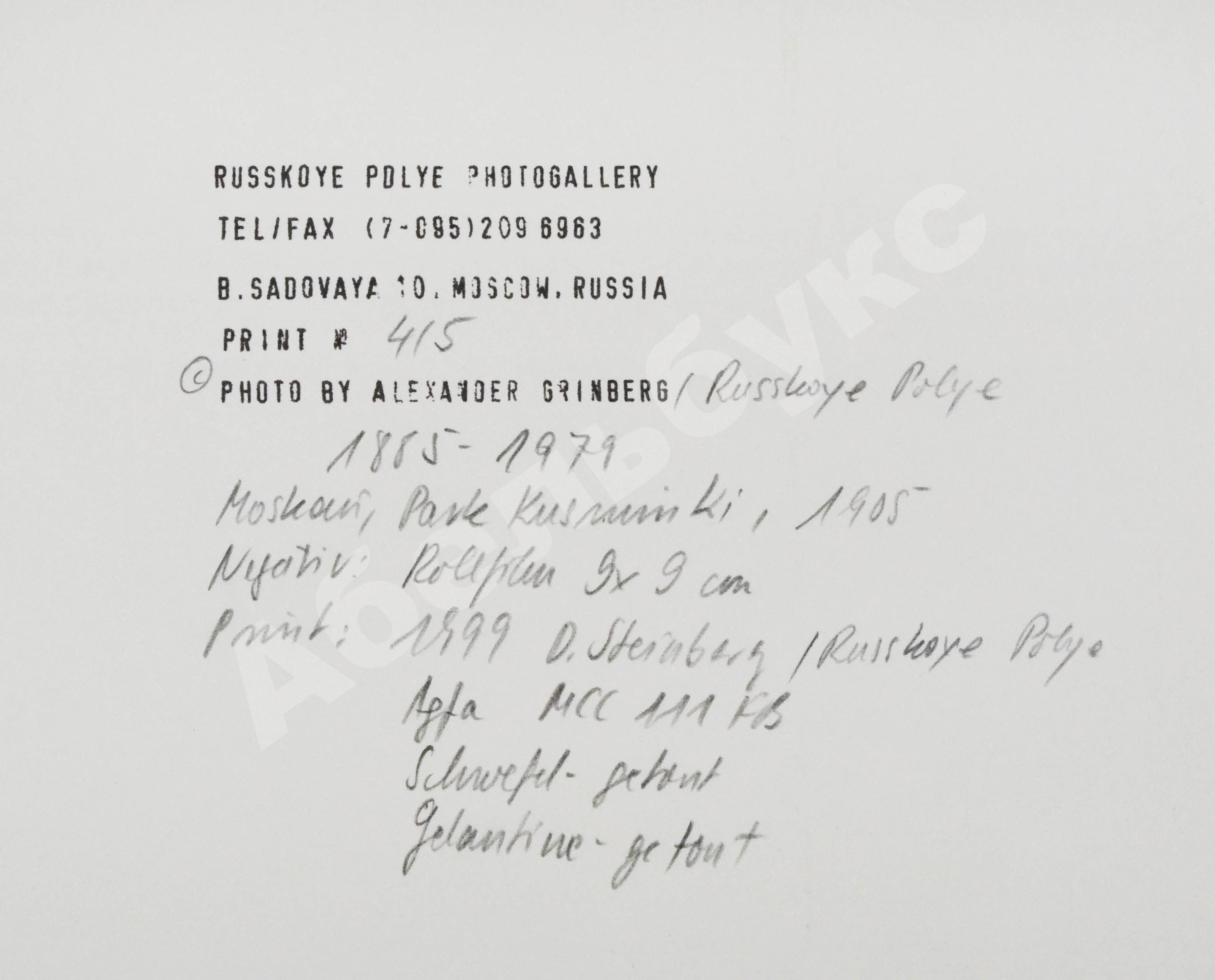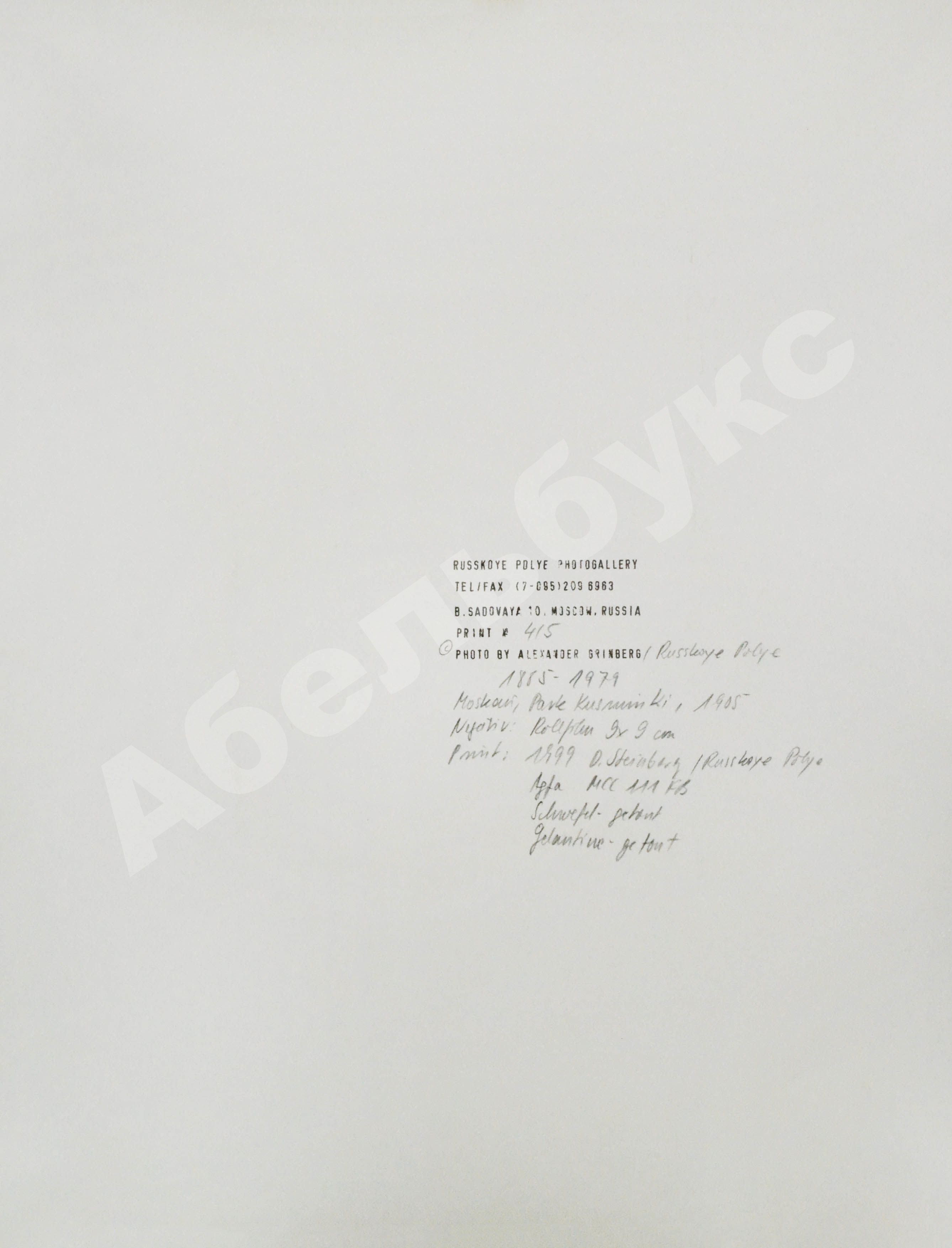 На обороте штамп галереи «Русское поле» и информация о снимке.