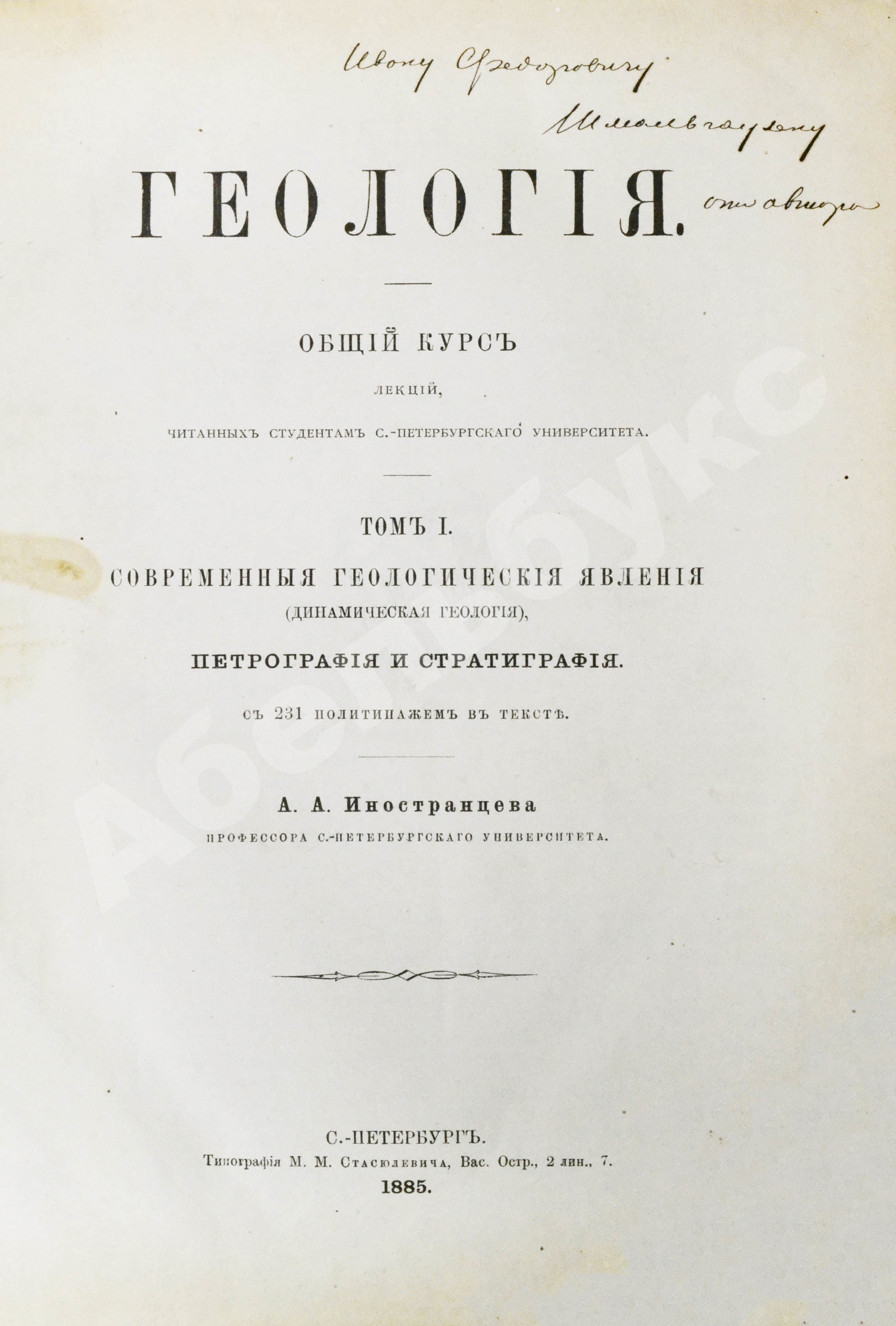 На титульном листе Т.1 автограф Александра Иностранцева: «Ивану Федоровичу Шмальгаузену от автора».
