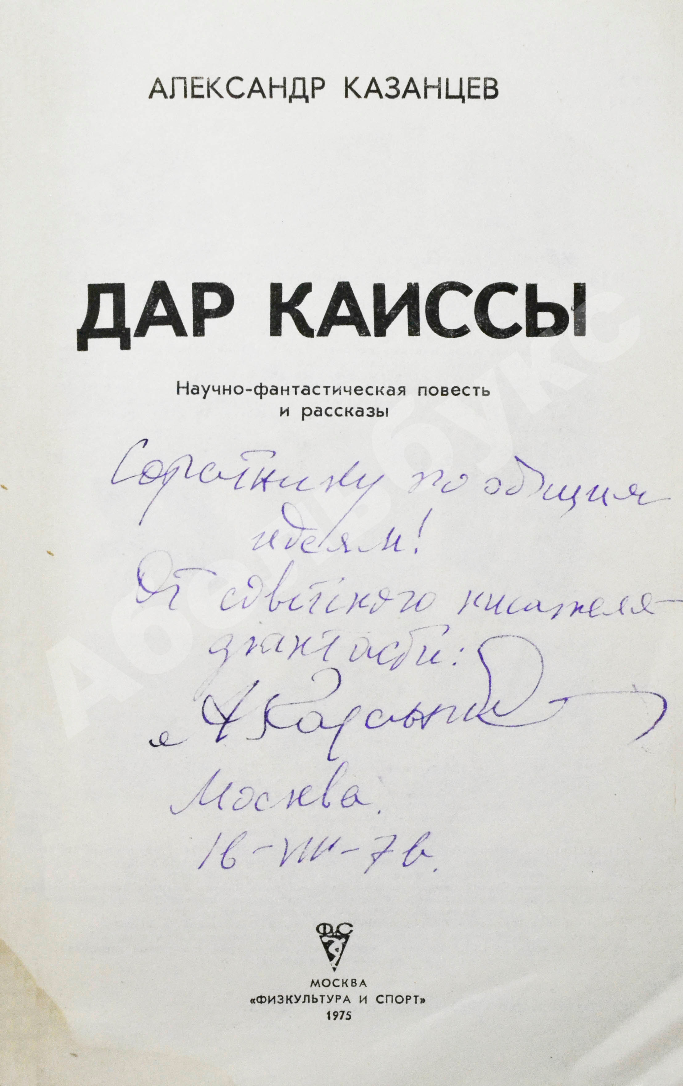 На титульном листе автограф Александра Казанцева: «Соратнику по общим идеям! От советского писателя-фантаста: А Казанцева Москва 16-VIII-76.».