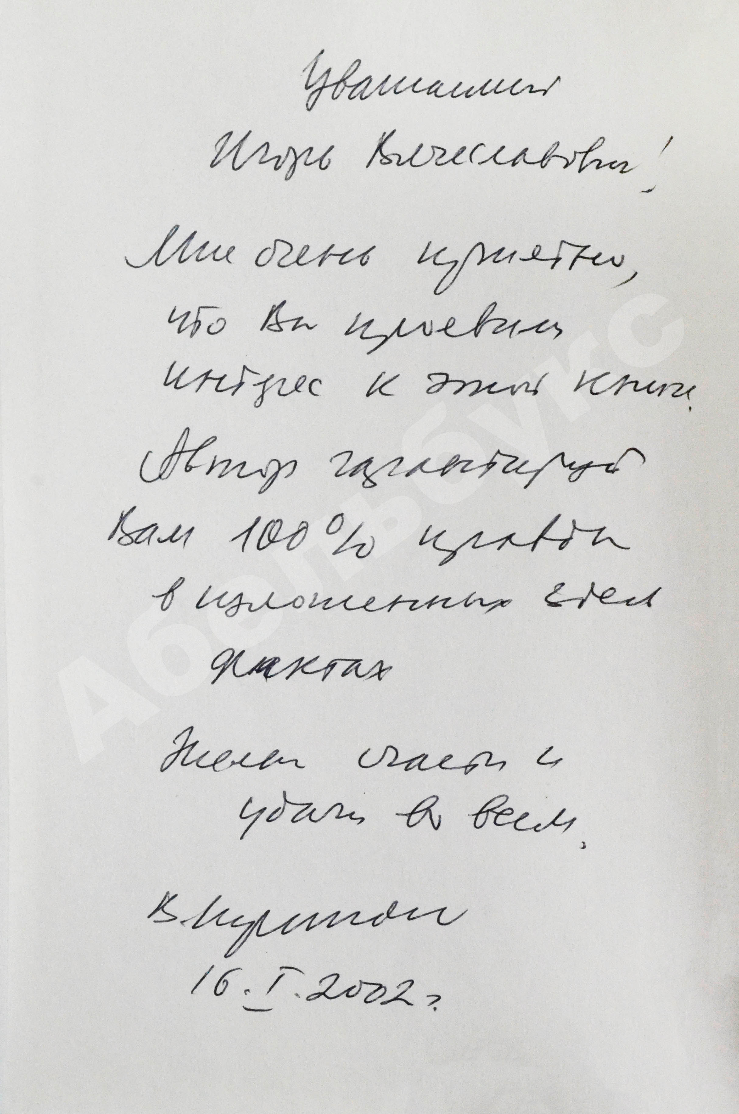 На обороте свободного листа форзаца автограф Вадима Кирпиченко: «Уважаемый Игорь Васильевич! Мне очень приятно, что Вы проявили интерес к этой книге. Автор гарантирует Вам 100% правды в изложенных здесь фактах Желаю счастья и удачи во всем. В Кирпиченко 16.I.2002 г.».