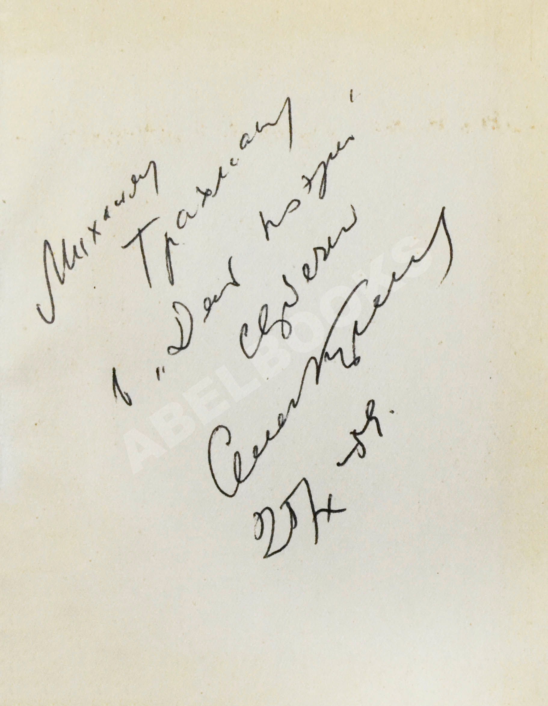 Адресат автографа Михаил Анатольевич Трахман (19180–1976) – фотограф, фотожурналист. В годы Великой Отечественной войны был фотокорреспондентом Совинформбюро, работал в газете «Красная звезда». Наиболее известны его военные фотографии из партизанской серии. После войны работал в журнале «Огонёк» и фотокорреспондентом на ВДНХ.