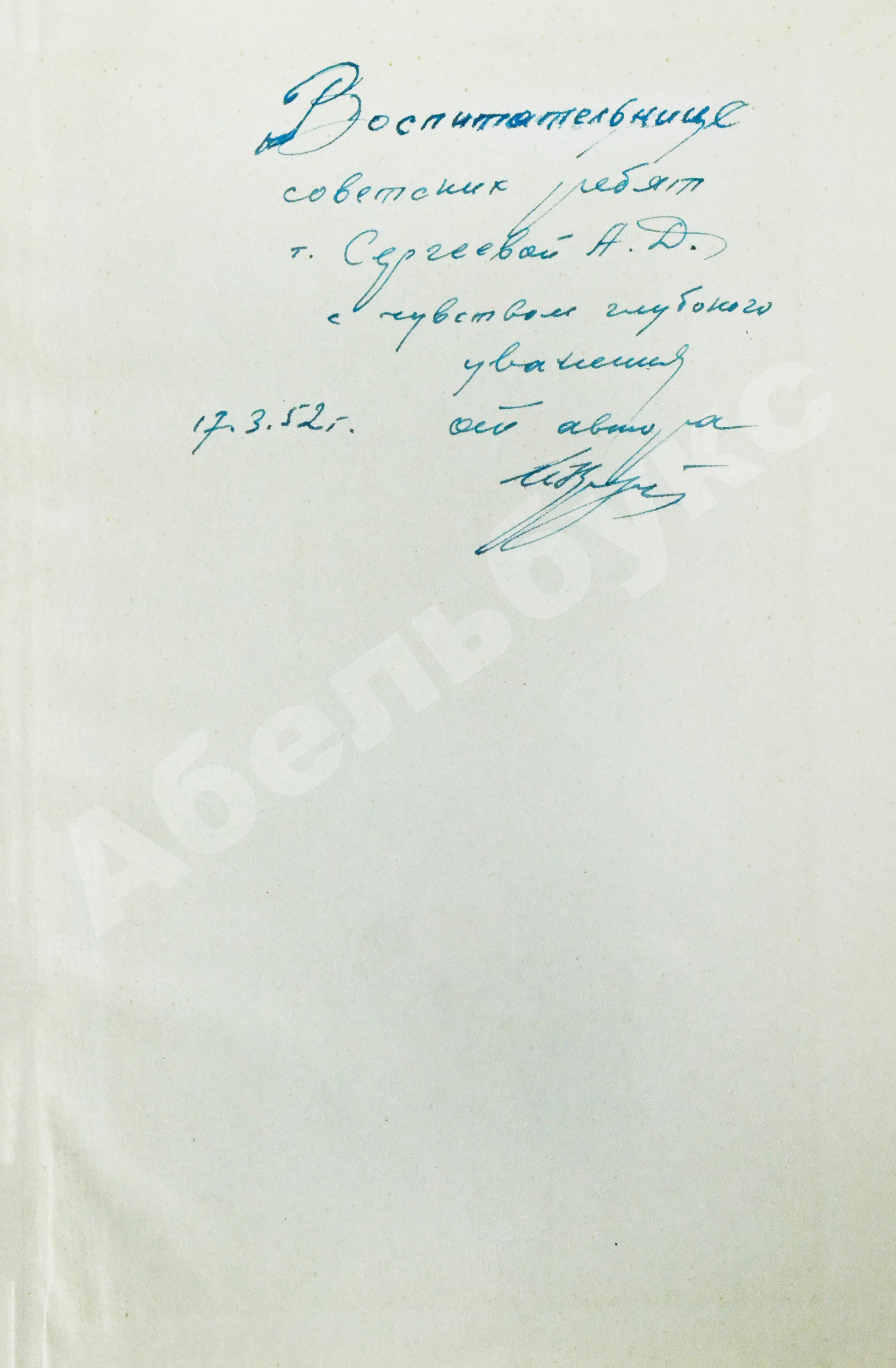 На свободном листе форзаца автографа лётчика Ивана Кожедуба: «Воспитательнице советских ребят т. Сергеевой А.Д. с чувством глубокого уважения от автора И Кожедуб 17.3.52 г.».