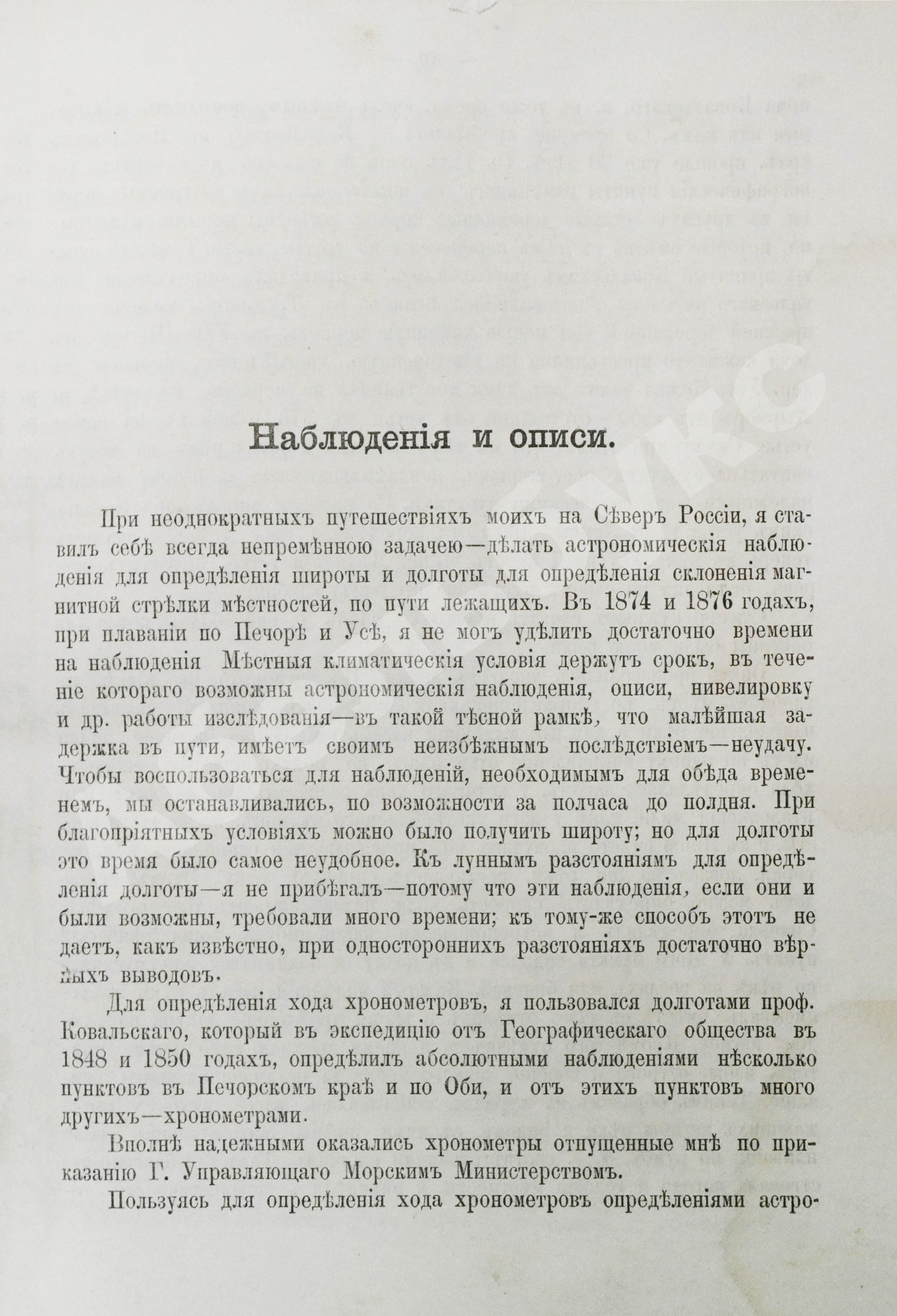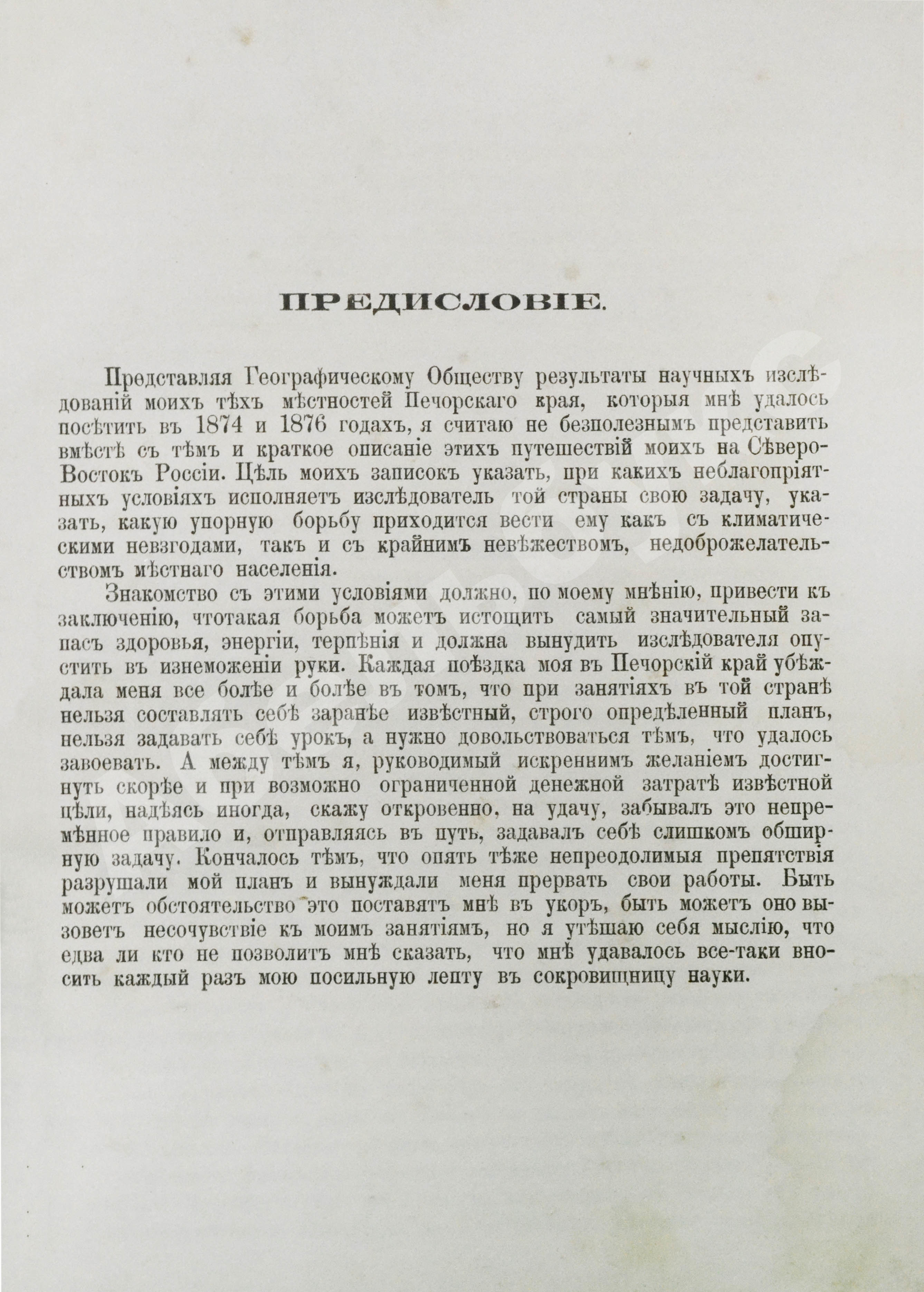 Отчёт о двух экспедициях (1874, 1876) предваряет сообщение: «…мысль, занимавшая меня 35 лет, соединить Сибирь с Европою посредством реки Печоры, наконец осуществилась». Целью этих путешествий было проверить судоходность рек Сарт-ю, притока Усы, в свою очередь крупнейшего притока Печоры, и Сарт-югон из бассейна Оби, а также оценить, пригодна ли местность для рытья каналов, строительства шлюзов и других технических работ.