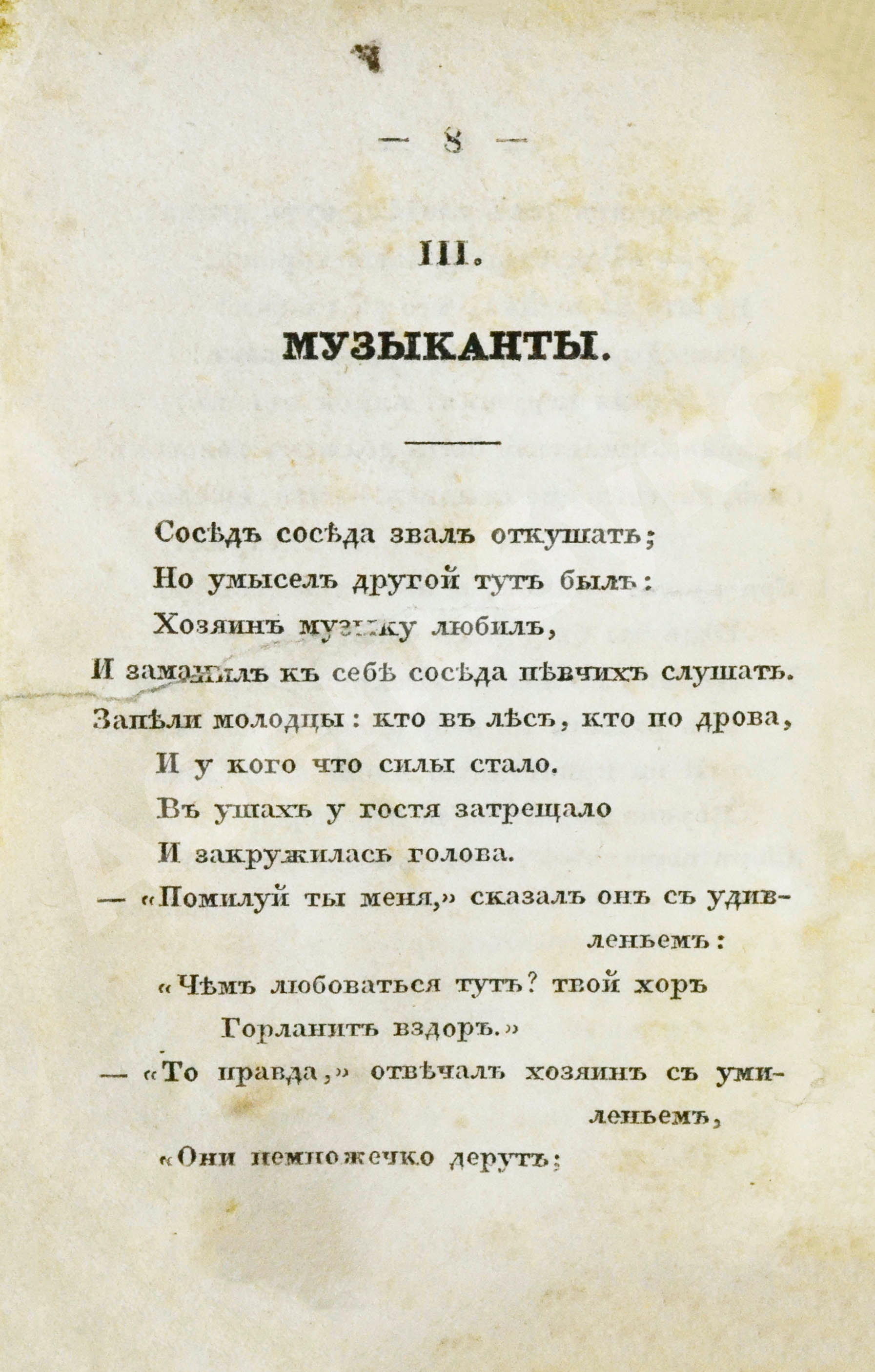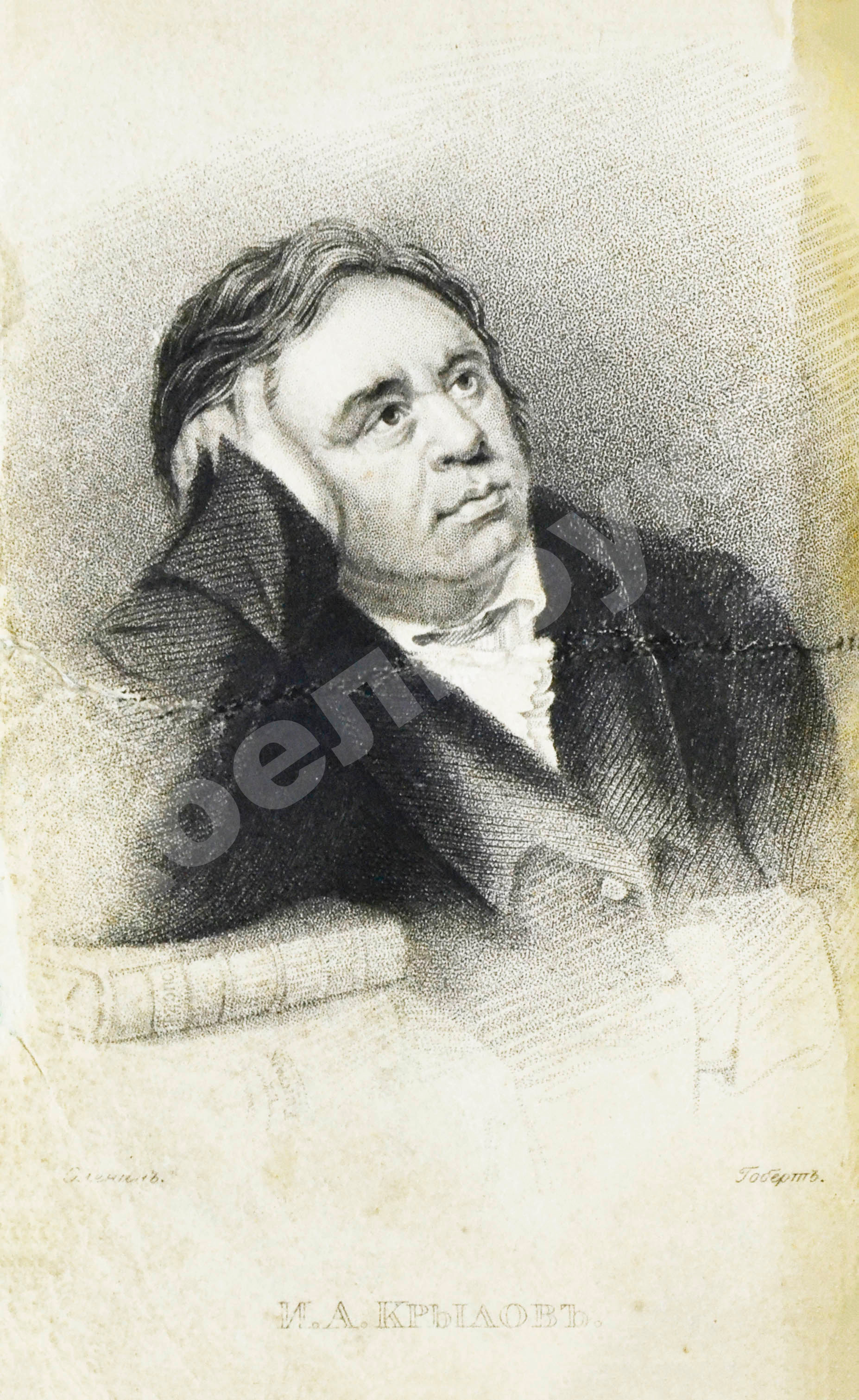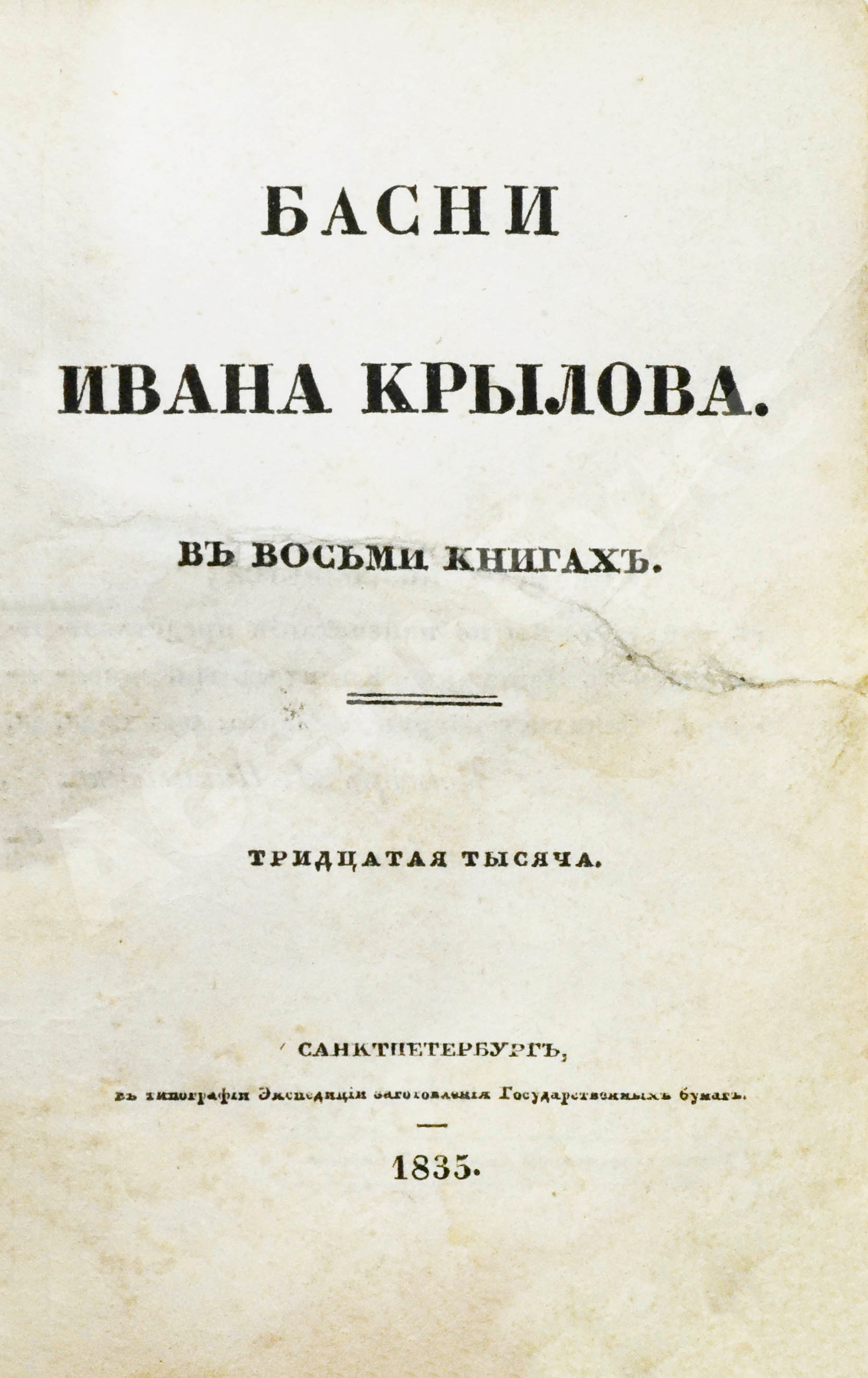 Чтобы ещё больше удивить публику и подстегнуть спрос, в 1835 году Смирдин выпускает необыкновенное издание, настоящую жемчужину – маленькую (10х7 см, в 1/32 долю листа) сувенирную книжку-украшение, для которой в типографии Экспедиции заготовления государственных бумаг специально заказывает и ему отливают особый шрифт типа нонпарель. К книге прилагались нежные сине-белые обложки (в данном экземпляре не сохранились) и портрет Ивана Крылова (отлично сохранился), рисованный с натуры Петром Олениным и гравированный Гобертом.