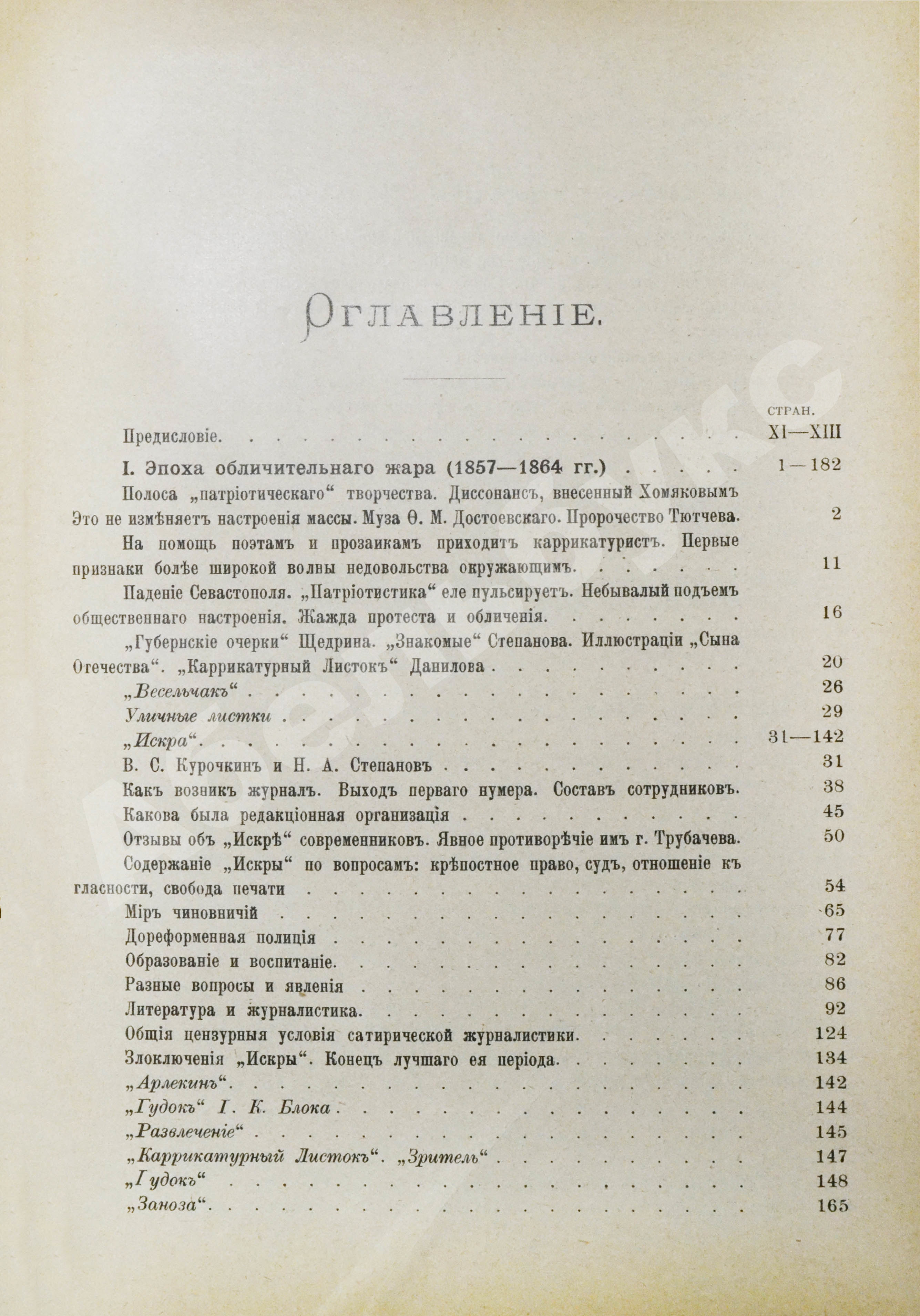 Первый и самый объёмный в сборнике очерк посвящён сатире и карикатуре. Потеря Севастополя в 1855 году и предшествовавшее тому насаждение патриотизма вызвало в обществе «жажду протеста и обличения». Так появились издания: «Весельчак», «Искра», «Арлекин», «Гудок», «Развлечение», «Заноза», «Оса». Наибольшее внимание Лемке уделил «Искре» как лучшему сатирическому журналу XIX века. Автор не скупится на цитаты и приводит множество пародий, диалогов, анекдотов, опубликованных в журналах.