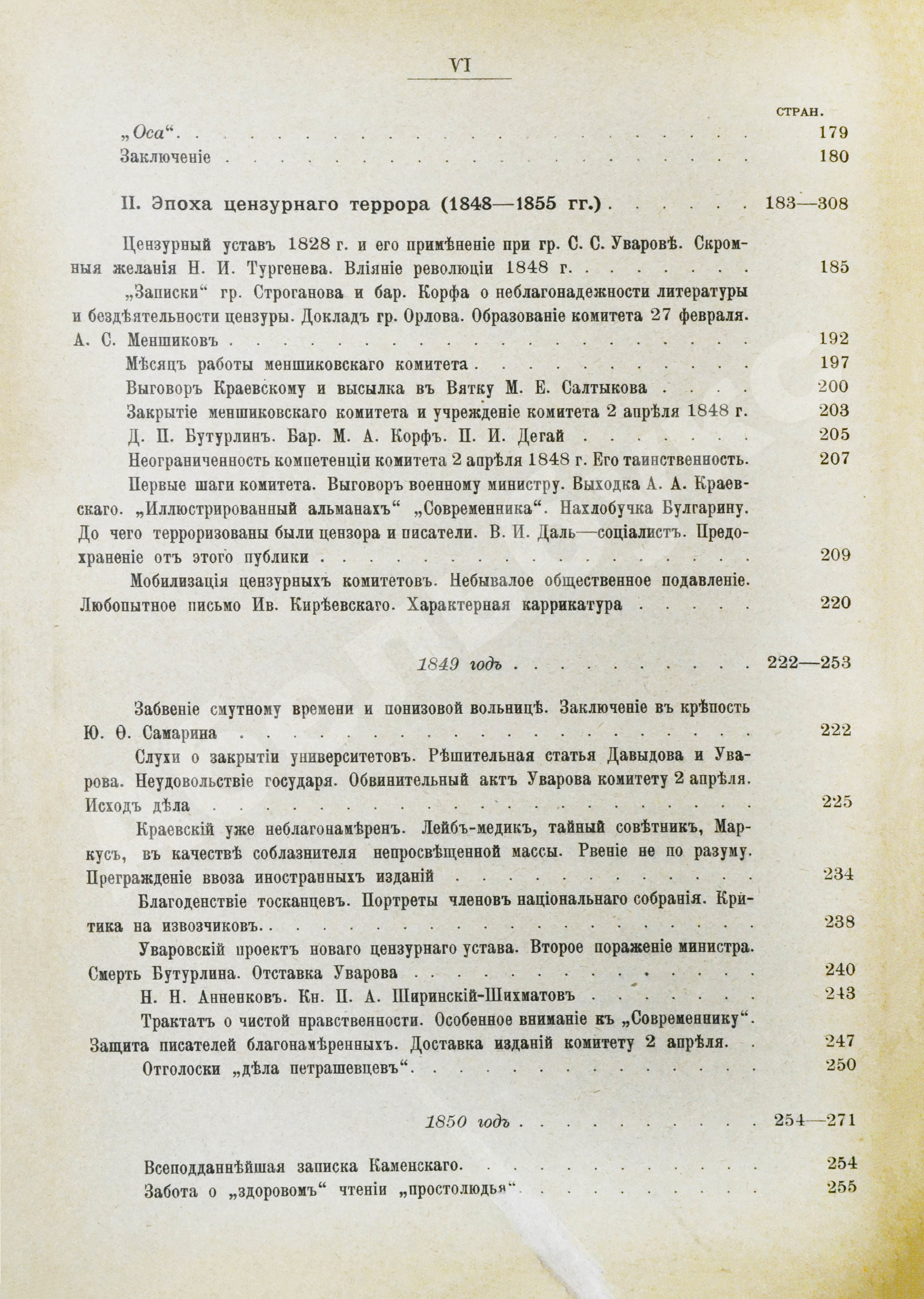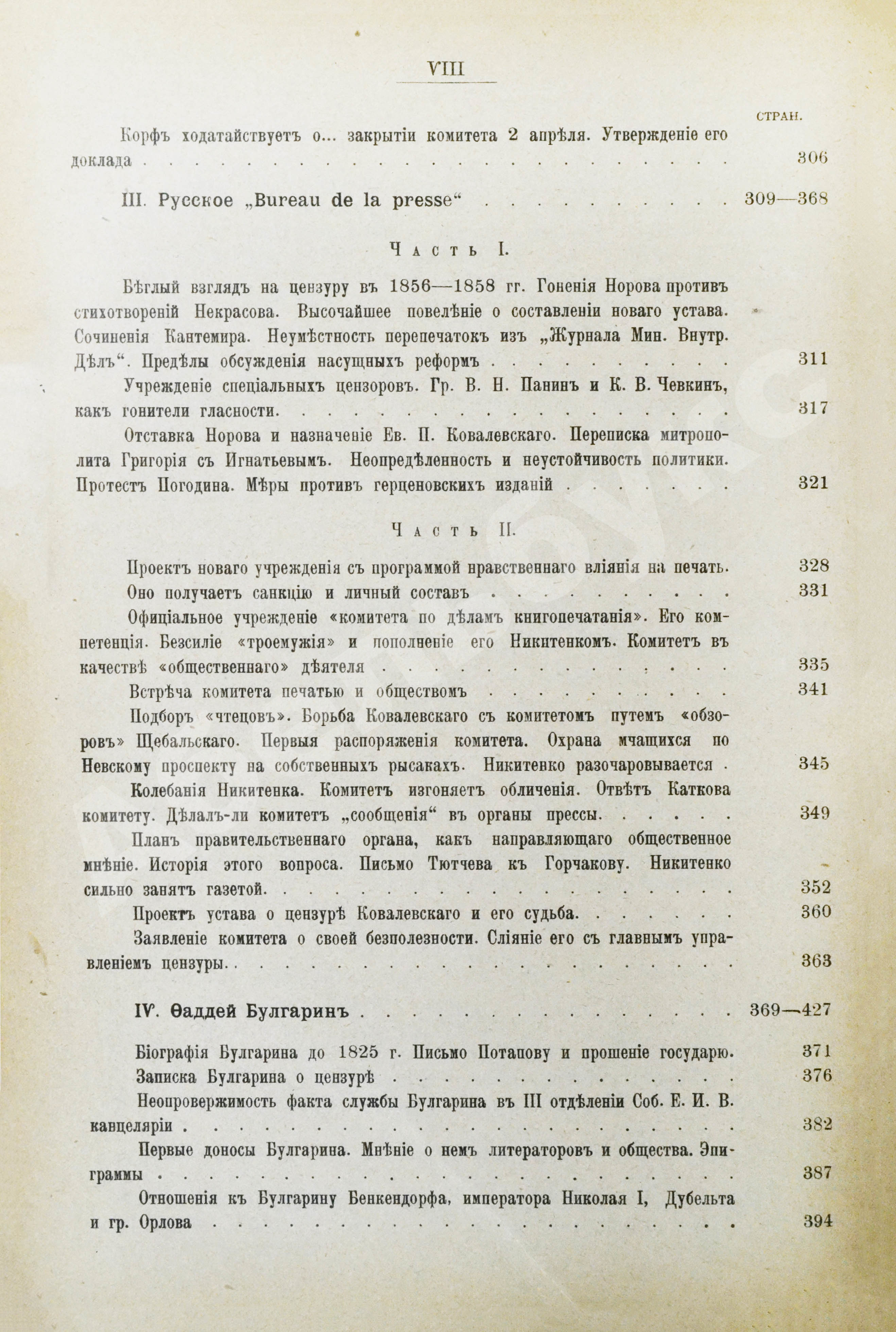Во втором очерке особое внимание уделе негласной цензуре – Меншиковскому и Бутурлинскому комитетам. Третий очерк посвящён любопытному «назидательному» учреждению – «троемужию», как окрестил его Фёдор Тютчев. Четвёртый очерк представляет Фаддея Булгарина как порождение своего времени, «результат общих условий, которые регулировали тогда печатное выражение общественной мысли».