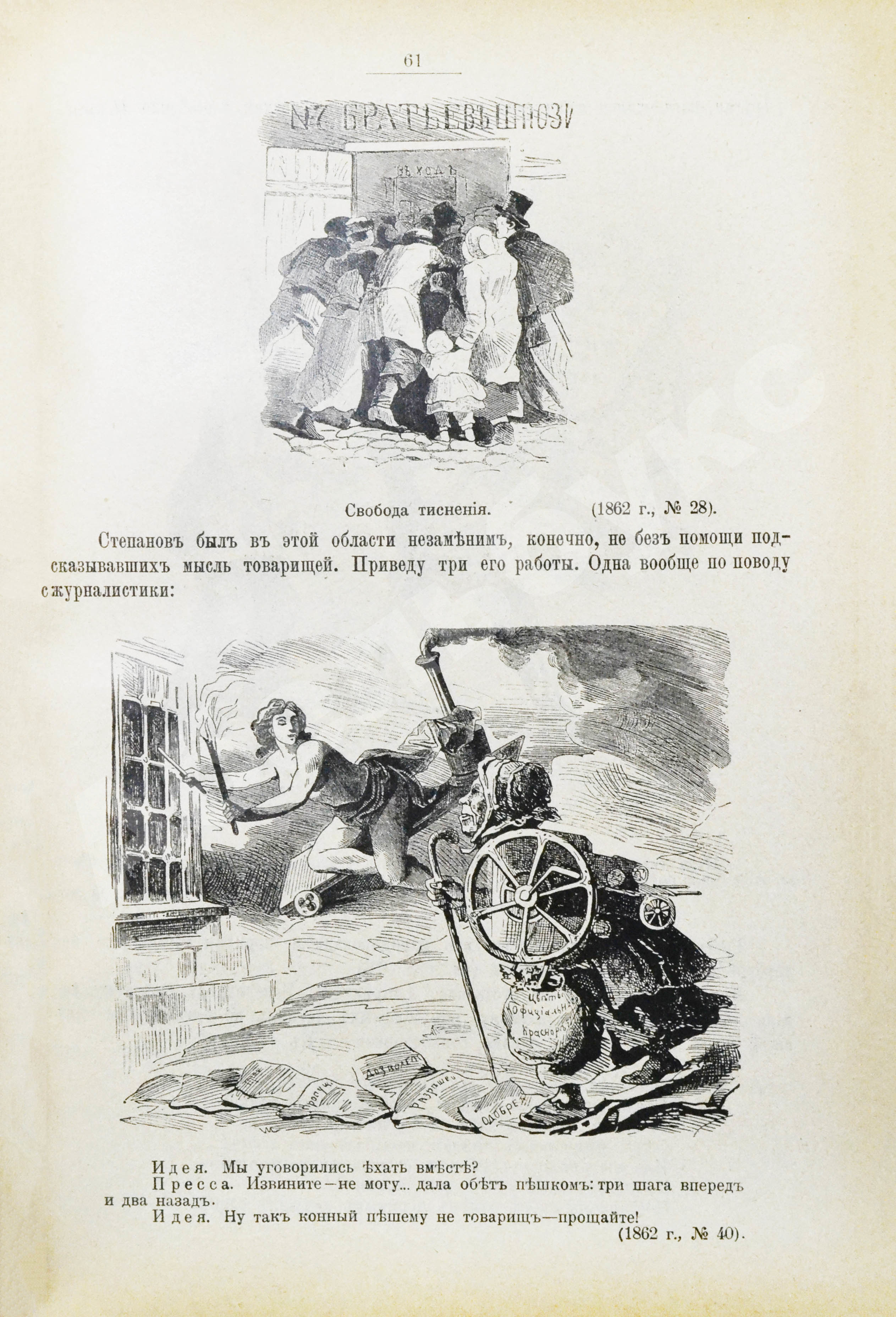 Иллюстрируют первый очерк карикатуры Николая Степанова, Адриана Волкова, Николая Иевлева, Петра Бореля. Подборка остроумных карикатур придаёт книге особую ценность. Далеко не все рисунки в журналах были удачны, Лемке, проштудировав номера, выбрал лучшие и прокомментировал их.
