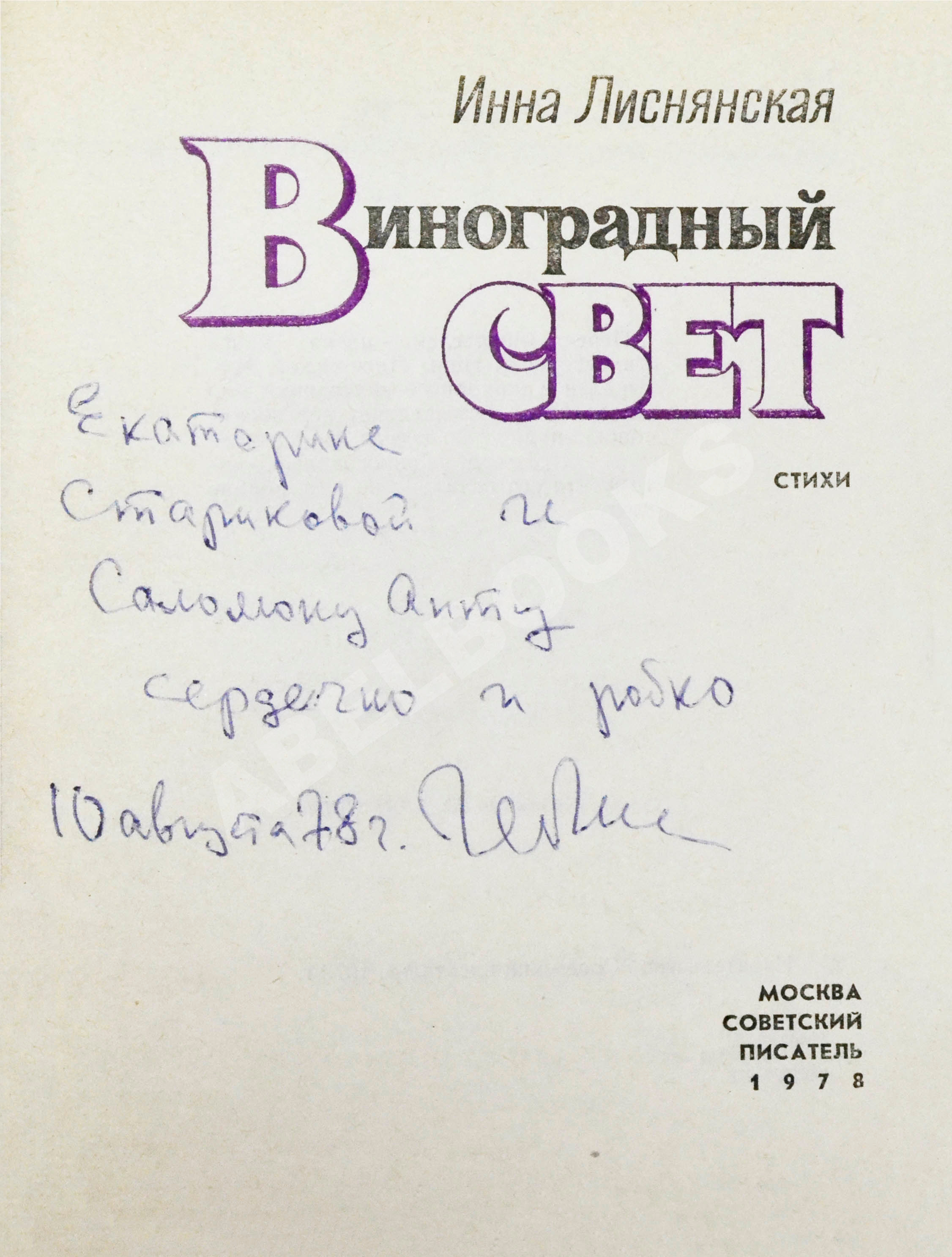 Дарственная надпись на титуле: «Екатерине Стариковой и Соломону Апту сердечно и робко 10 августа 1978 г. И. Лиснянская».