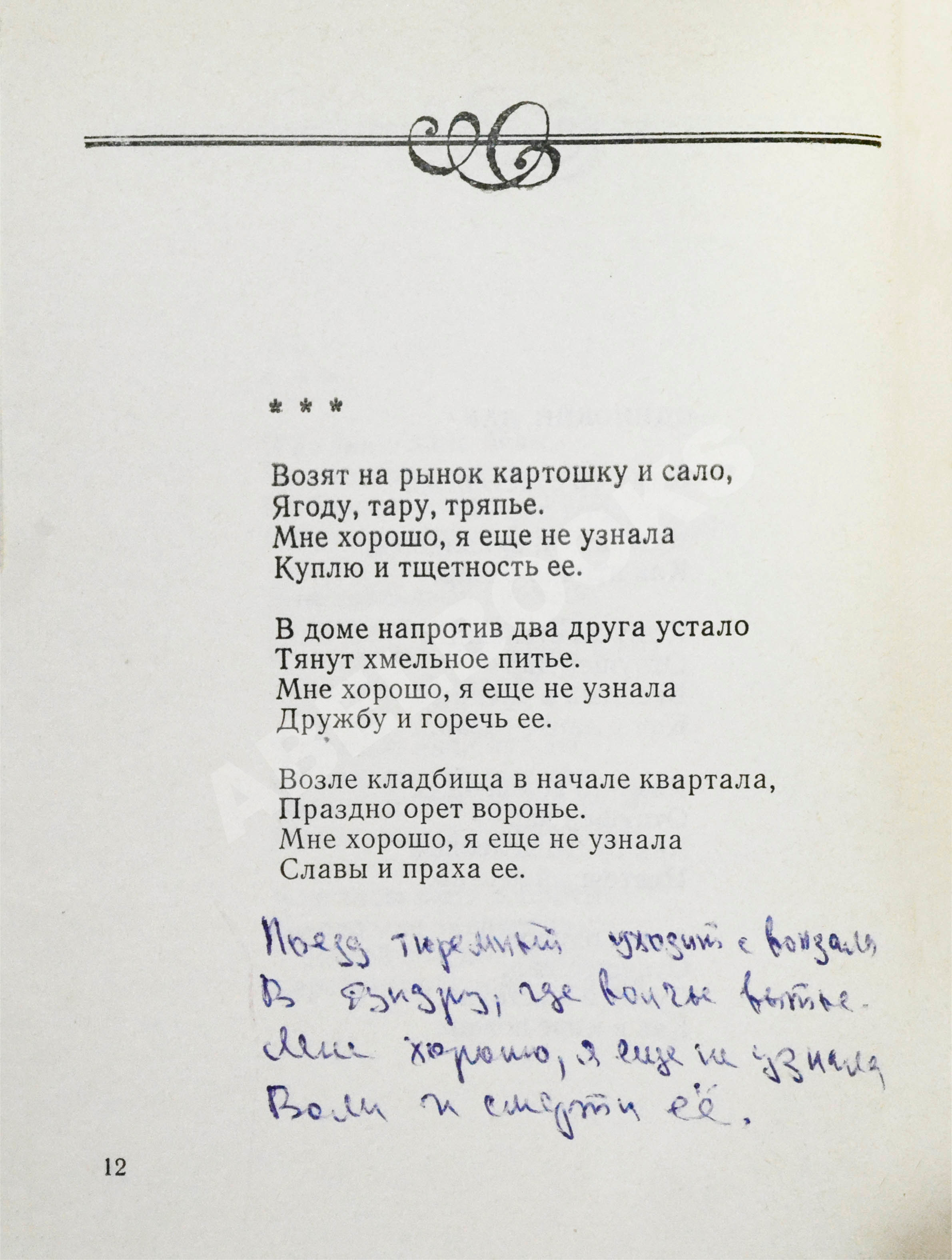 На С.12 Инна Лиснянская дописала строфу к стихотворению «Возят на рынок картошку и сало»: