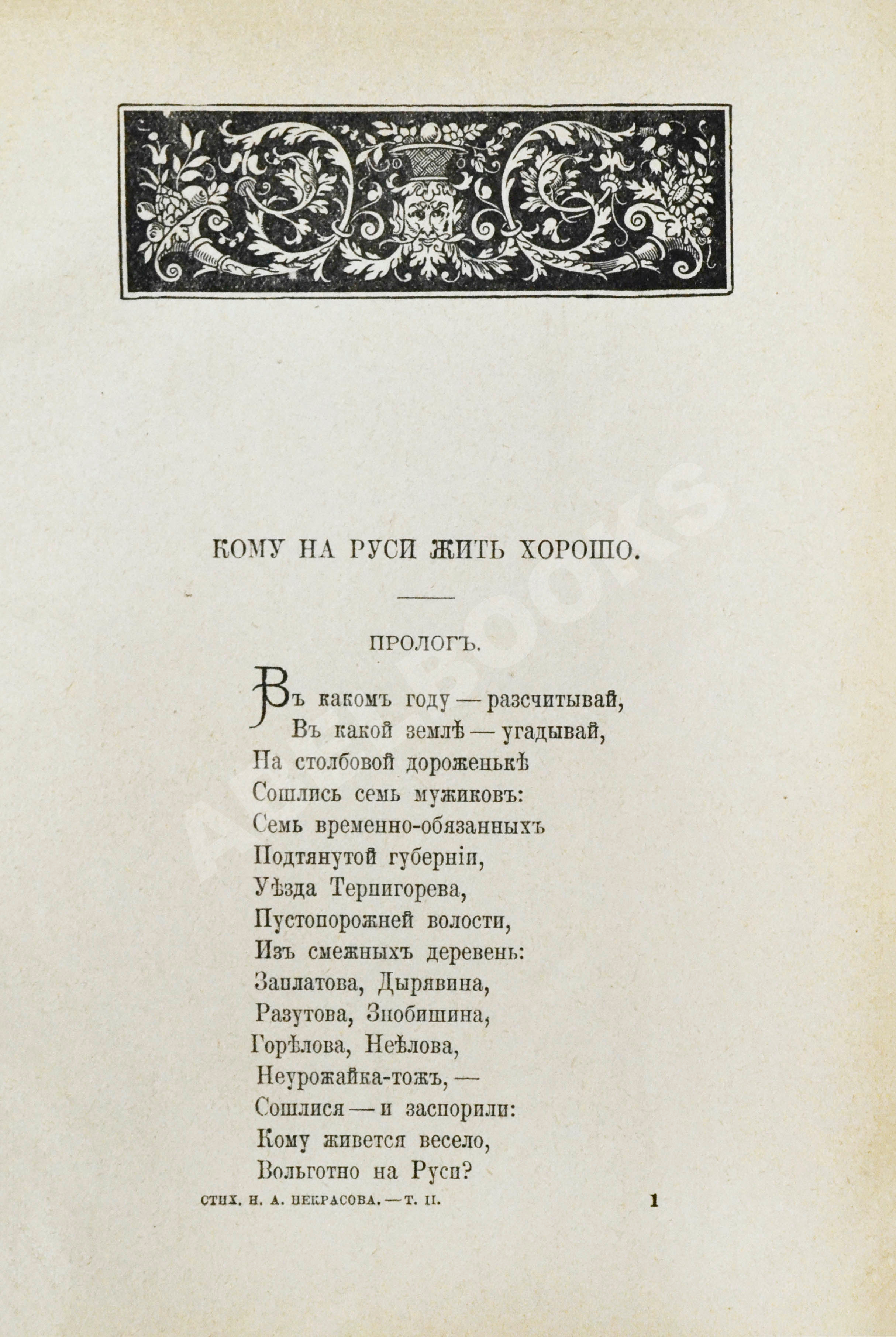 В первом томе помещён портрет Николая Некрасова, отпечатанный в Лейпциге у Брокгауза, и факсимильная копия стихотворения «Русь», которое входит в поэму «Кому на Руси жить хорошо», но настолько органично и цельно, что рассматривается и как самостоятельное произведение. На факсимиле приводится первоначальный карандашный оригинал стихотворения, найденный в бумагах поэта.