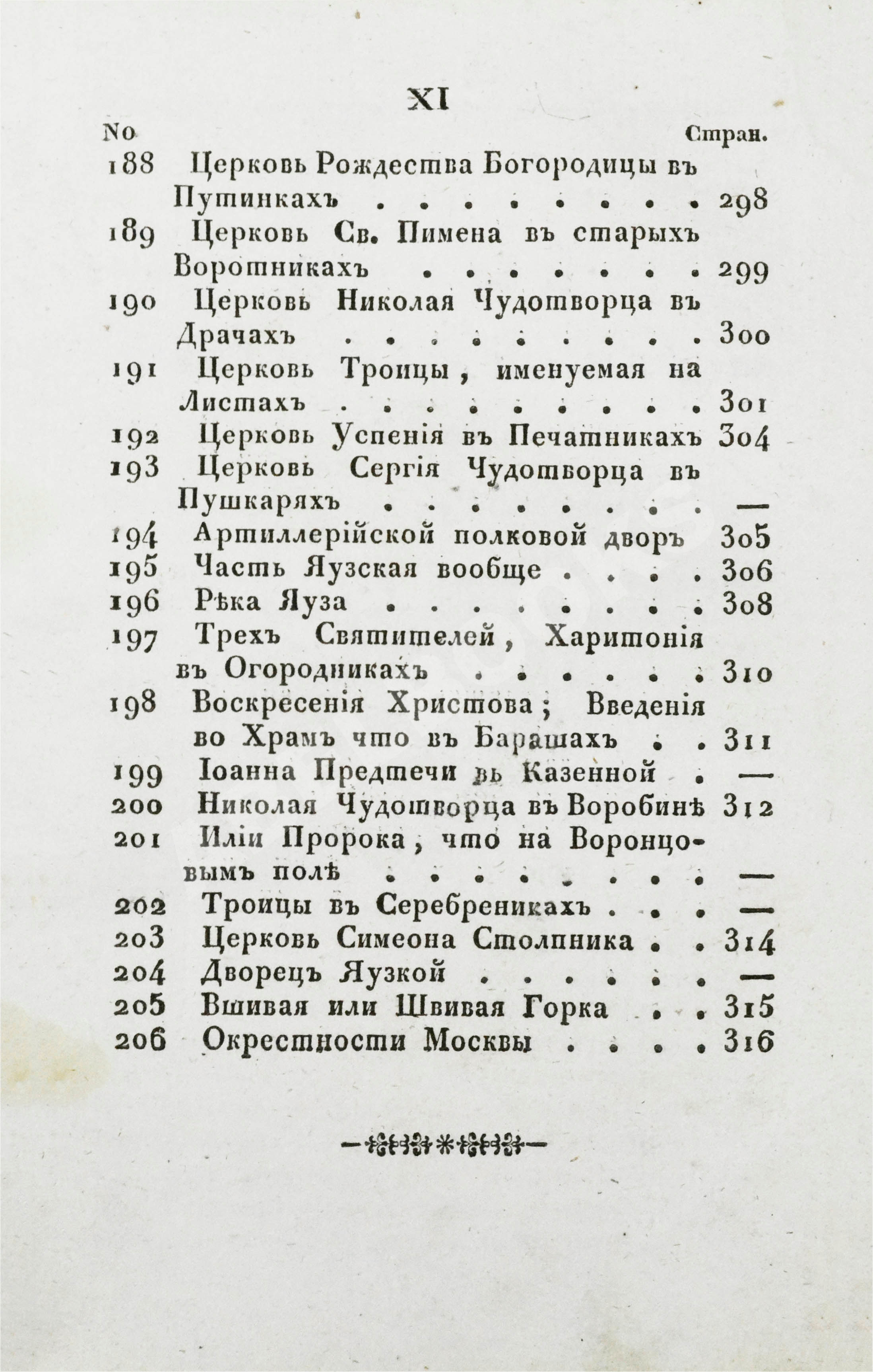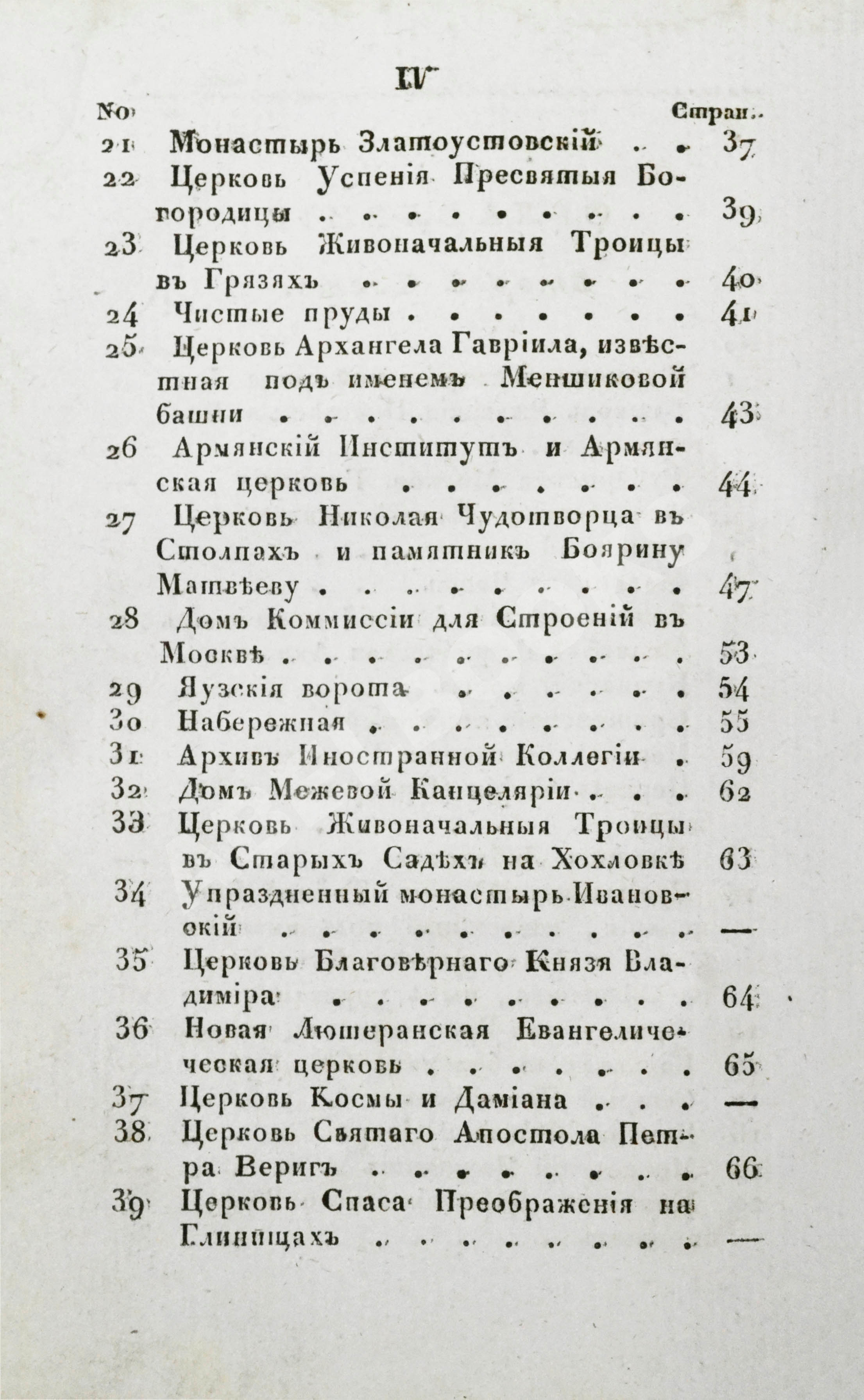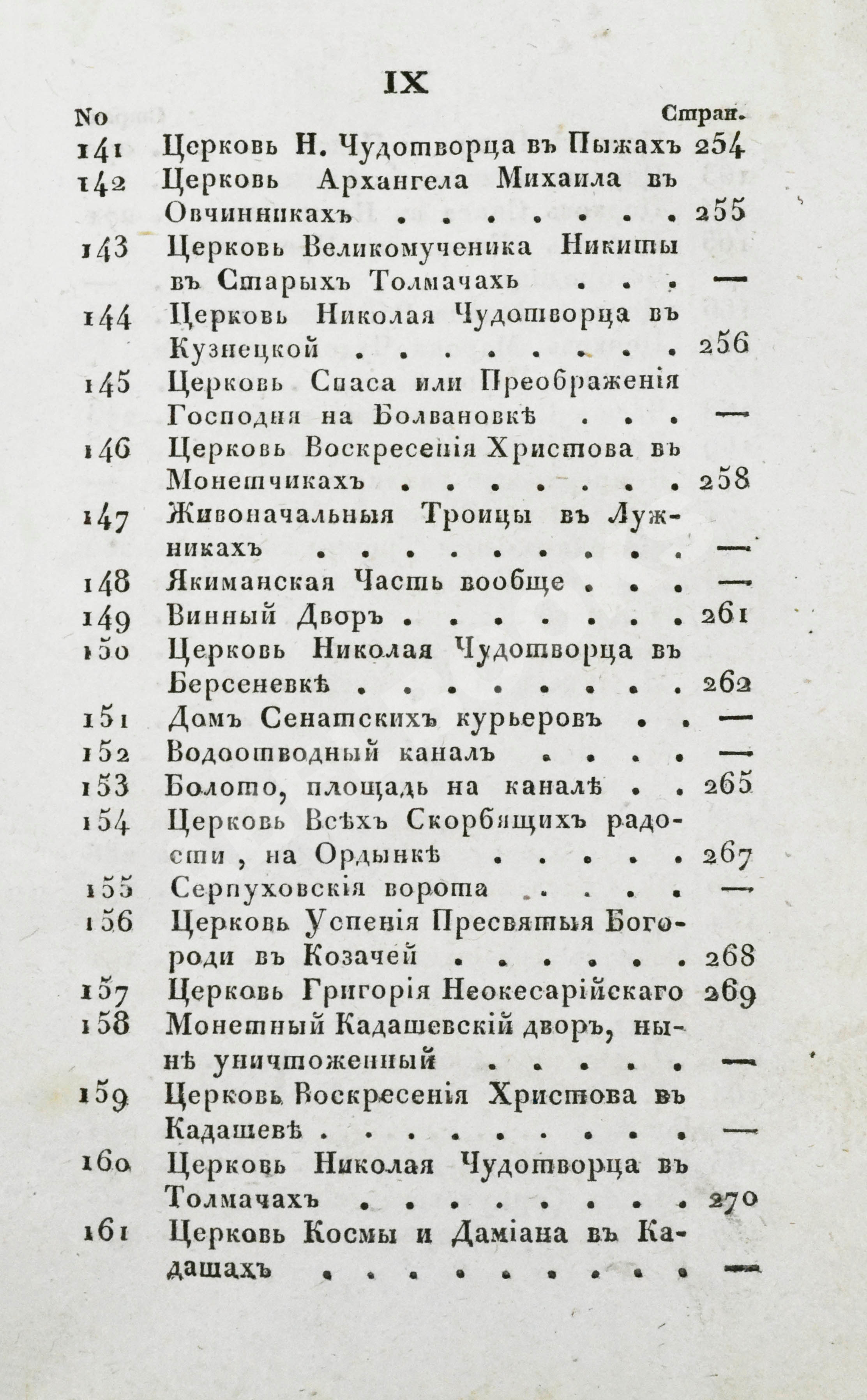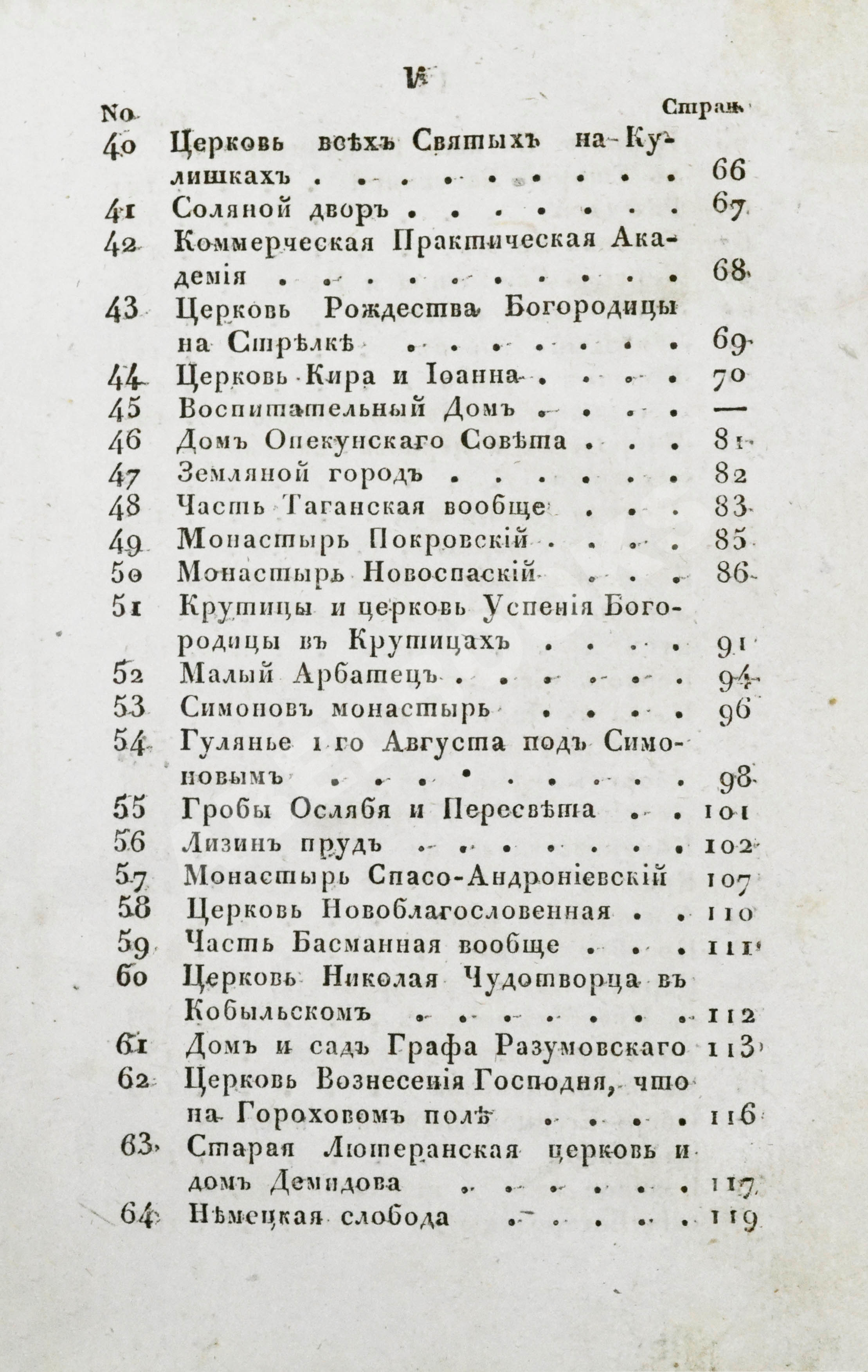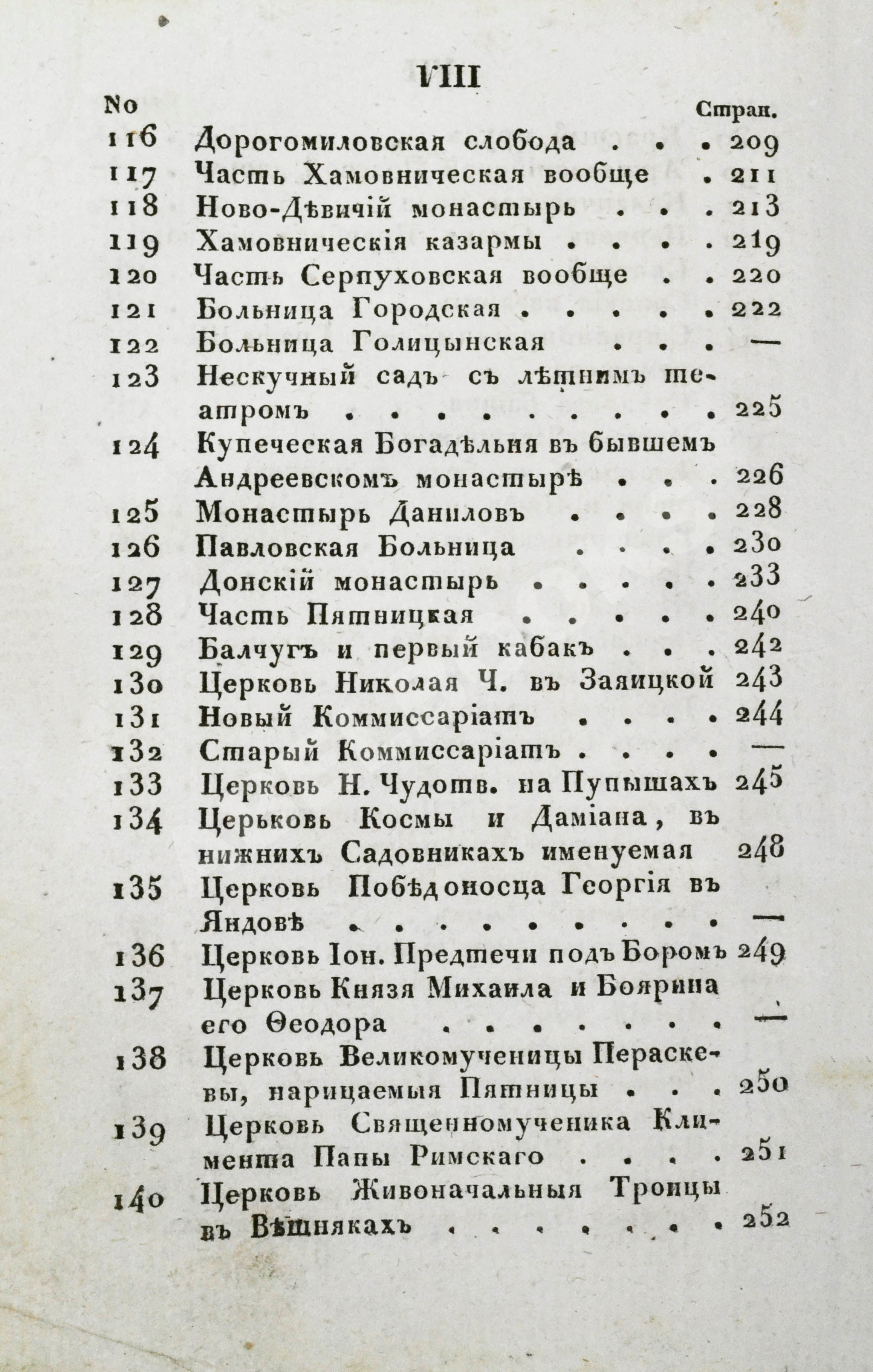 Среди описанных зданий – больше всего церквей. Москва считалась центром православия, здесь действовало почти 400 церквей – в два раза больше, чем в Петербурге – и около 20 монастырей. На месте Храма Христа Спасителя, проект которого к 1833 году уже утвердили, ещё стоял Алексеевский женский монастырь, памятник XVII века, а у грандиозного Симонова монастыря 1-го августа устраивали большие гулянья.