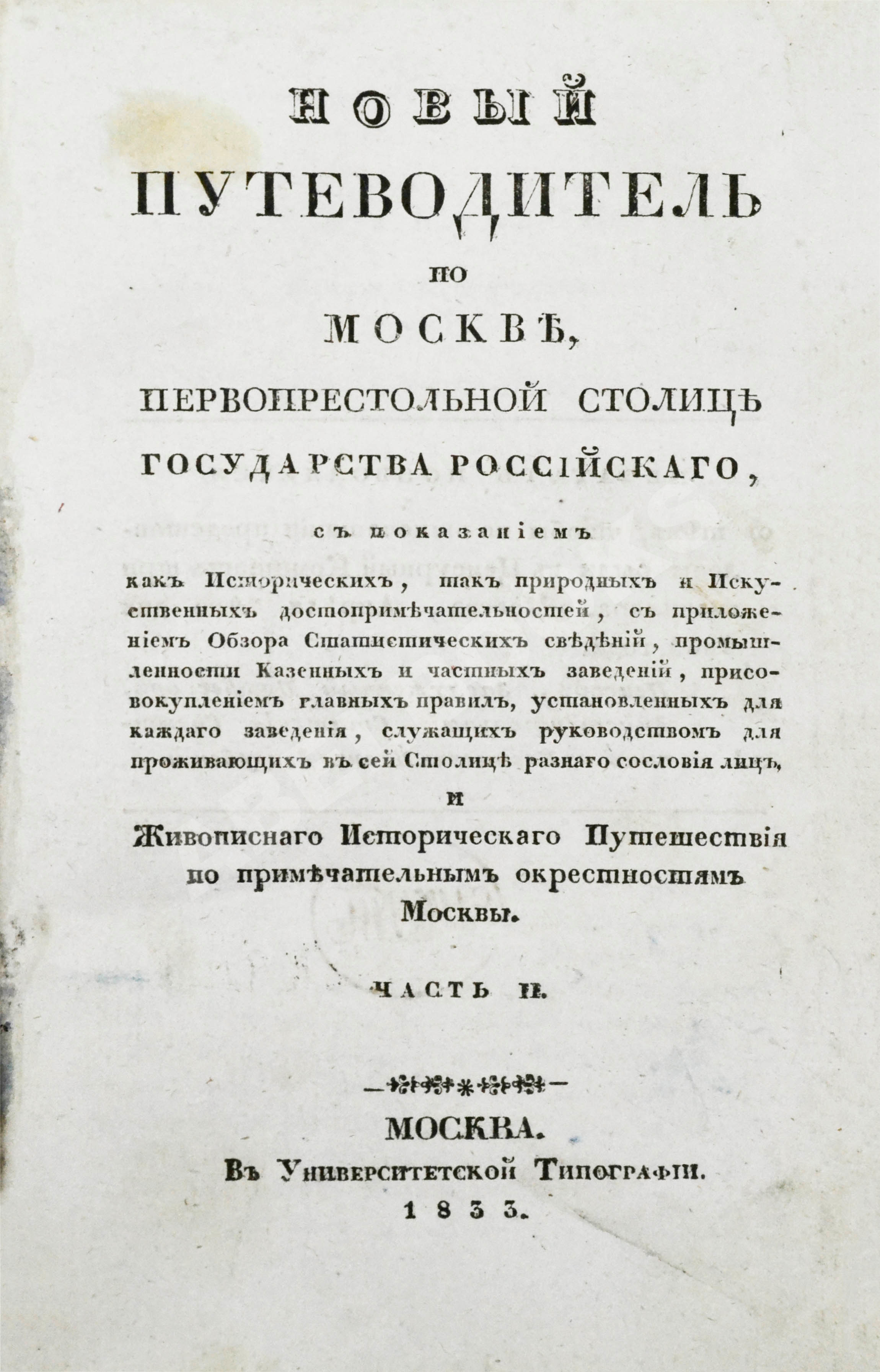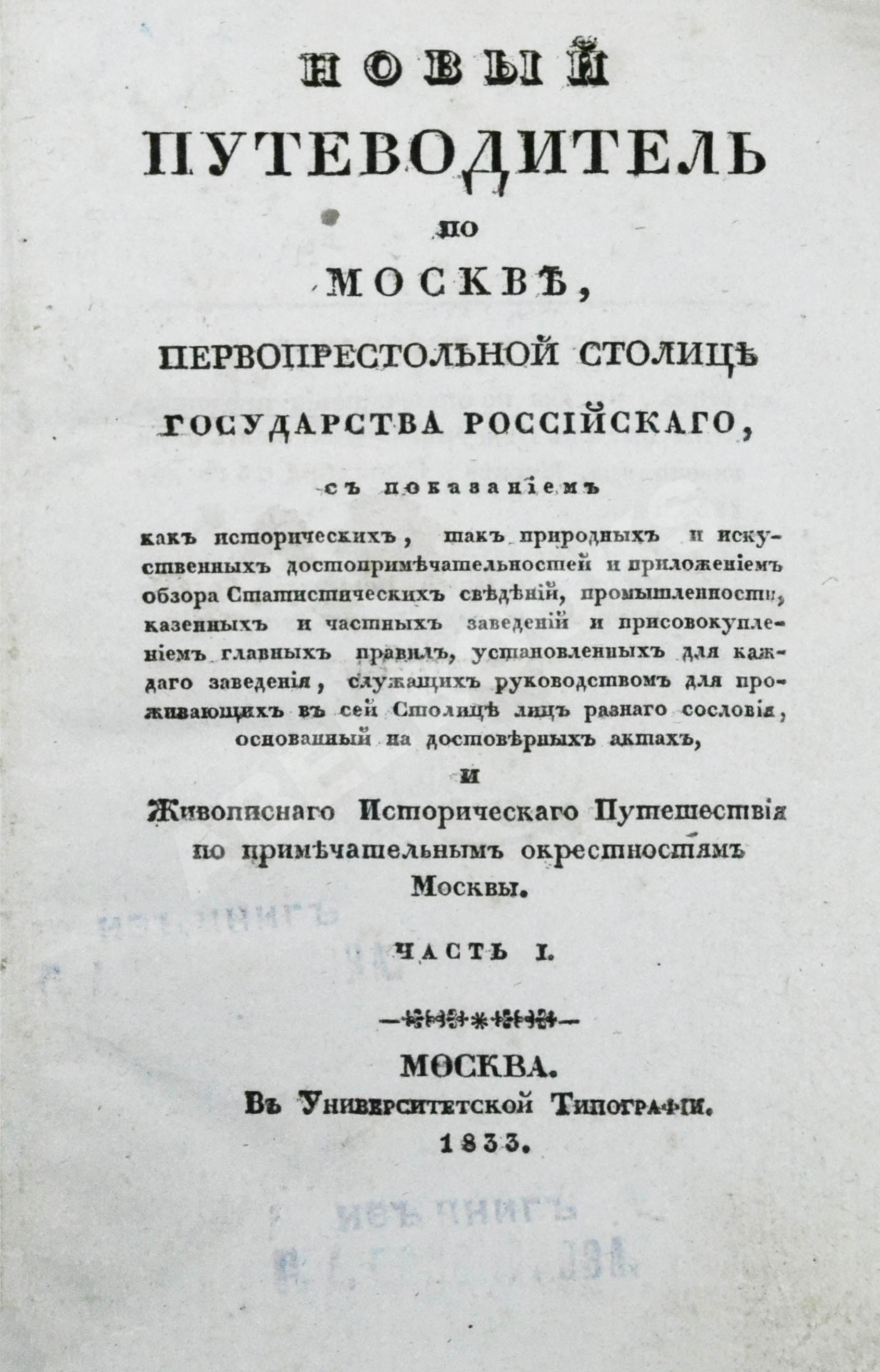 первопрестольной столице государства Российского с показанием как исторических, так природных и искусственных достопримечательностей и приложением Статистических сведений, промышленности, казённых и частных заведений и привосовокуплением главных правил, установленных для каждого заведения, служащих руководством для проживающих в сей Столице лиц разного сословия, основанный на достоверных актах, и Живописного Исторического Путешествия по примечательным окрестностям Москвы.