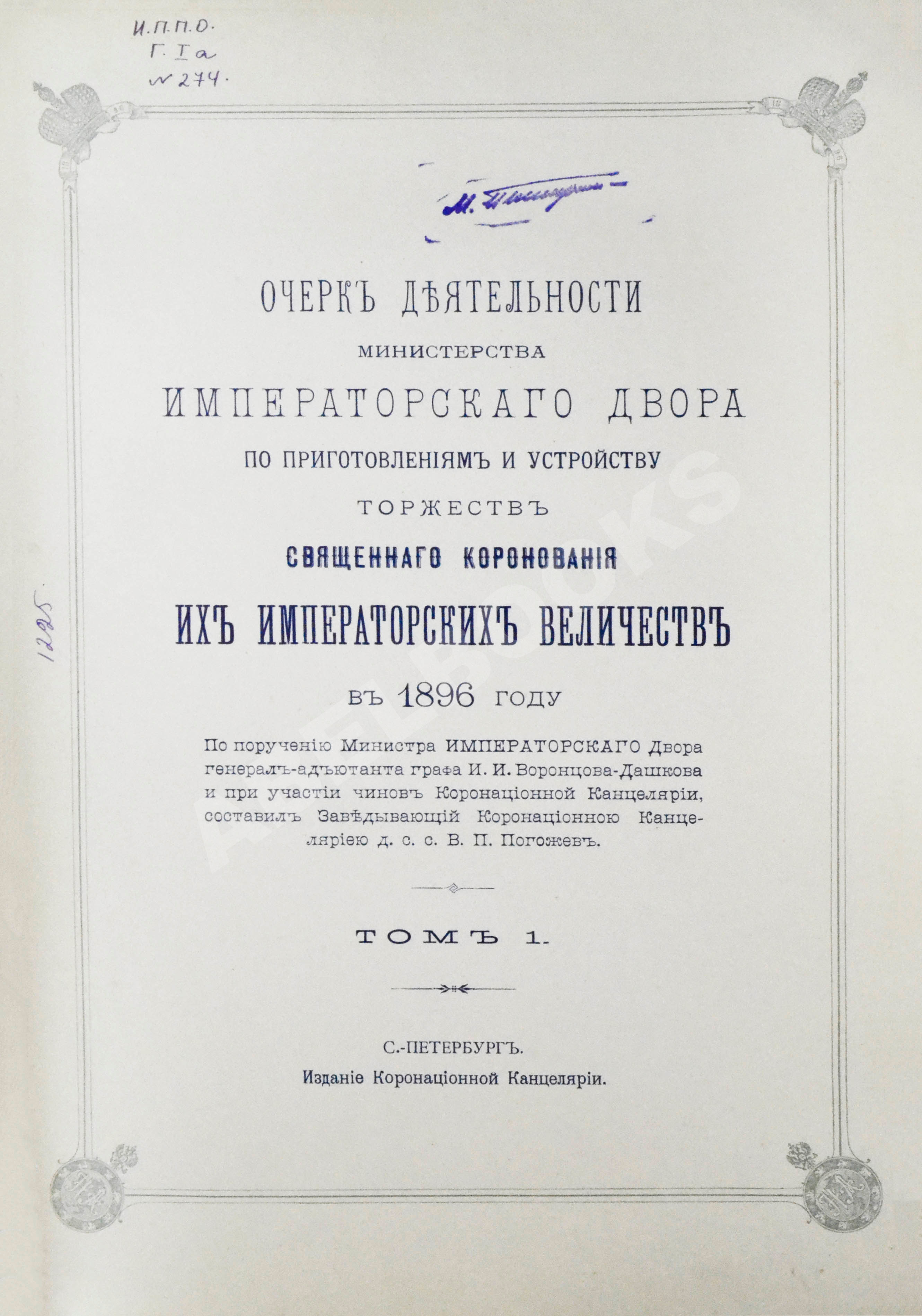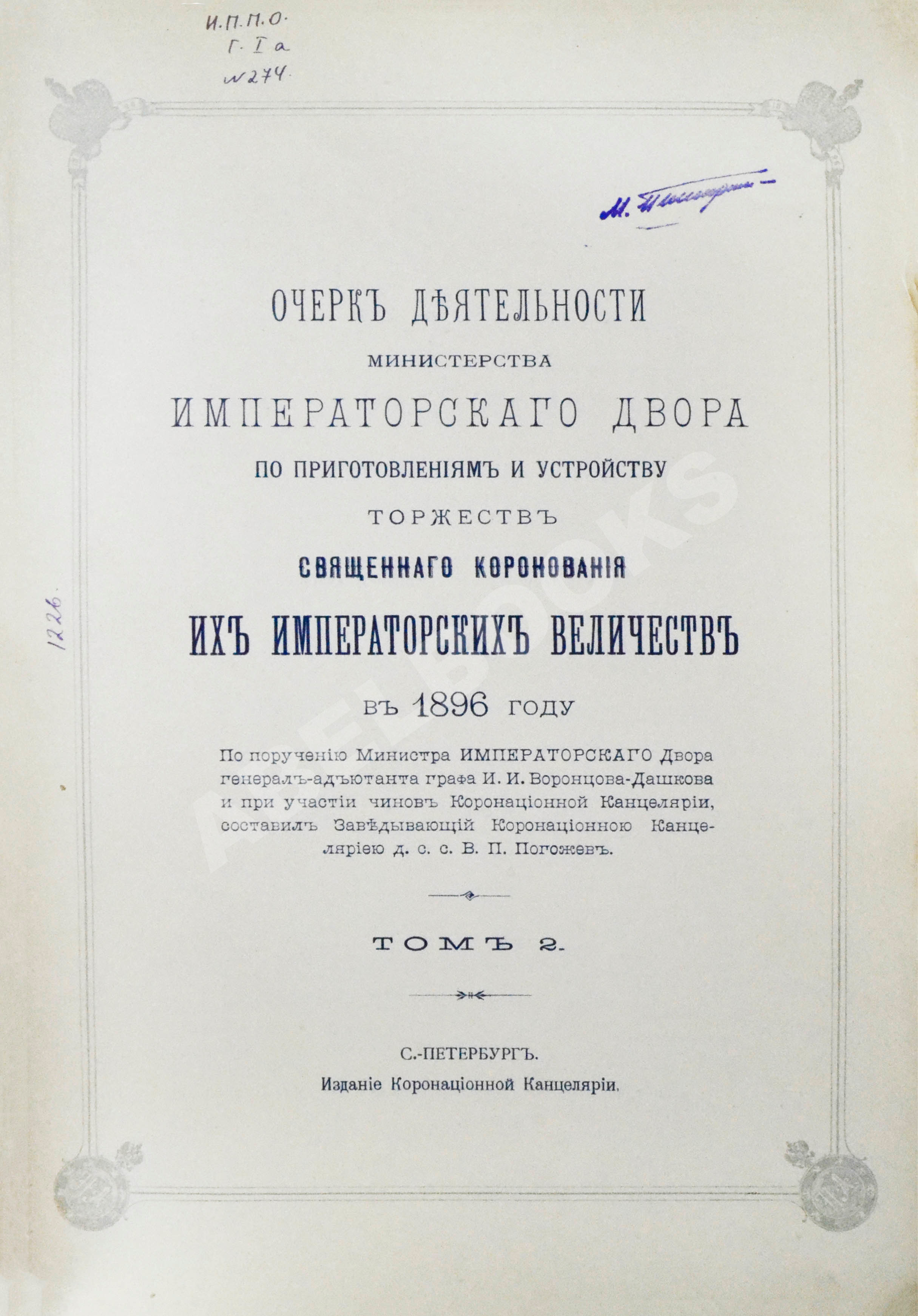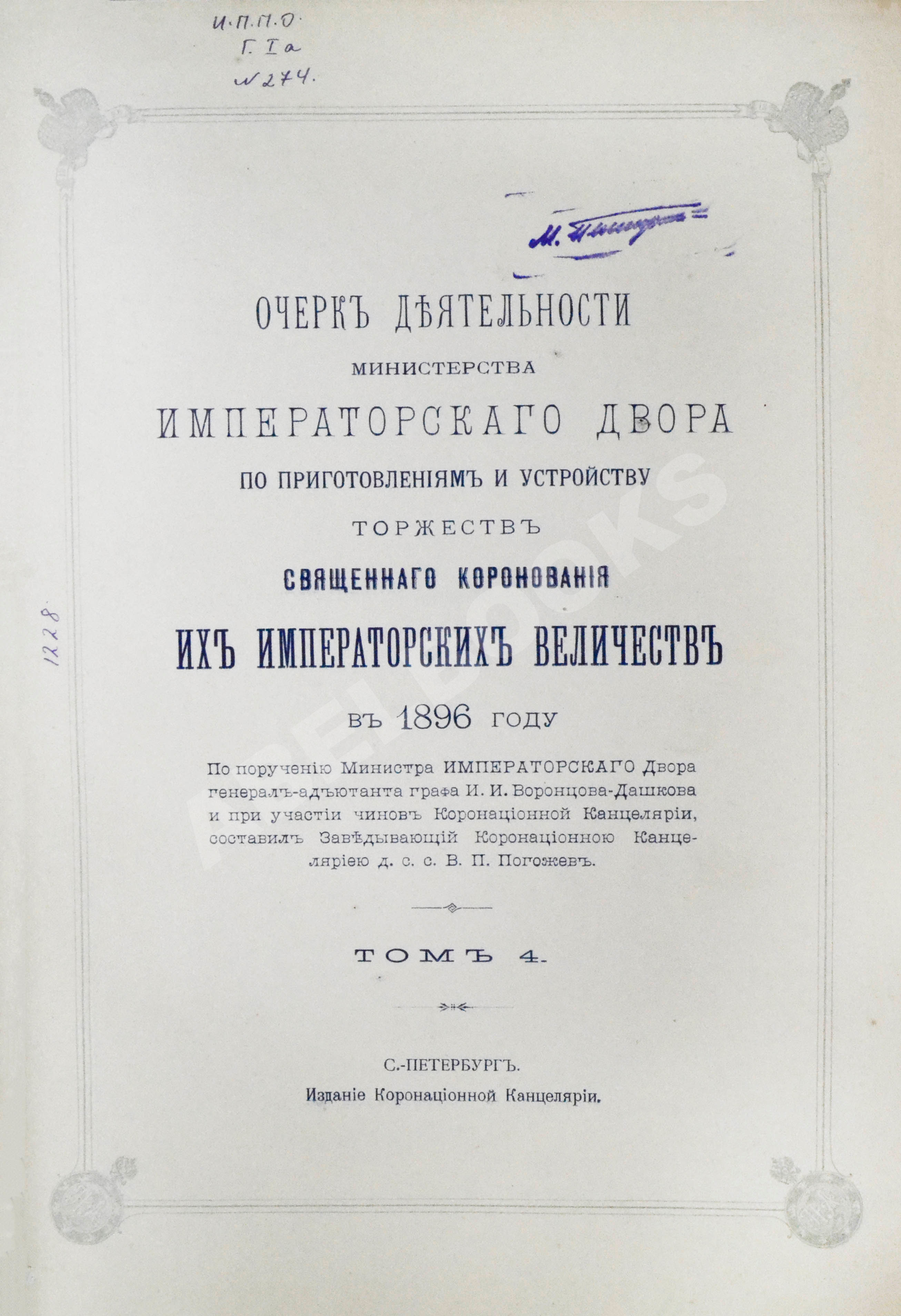 Погожев, В.П. Очерк деятельности Министерства Императорского Двора по приготовлениям и устройству торжеств Священного коронования их Императорских Величеств в 1896 году