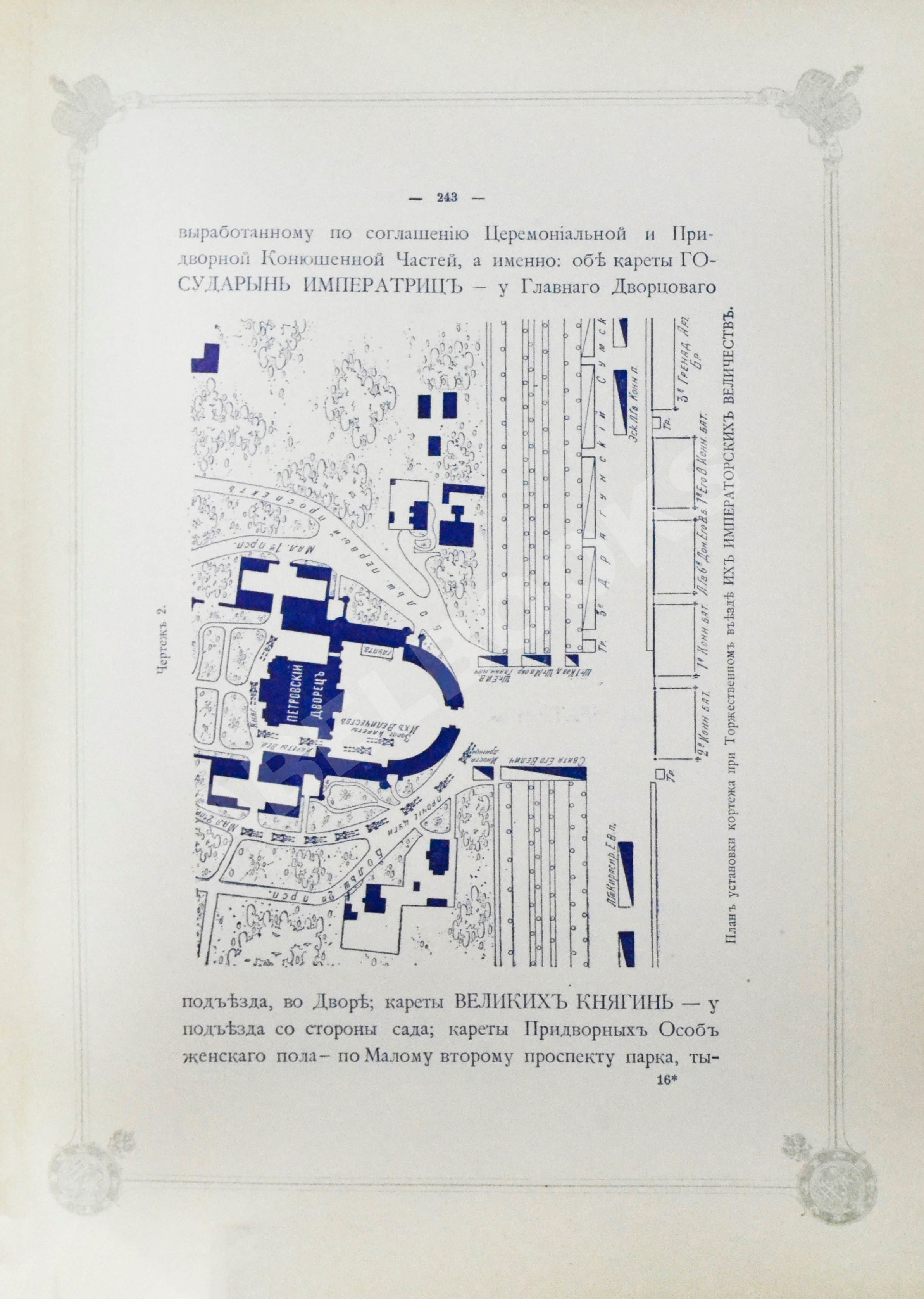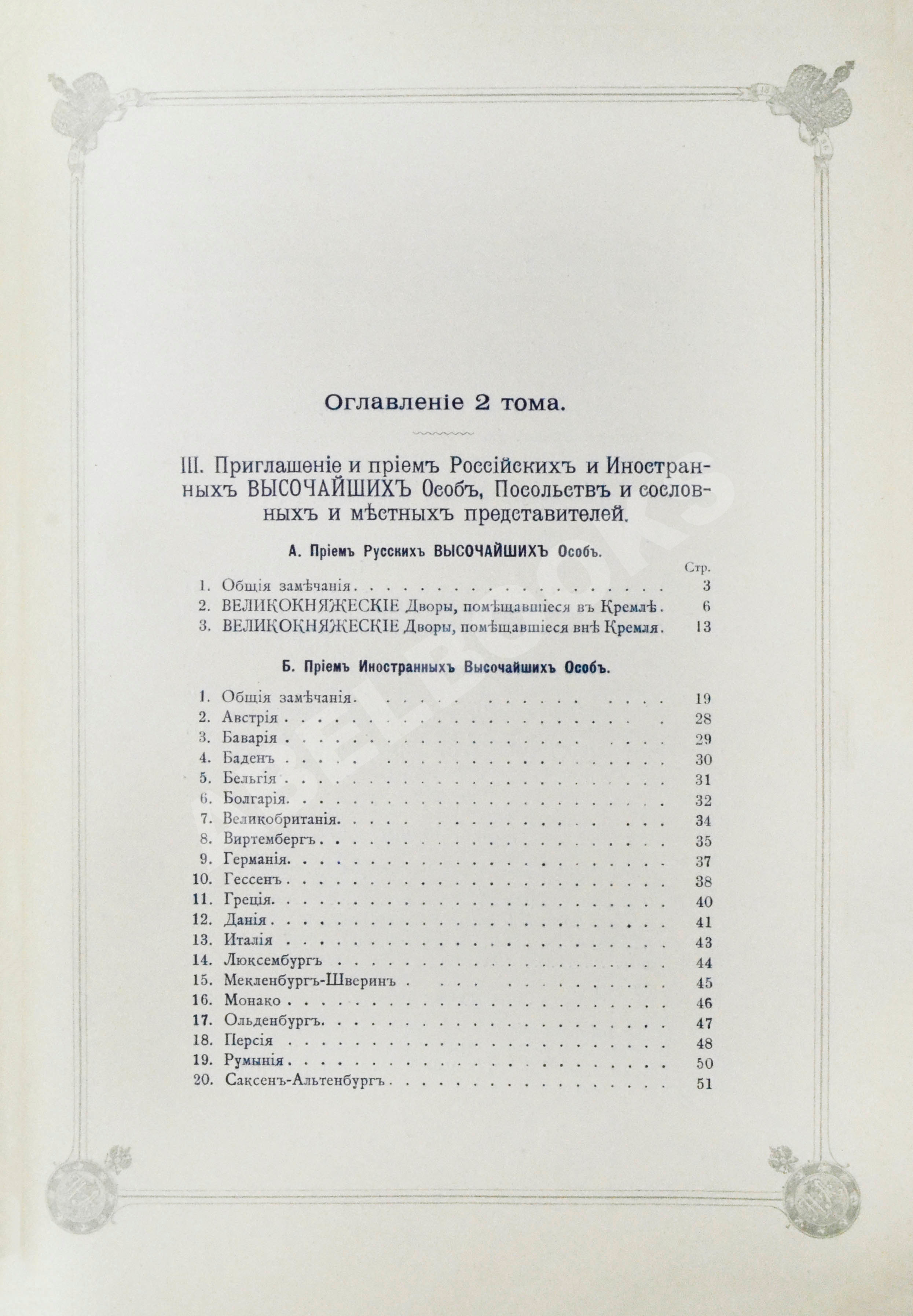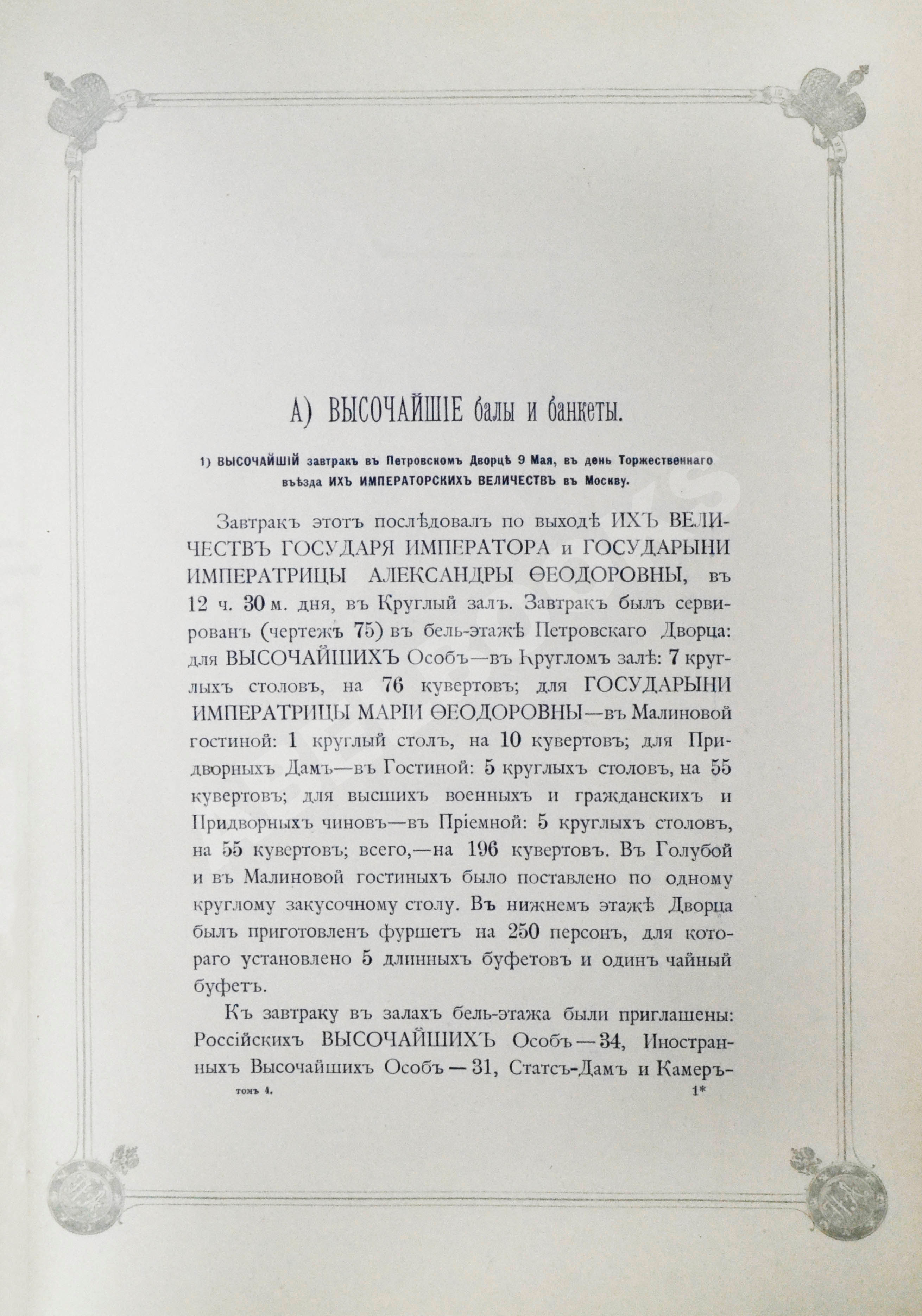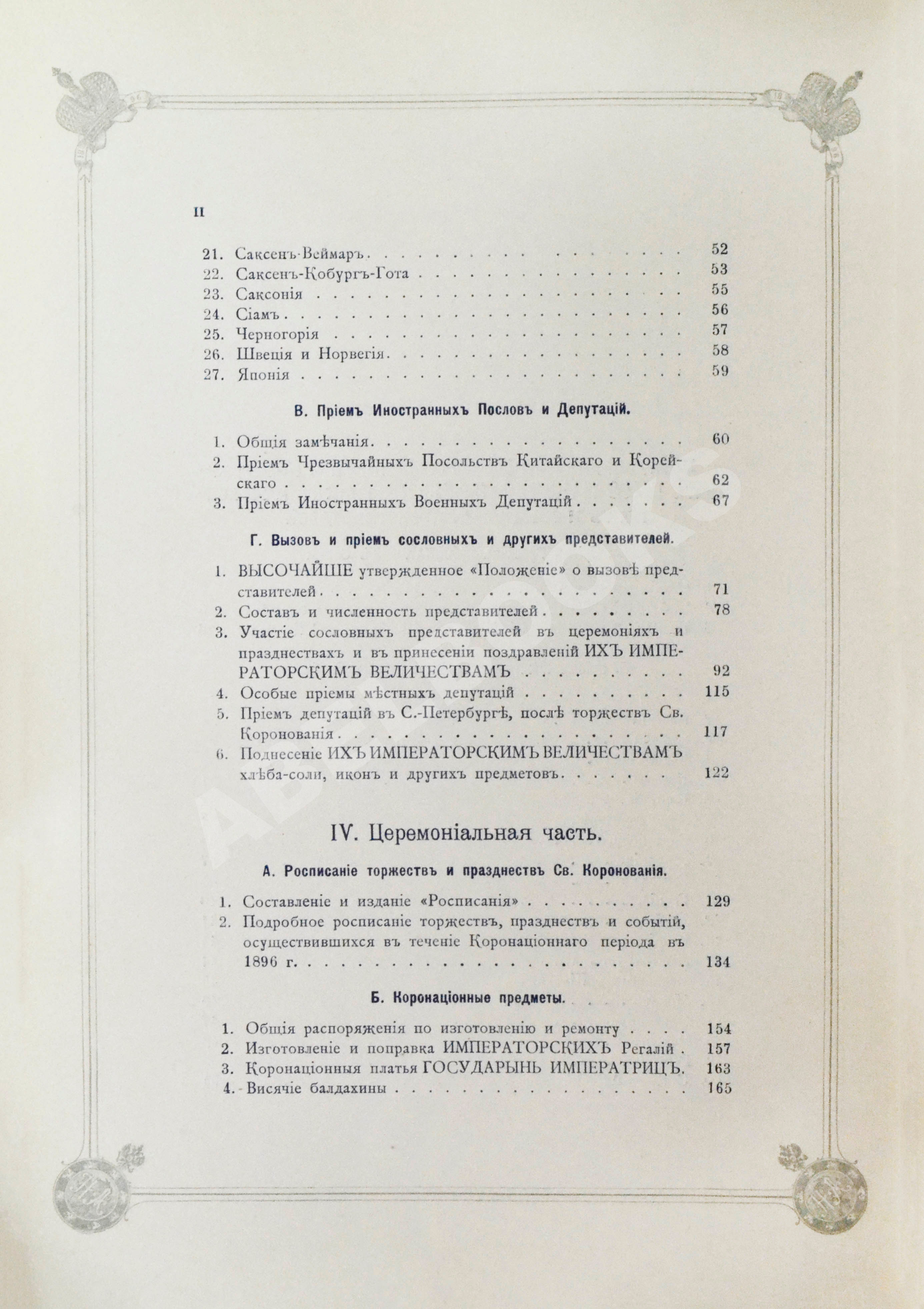 Т.2. III. Приглашение и прием российских и иностранных высочайших особ, посольств и сословных и местных представителей. IV. Церемониальная часть]. [2], 338, IV, [2] с.: табл., план., черт.