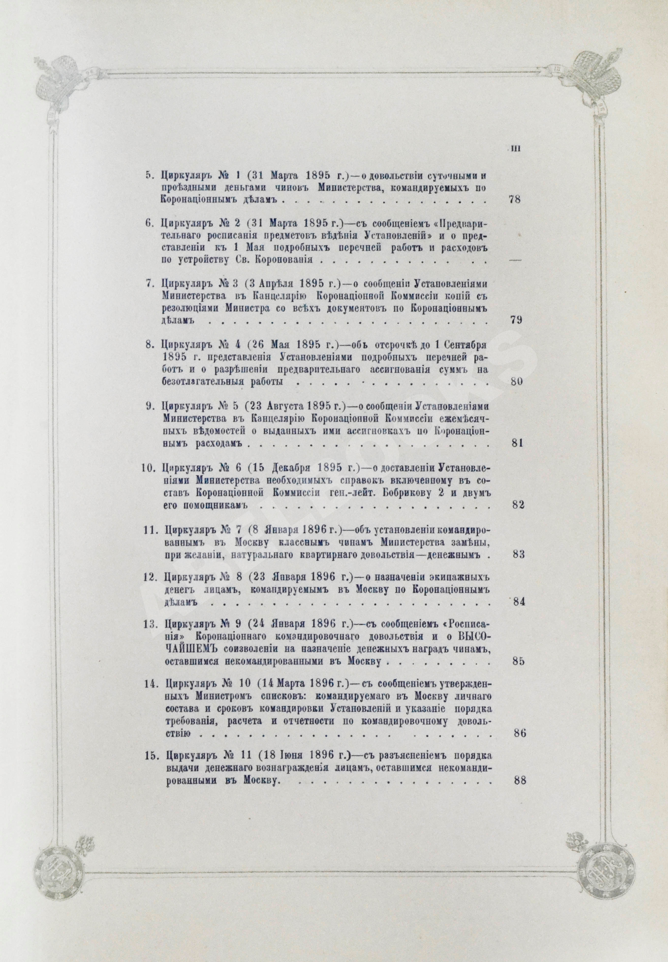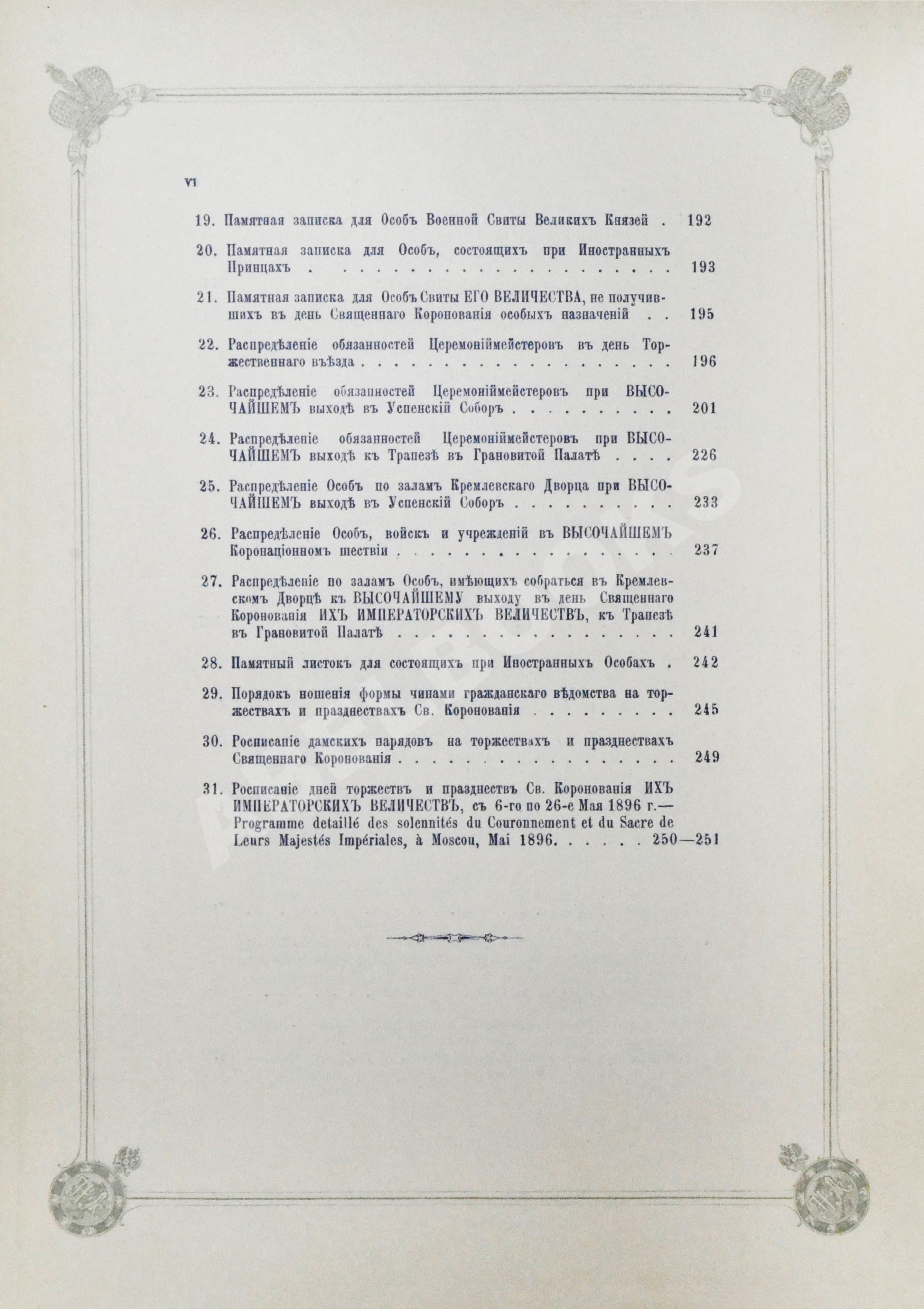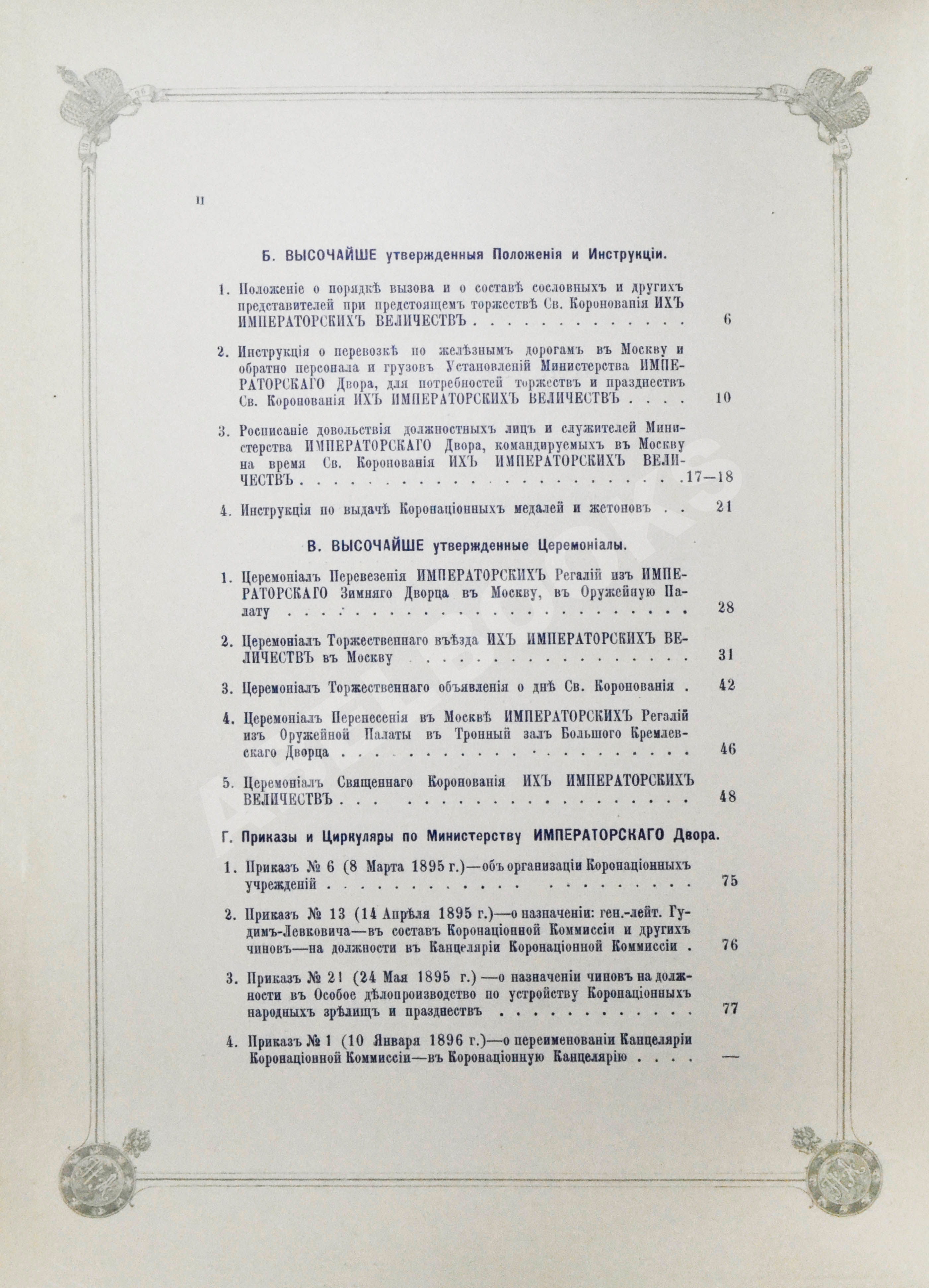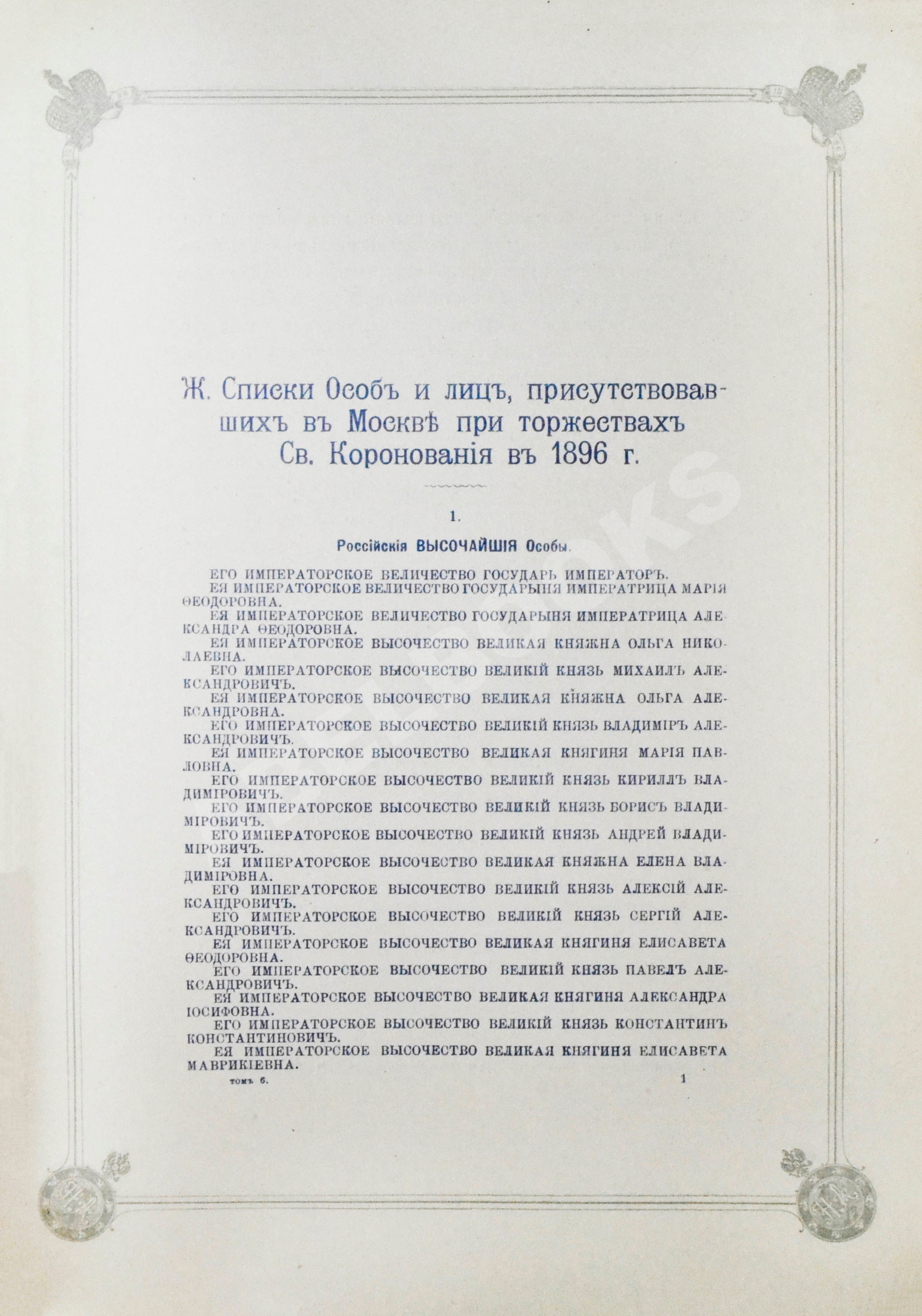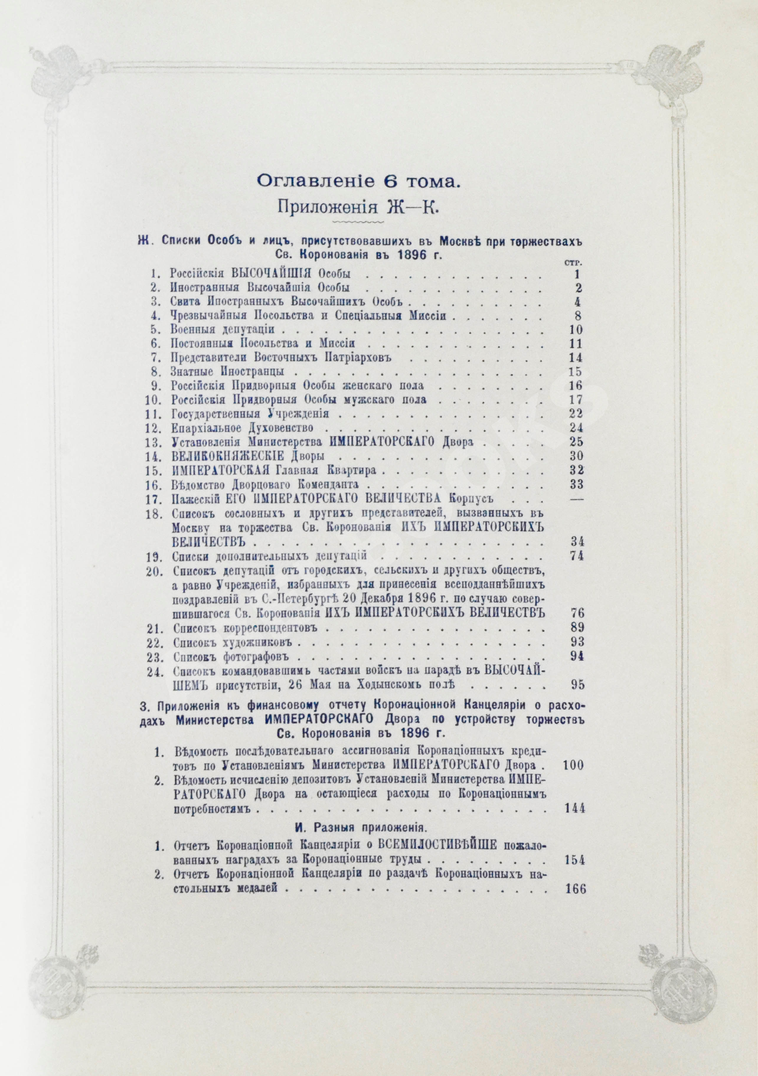 Т.6. Приложения Ж-К. Списки особ и лиц, присутствовавших в Москве при торжествах св. коронации в 1896 г. Формы и образцы документов. 378, VIII, [2] с.: 12 л.табл. 31,5х20,5 см.