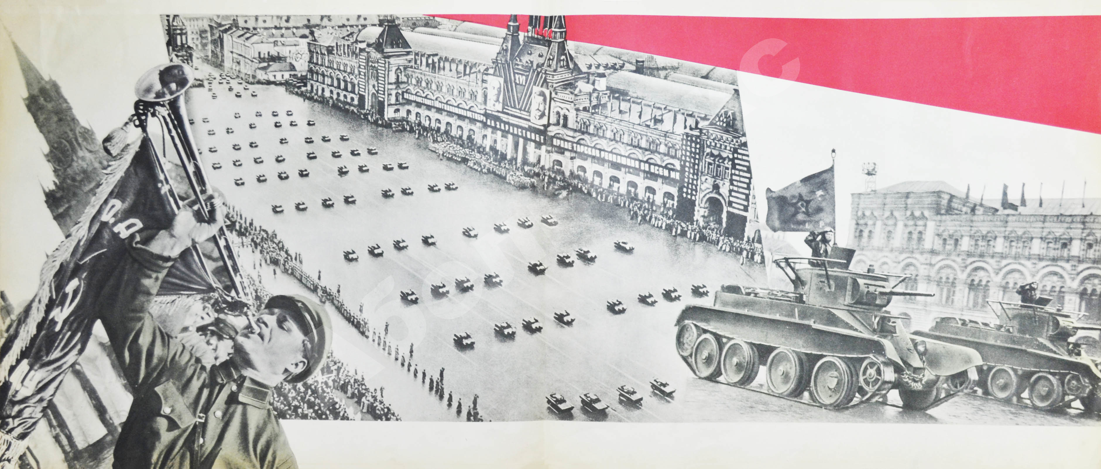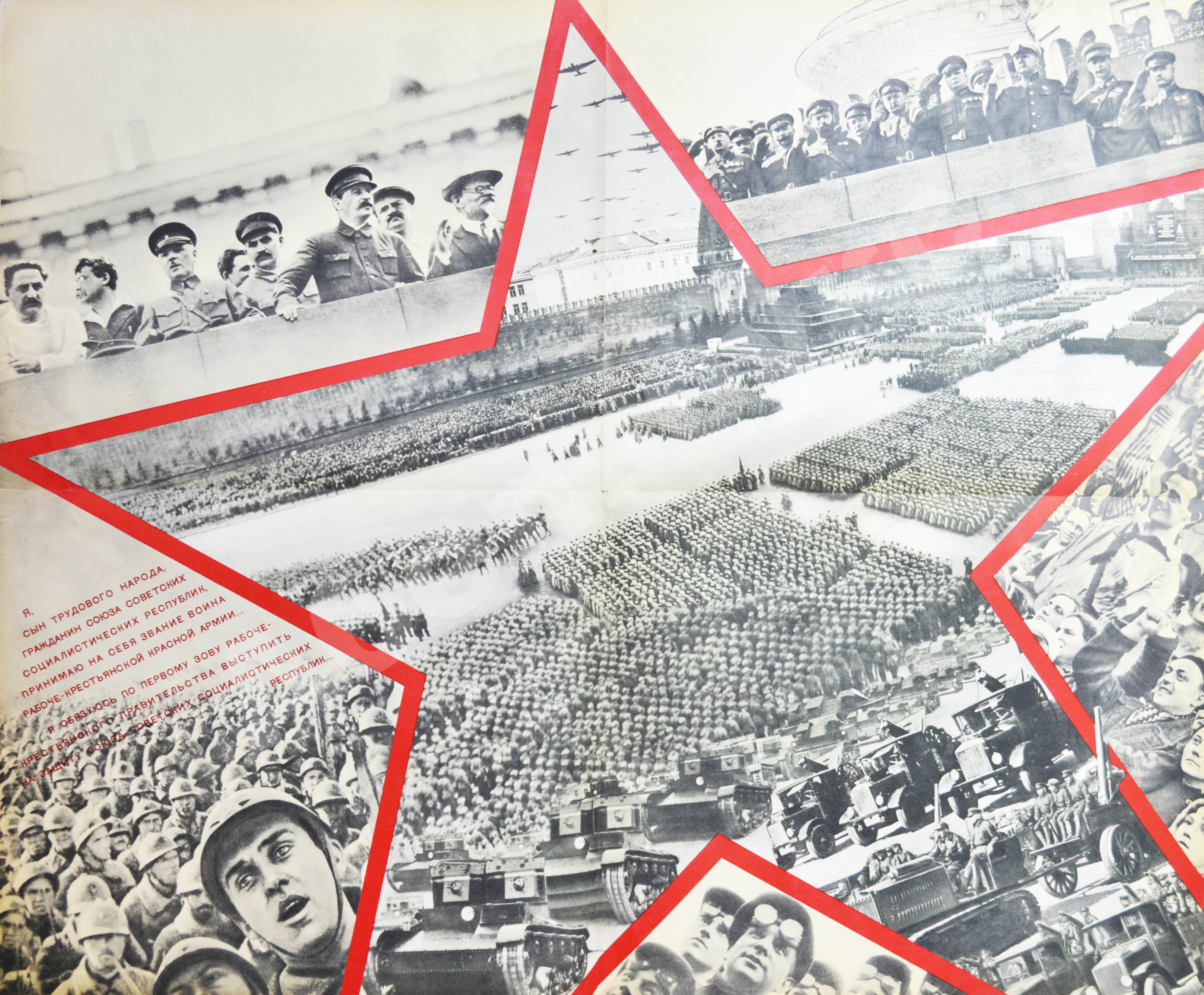 Это книга-фотохроника, и начинается она с парада на Красной площади. Коллаж, посвящённый главному событию страны, занимает огромный сложенный вчетверо лист. В центре – пятиконечная звезда, обрамляющая фотографию руководителей государства на трибуне мавзолея. Оставшееся пространство заполняют кадры военных парадов.