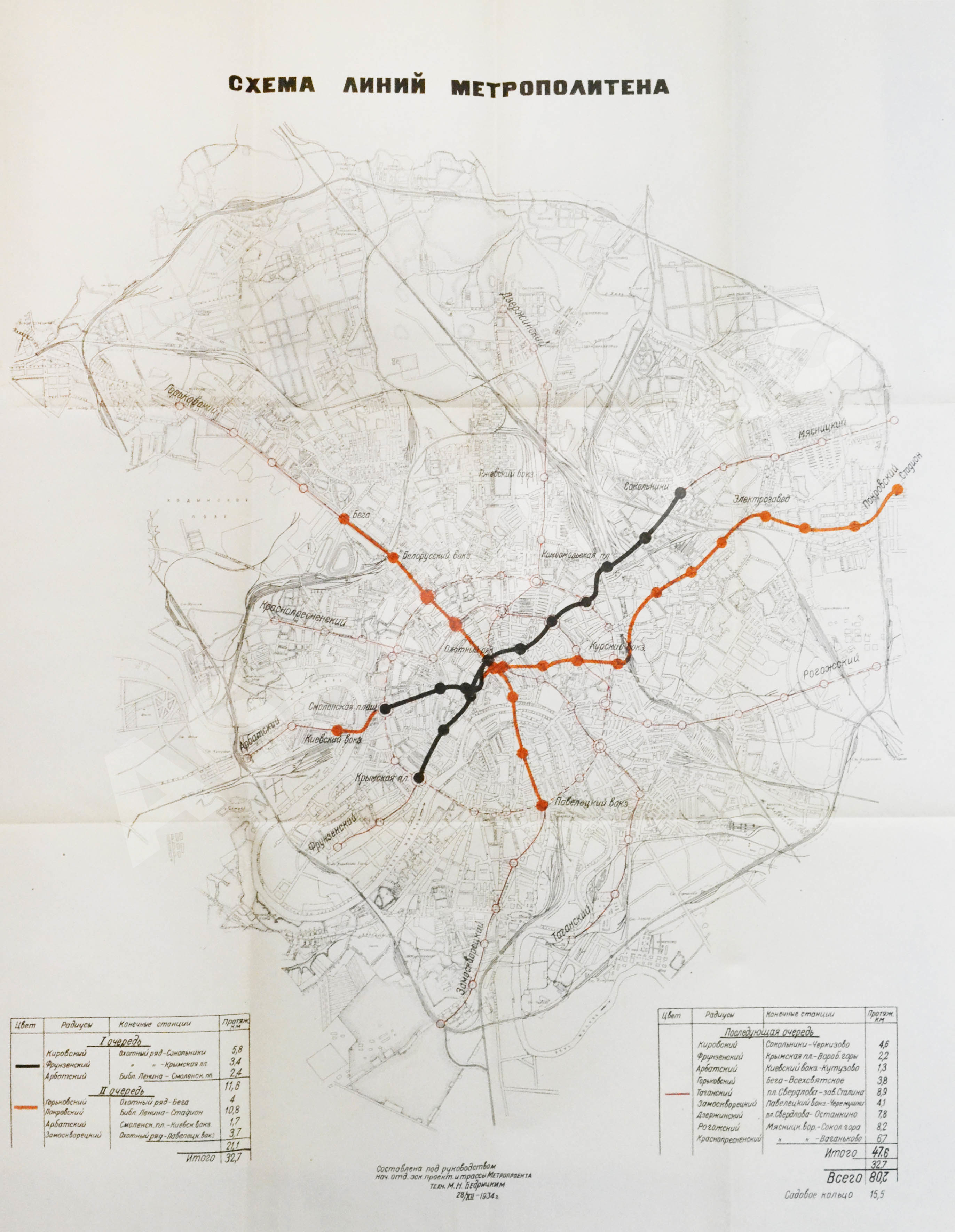 Запуск первой очереди московского метро состоялся 15 мая 1935 года. Это был участок от «Сокольников» до «Парка культуры» с ответвлением от «Охотного ряда» до «Смоленской» общей протяженностью 11,2 километра. 90% работы было выполнено в рекордные сроки в 1934 году.