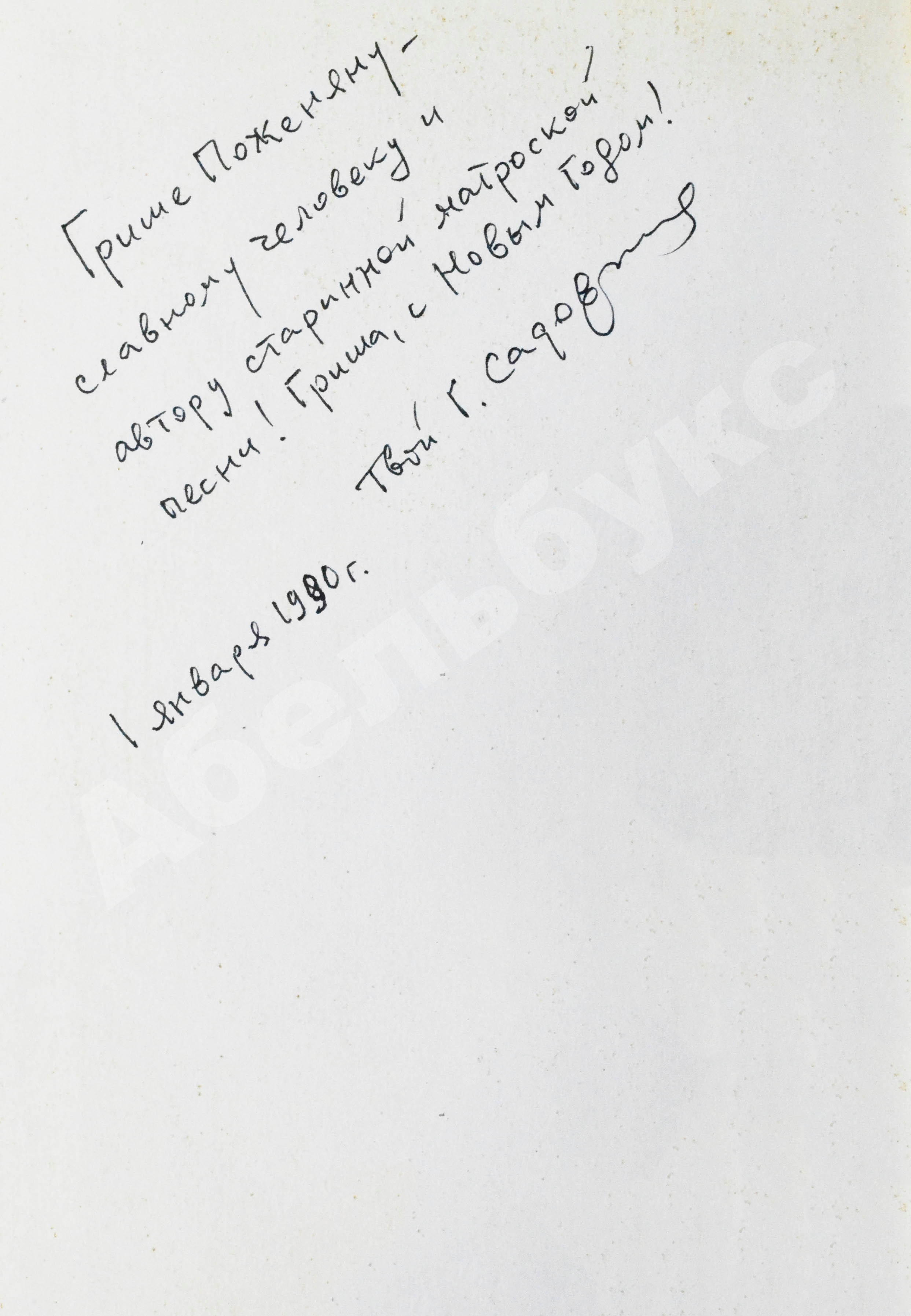 На обороте свободного листа форзаца автограф Георгия Садовникова Григорию Поженяну: «Грише Поженяну — славному человеку и автору старинной матроской песни! Гриша, с Новым Годом! Твой Г. Садовников 1 января 1990 г.».