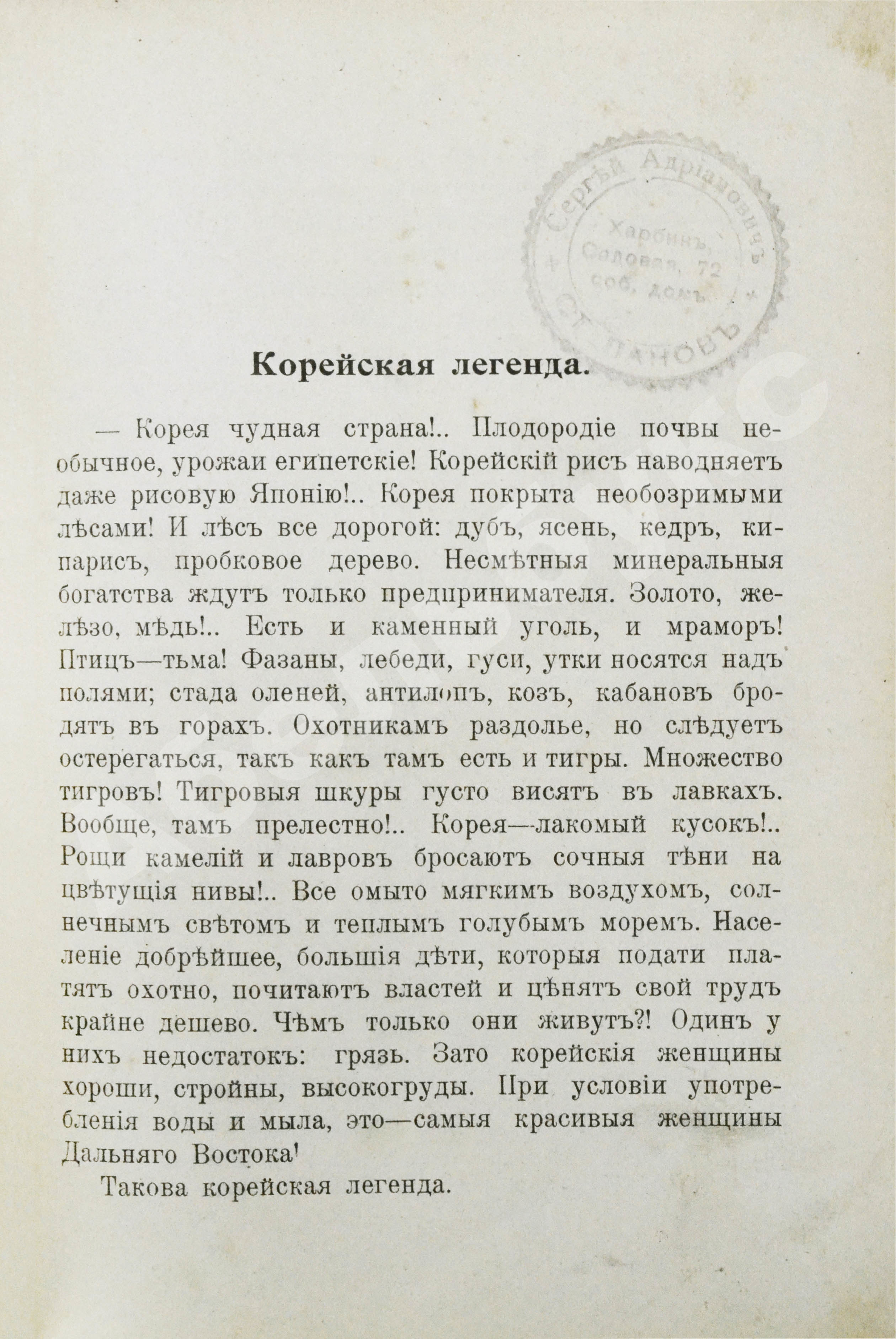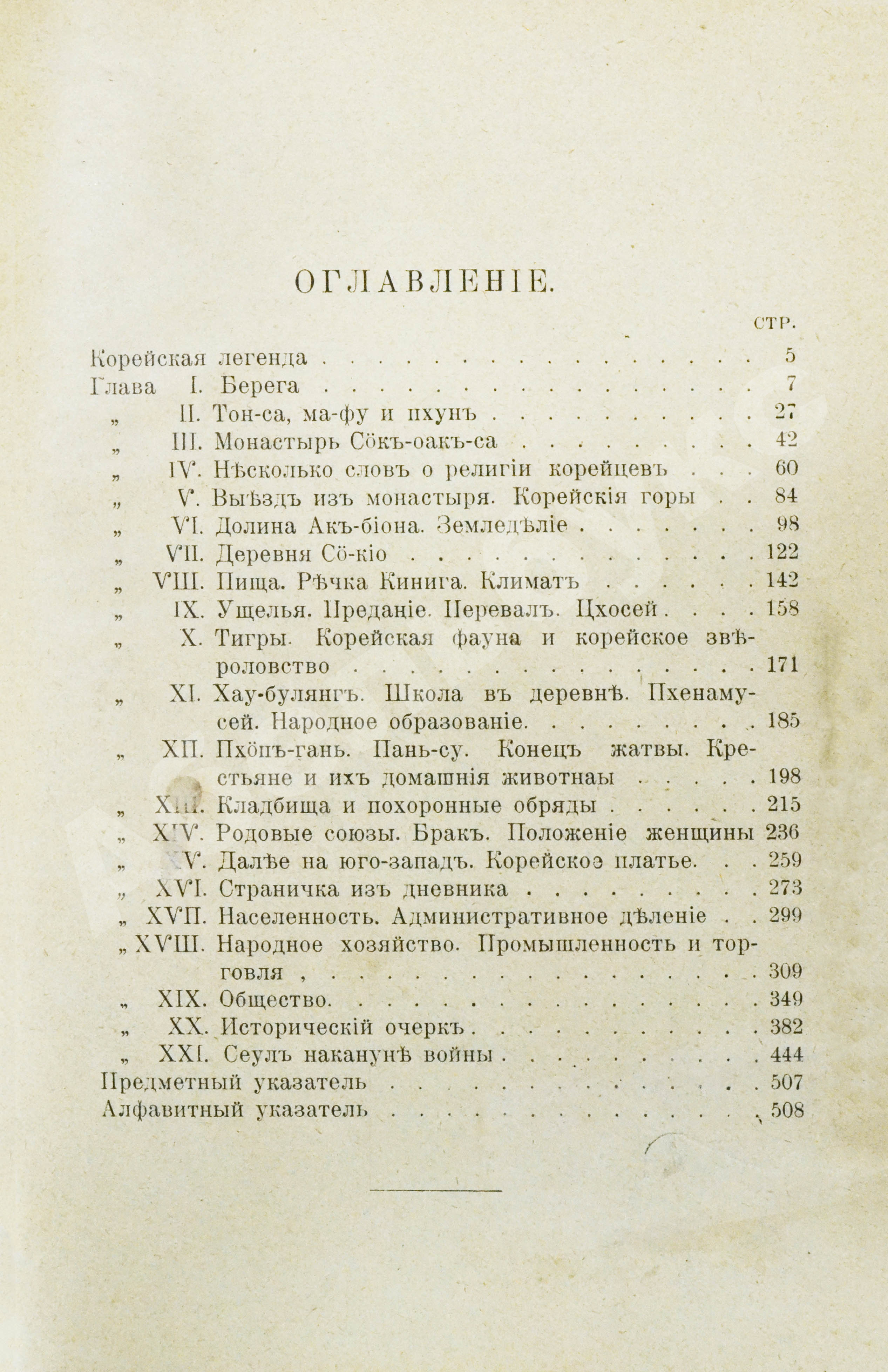 Второе, дополненное издание книги Вацлава Серошевского, польского политического ссыльного, ставшего писателем и учёным. Очерки написаны по результатам путешествия, состоявшегося в 1903 году, накануне русско-японской войны. Большинство русских изданий рубежа XIX–ХХ вв., посвящённых Корее, содержат официальные отчёты экспедиций. Эта книга, одна из немногих, представляет собой изложенные художественным языком путевые заметки, где обрисованы не только общие вопросы, но и отражены личные впечатления европейца о поездке по малоизвестной стране. Большинству обывателей Корея представлялась эдаким «лакомым куском», где живут «самые красивые женщины Дальнего Востока» и «всё омыто мягким воздухом, солнечным светом и тёплым голубым морем». Такова была «корейская легенда», и Вацлав Серошевский вознамерился составить собственное представление о Стране утреннего спокойствия.