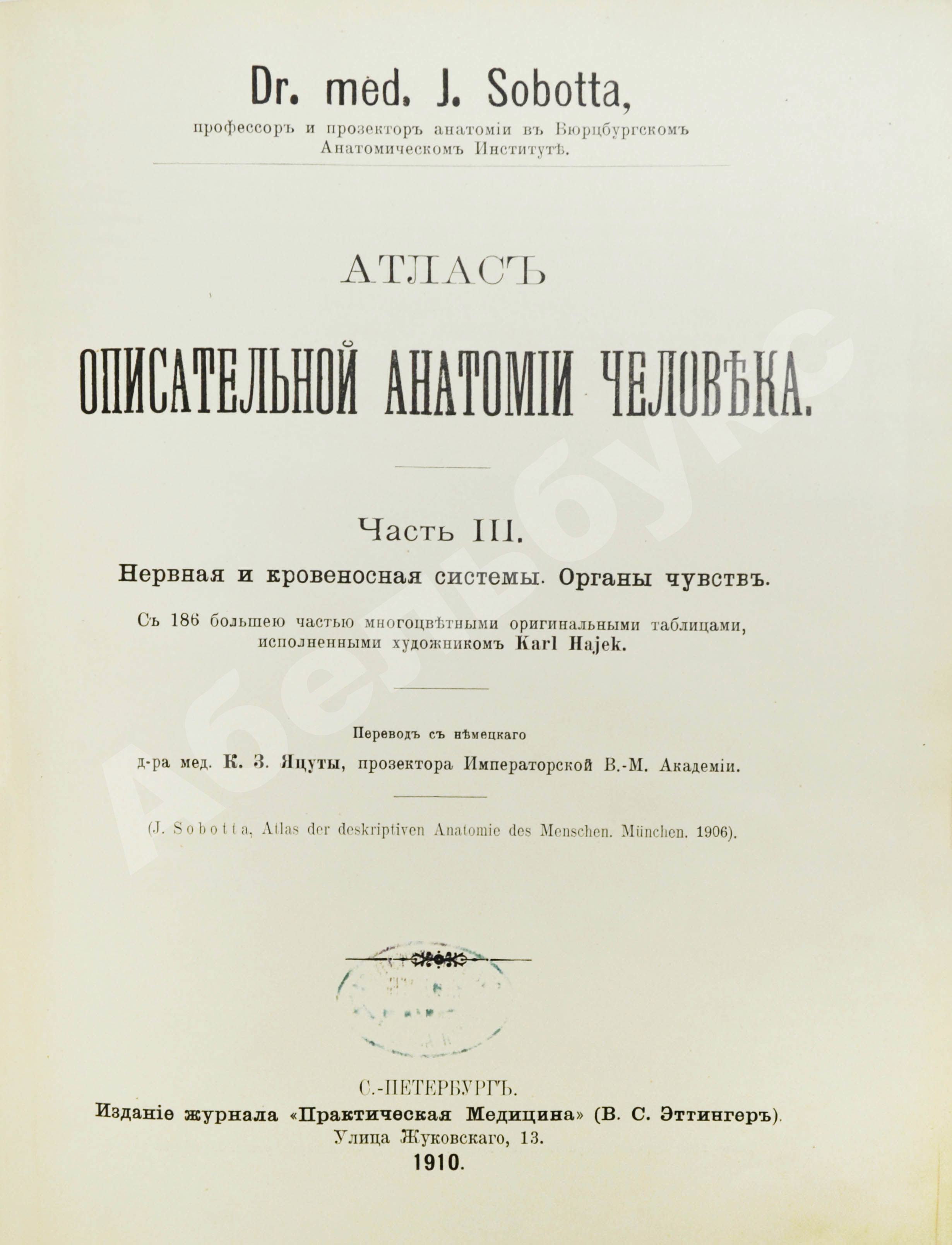 Публикацией атласа занималось издательство «Практическая медицина», созданное Василием Сергеевичем Эттингером. С 1885 по 1928 гг. издательство выпускало одноименный журнал, каждый экземпляр представлял которого собой медицинскую монографию по определённому вопросу. Помимо «Практической медицины» в издательстве выходили журналы «Русская хирургия», «Терапия», «Медицинский календарь», «Ветеринарный календарь», многотомная «Реальная энциклопедия медицинских наук», а также различные медицинские атласы, в том числе и с многочисленными цветными иллюстрация, как «Атлас описательной анатомии человека» Соботты. Многоцветные оригинальные таблицы были исполнены специально для этого атласа известным научным иллюстратором Карлом Хайеком (Karl Hajek).