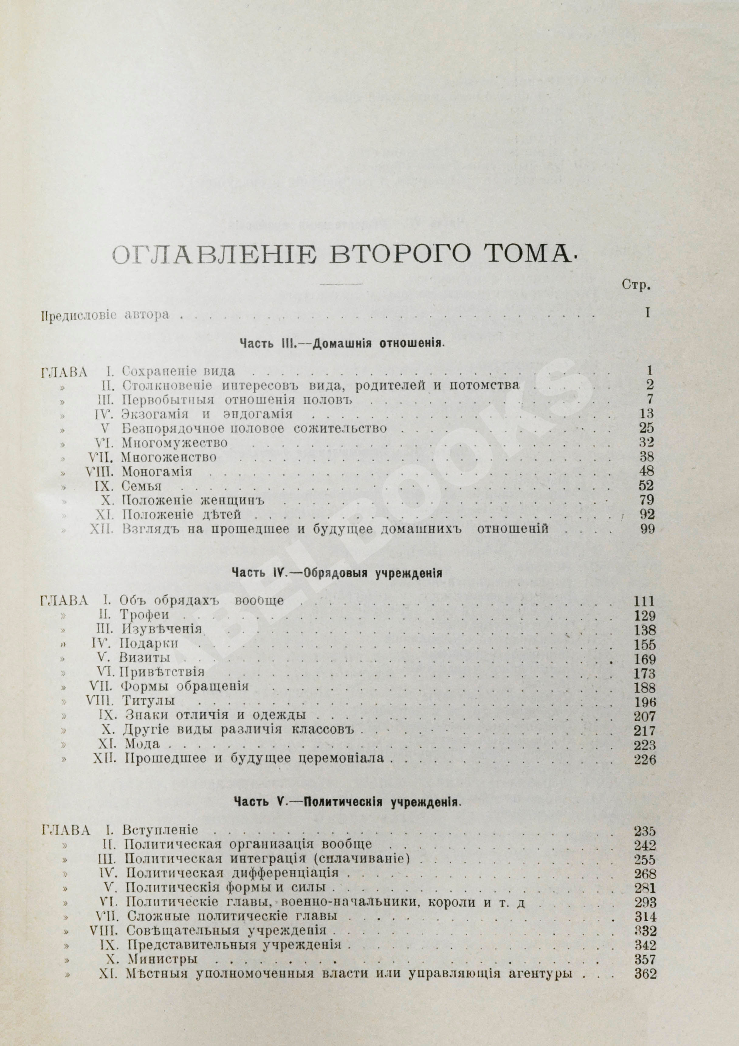 Т.2. Часть III. Домашние отношения. Часть IV. Обрядовые учреждения. Часть V. Политические учреждения. Часть VII. Общественные профессии. Часть VIII. Промышленные учреждения. II, IV, 707 с. 23х17,5 см.