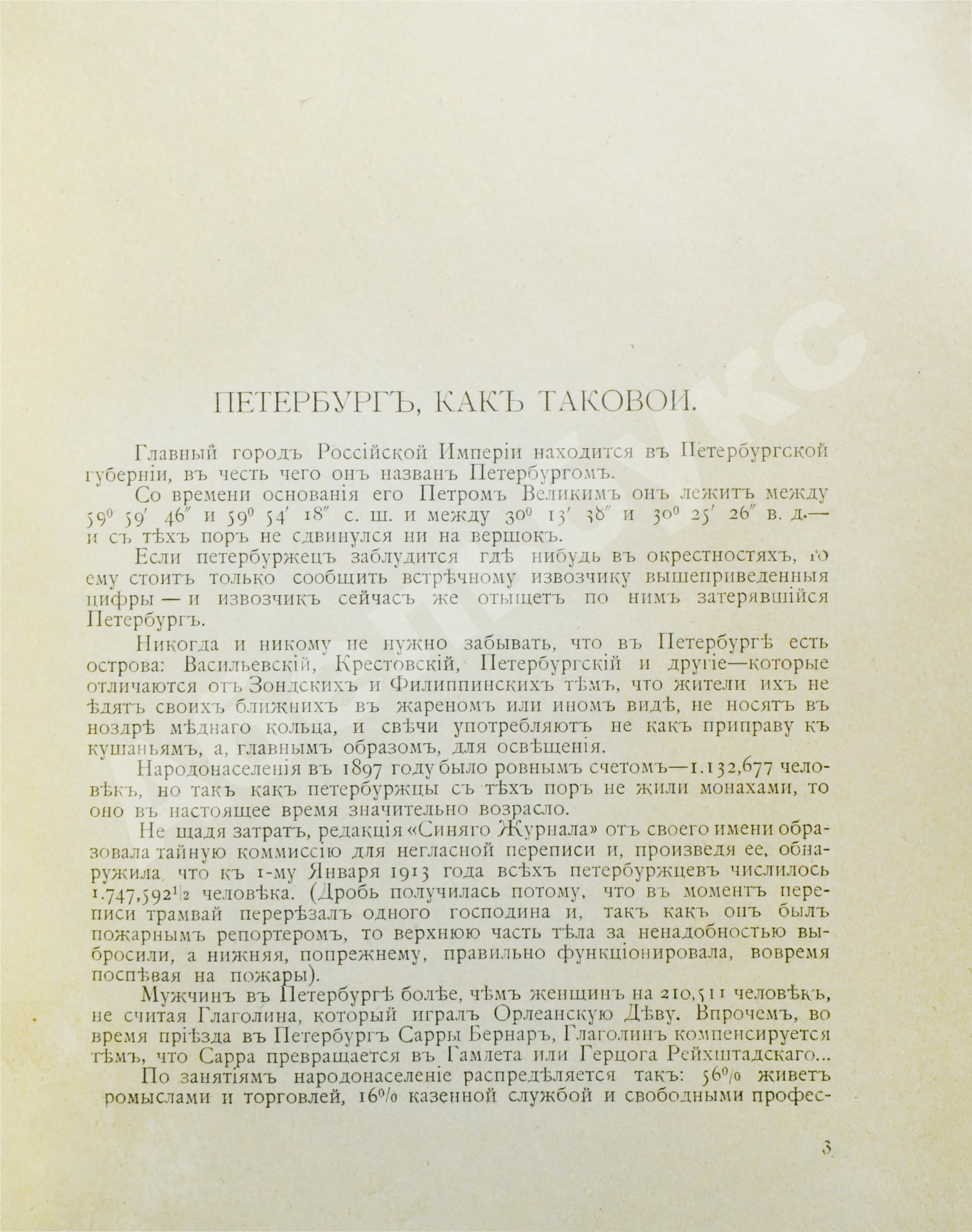 В юмористических очерках описана история основания Петербурга, Городская Дума города, Невские проспект и Летний сад, петербургские журналы и газеты, столичные писатели и журналисты, театры, трамваи, знаменитые ресторан «Вена» и кафе Андреева, азартные заведения.
