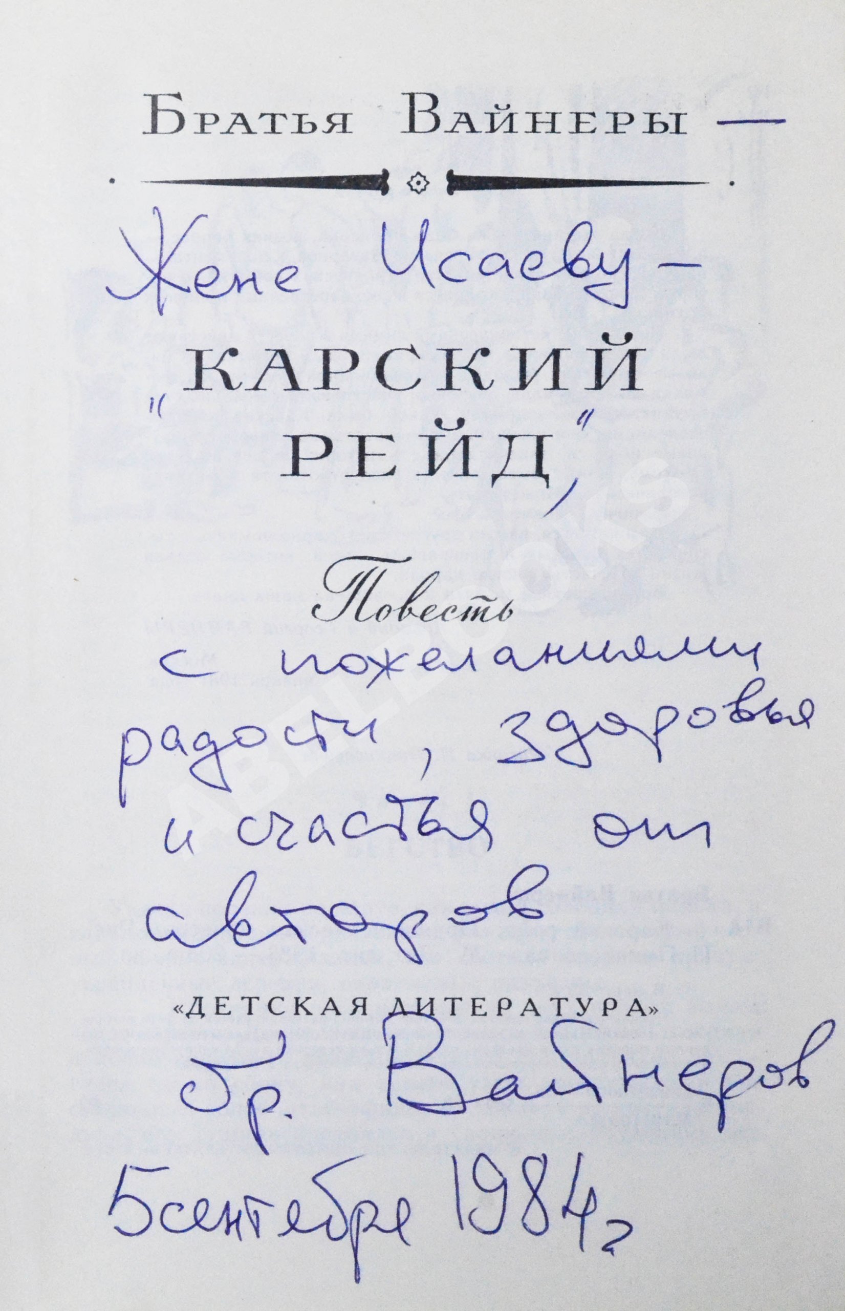 На титульном листе автограф братьев Вайнеров рукой Георгия Вайнера: «Жене Исаеву — «Карский рейд», с пожеланиями радости, здоровья и счастья от авторов бр. Вайнеров 5 сентября 1984 г.».